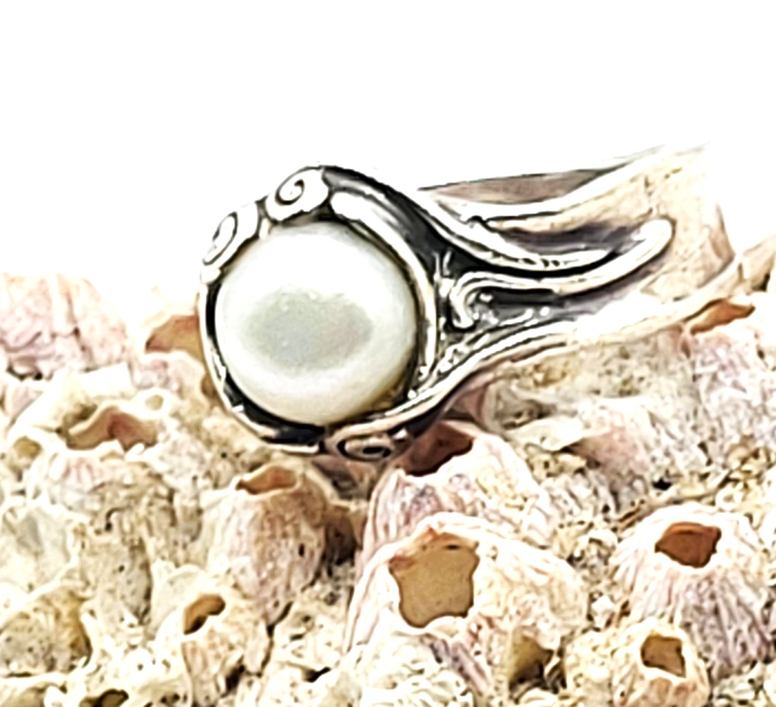 Hagit Gorali is an Israeli jewelry designer known for her sculptural and organic designs in sterling silver and gold. She draws inspiration from nature. "She has gained a devoted following, because of the high quality design and craftsmanship of her silver designer jewelry, which is handmade in Israel." This type of brutalist ring is just as trendy today, as it was in the mid-1900’s. even though this ring is from the early 2000’s! It features an approximate 7.75mm mabe’* pearl cradled in a nest of sterling silver vines and tendrils that snake down the slightly concave shoulders, that gradually taper into an asymmetrical shank, narrowing to approximately 3.5mm. This ring can be size by a professional jeweler.**. 6.4 grams Admin: 33122/10a