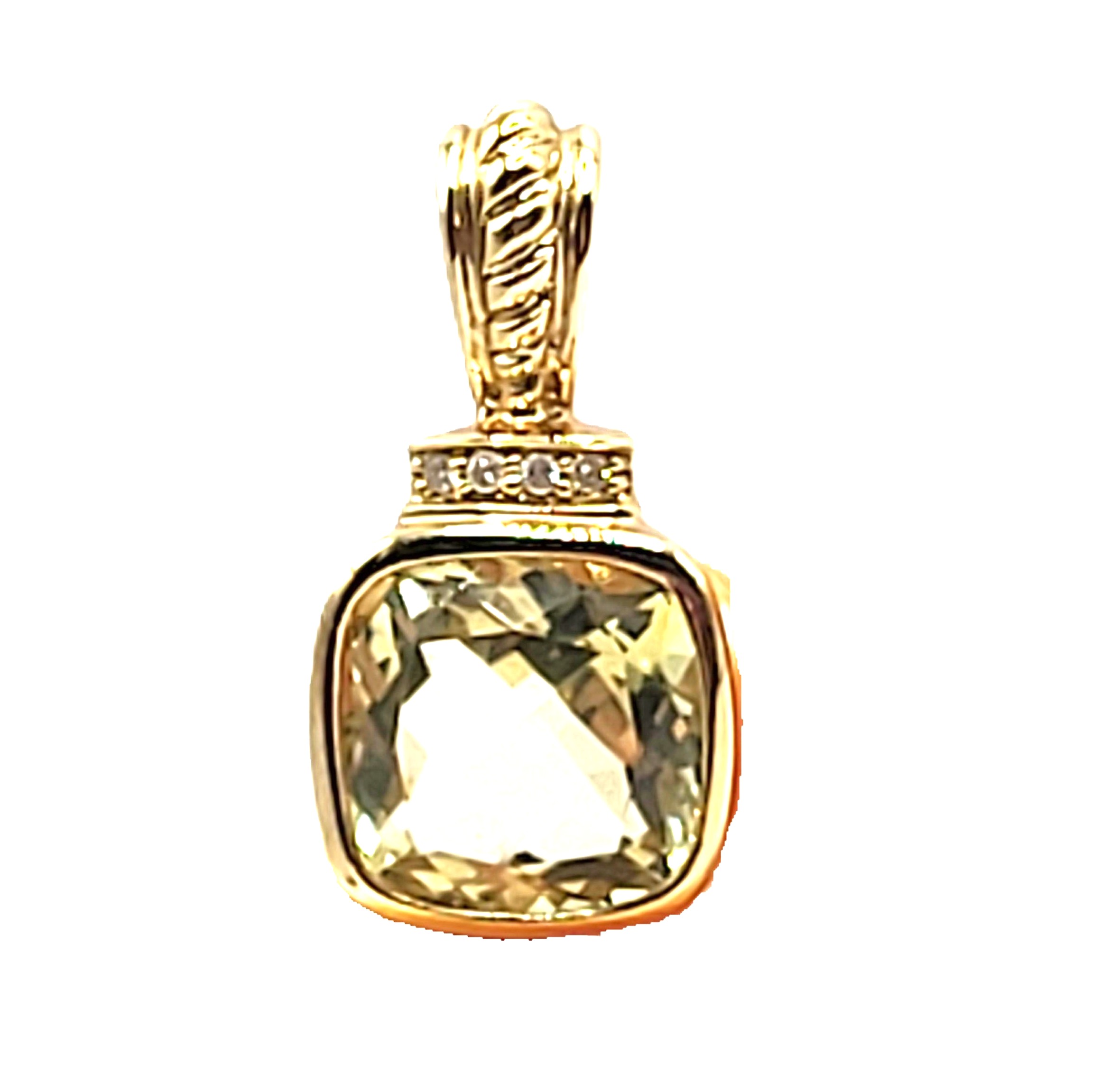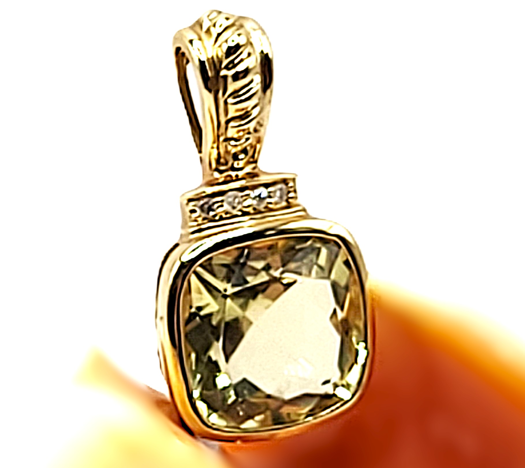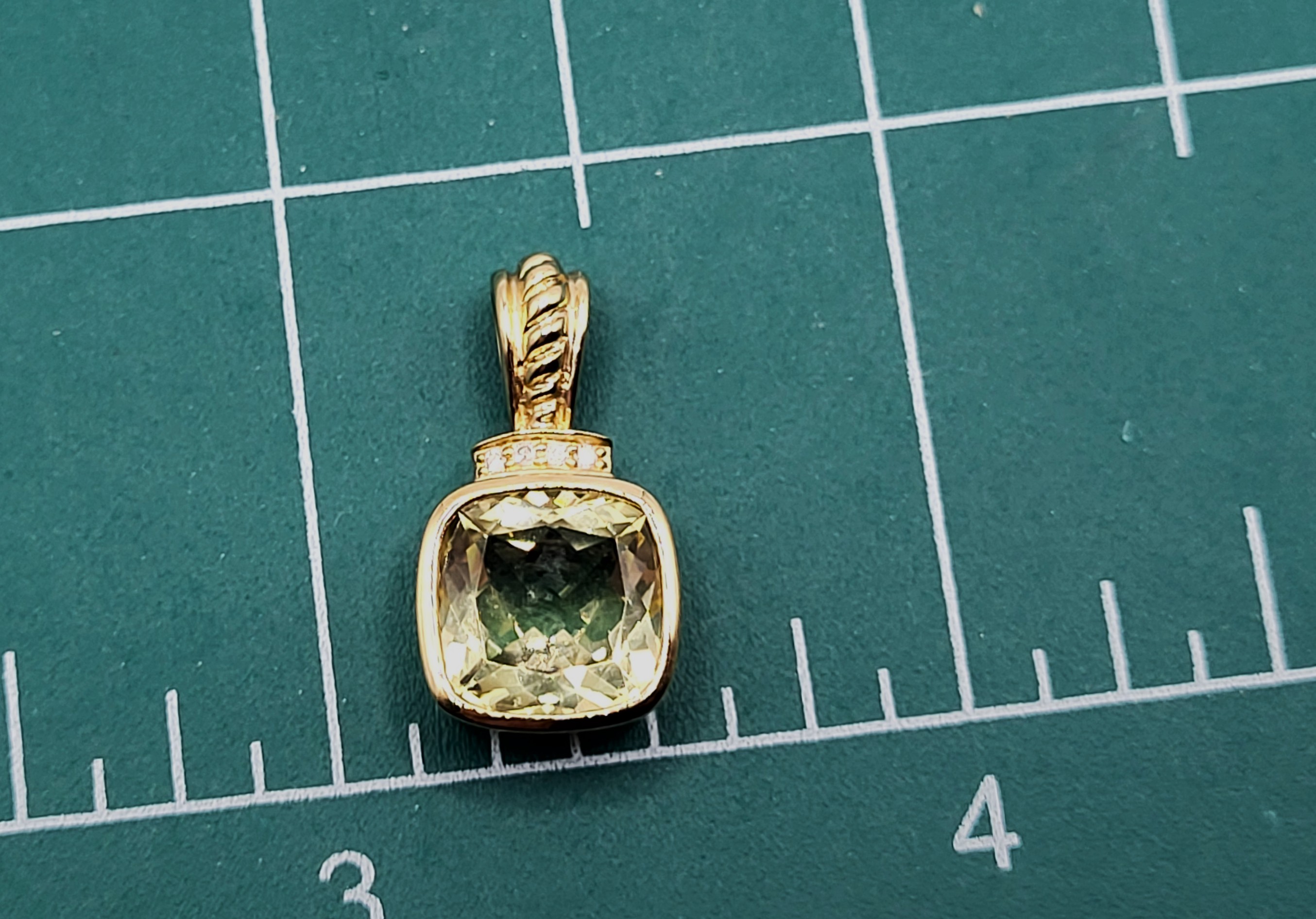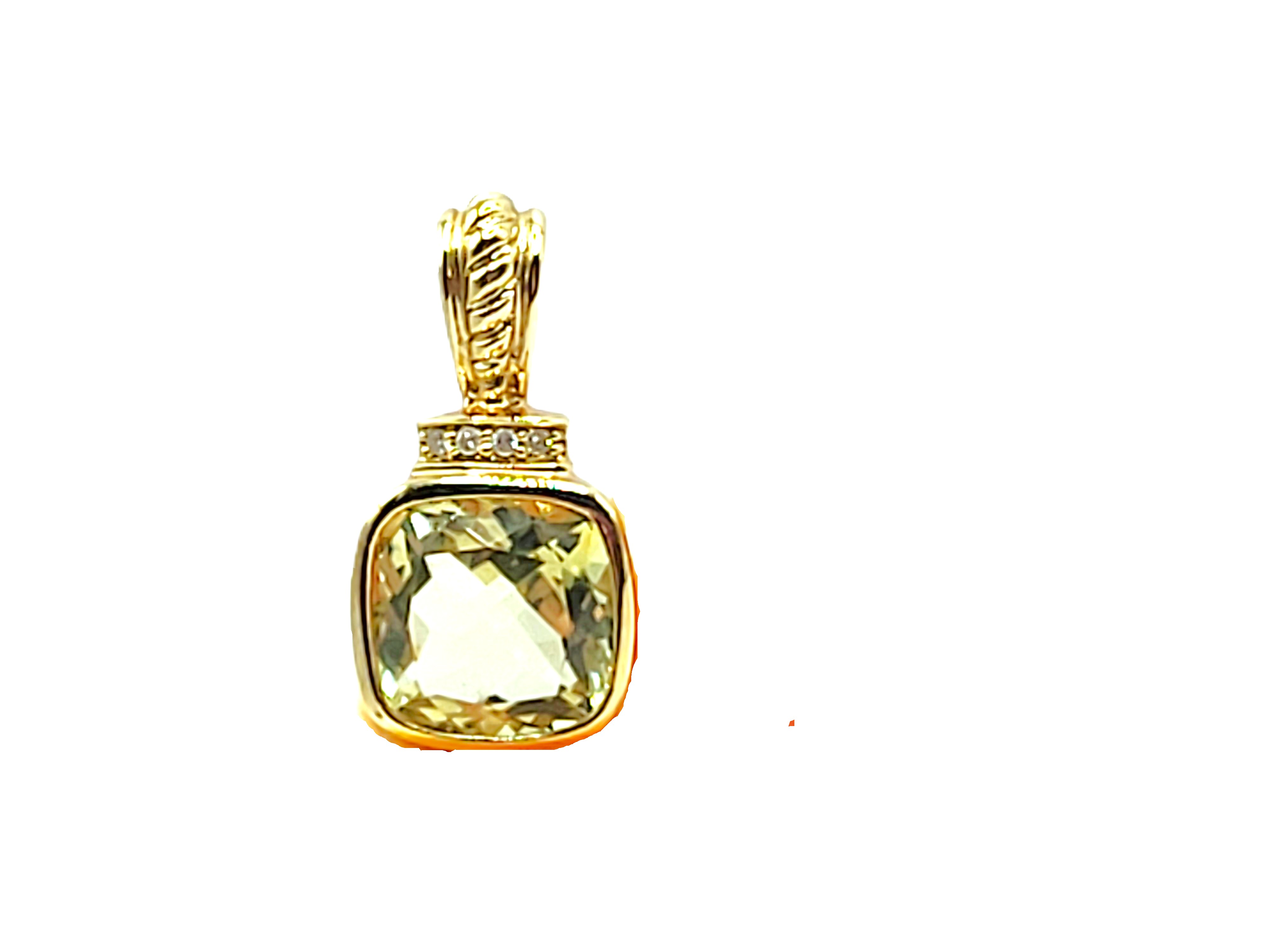 This is a 14 karat yellow gold pendant that features an illuminating 3.36 carat cushion-cut, bezel-set lemon quartz and .02 carats total weight of round, brilliant-cut, H color, SI2-I1 clarity diamonds for accent along the topl The pendant has a solid bail with a gold bead finish that can accommodate an approximate 2.5mm wide chain. 2.2 grams Admin: G11241/21bet-log