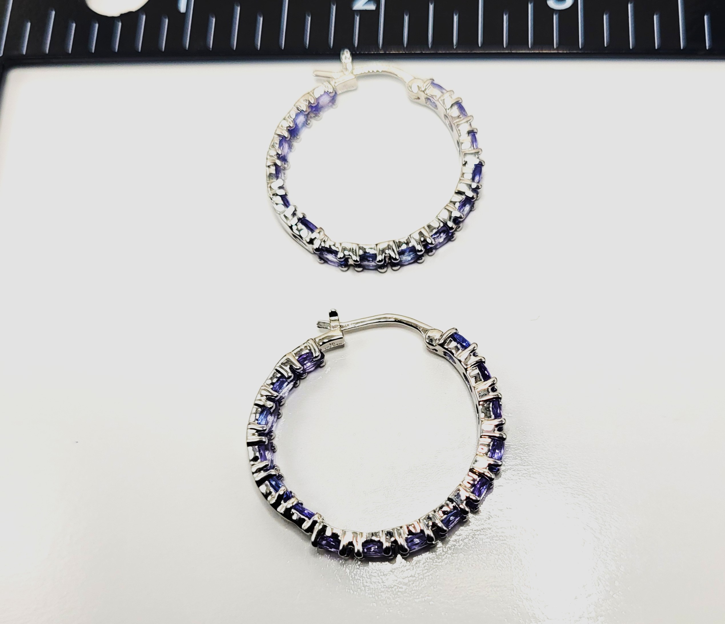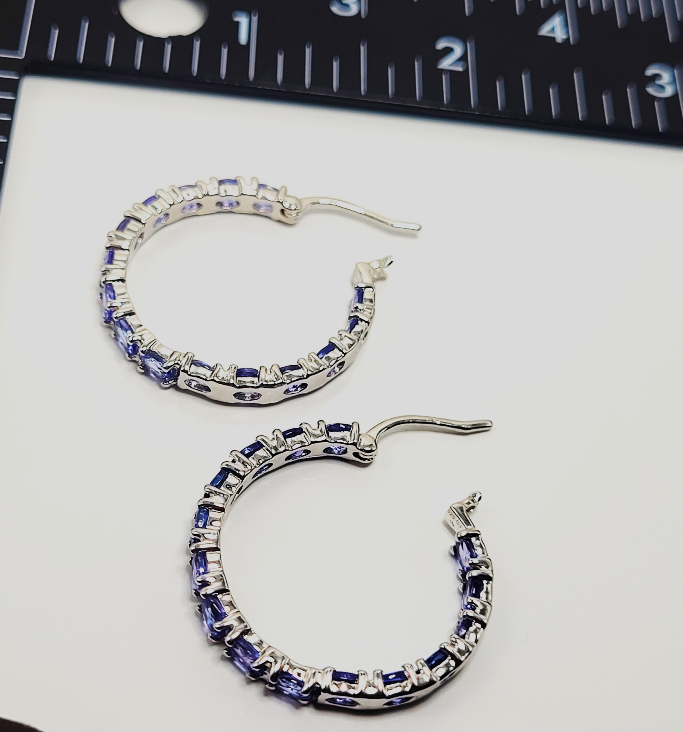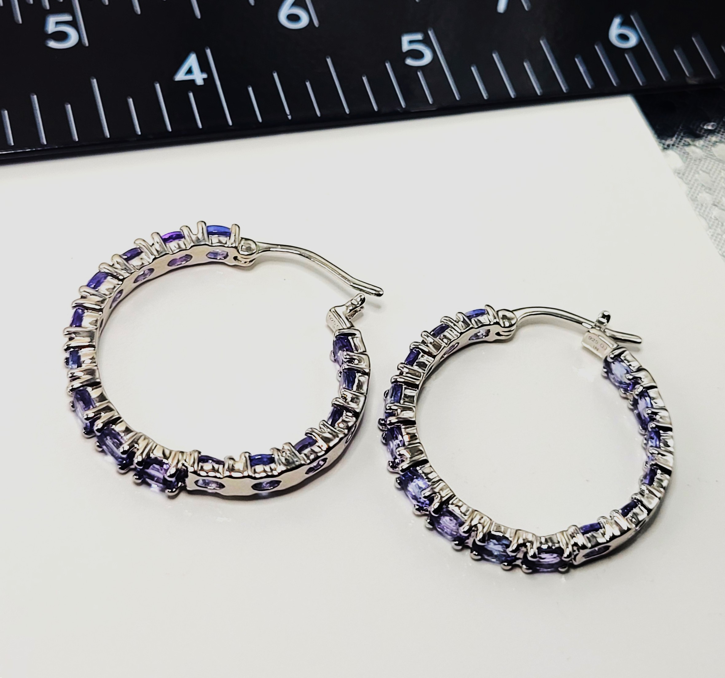 This is a fabulous pair of sterling silver hoop earrings, featuring over 5.00 carats total weight of light-purple, oval-cut, genuine tanzanite. The inside-out design makes sure everyone gets to see all 5.10 carats of the 4x3mm sparkling gemstones. The hoops are approximately 1" in diameter and attach to the earlobe with hinged posts and snap-back clips. Admin:KbQ98445/9a-or