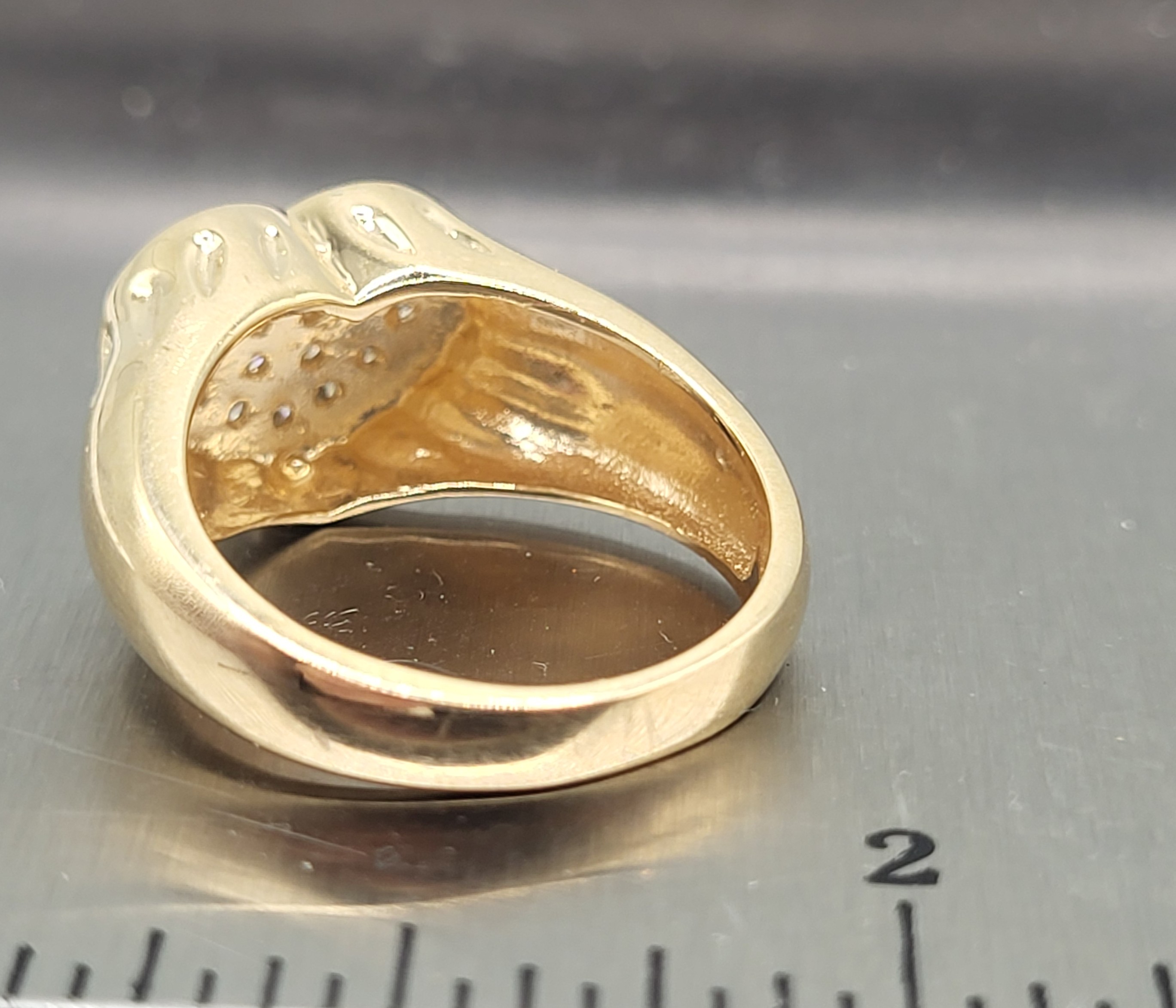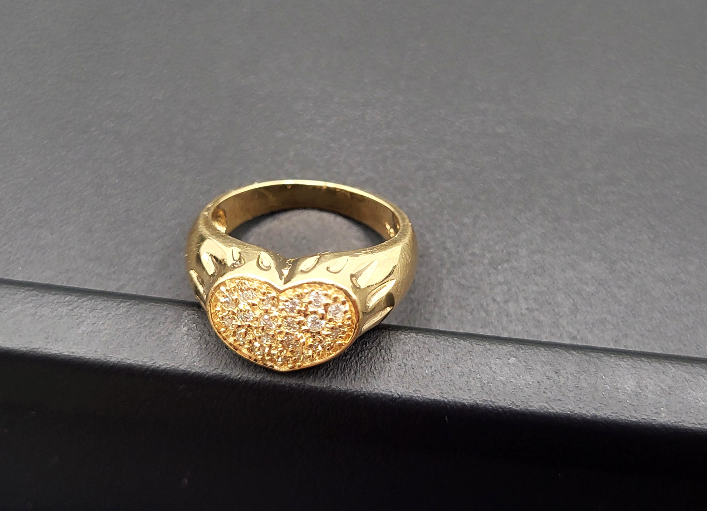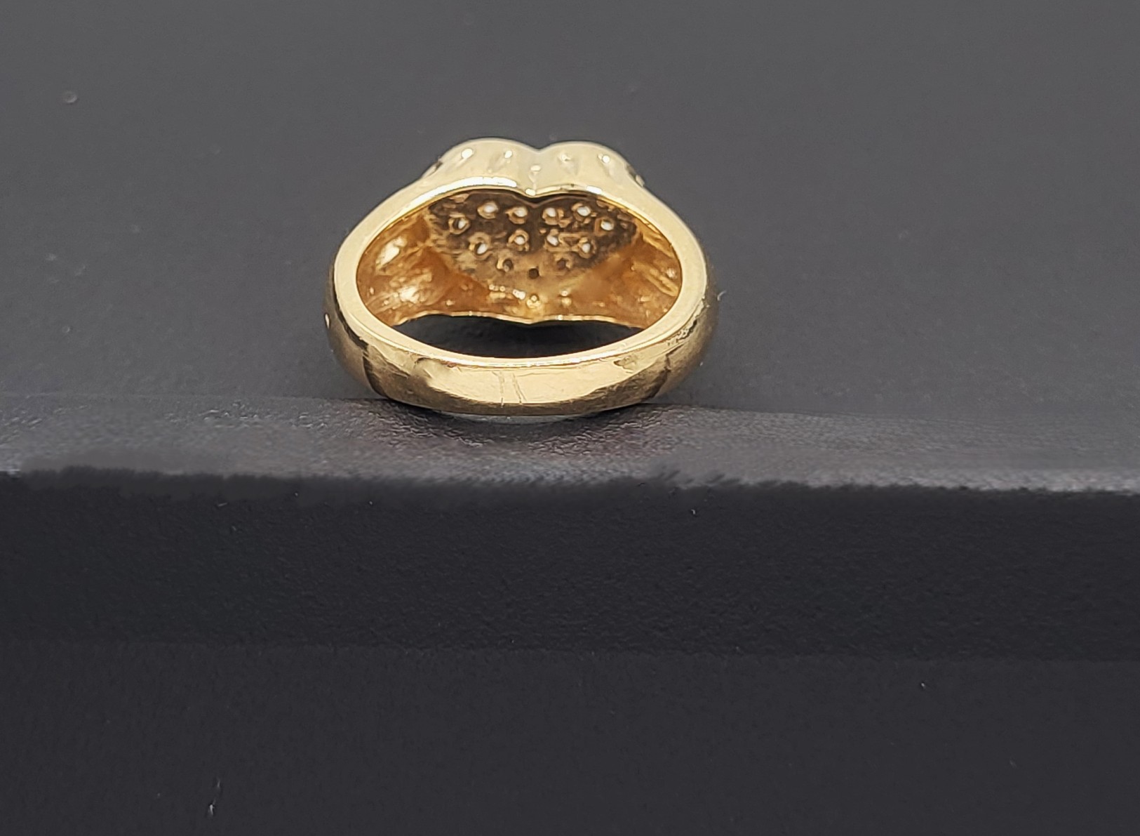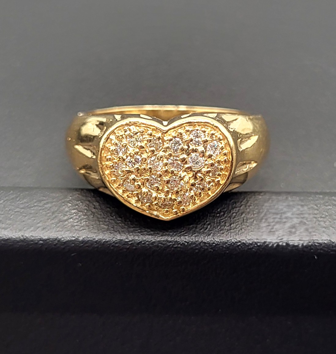 This pave’ diamond heart ring is a sweetheart’s favorite, super trendy and "chunky", especially when given by a "hunka hunka" burning love!. This is a 14 karat yellow gold ring that features a flat-surfaced heart that is lifted from the polished shank using Belcher-like textured ridges and covered with .25 carats total weight round, brilliant-cut, H color, SI2-I1 clarity pave’ set diamonds. The ring is US size 6.75. See below for sizing information and other important details. Admin: G11241/24net.pgr