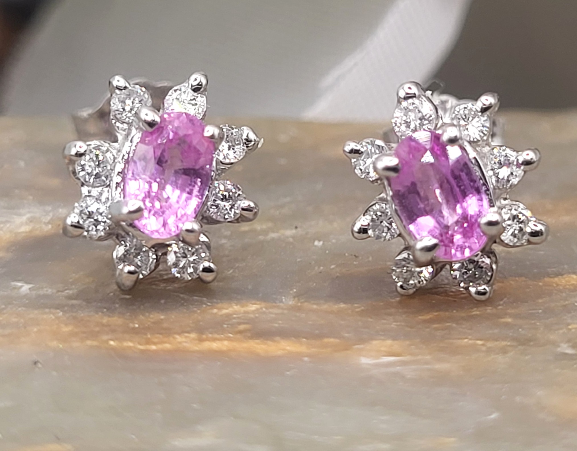 This is a pair of 14 karat white gold earrings that feature .66 carats total weight of oval-cut, prong-set, genuine pink sapphires and .27 carats of round, brilliant-cut, H, SI2-I1 clarity diamonds in the halos. Dainty demeanor with super sapphire shine! The earrings attach to the earlobe with posts and friction backs. Admin: G11241/11ior