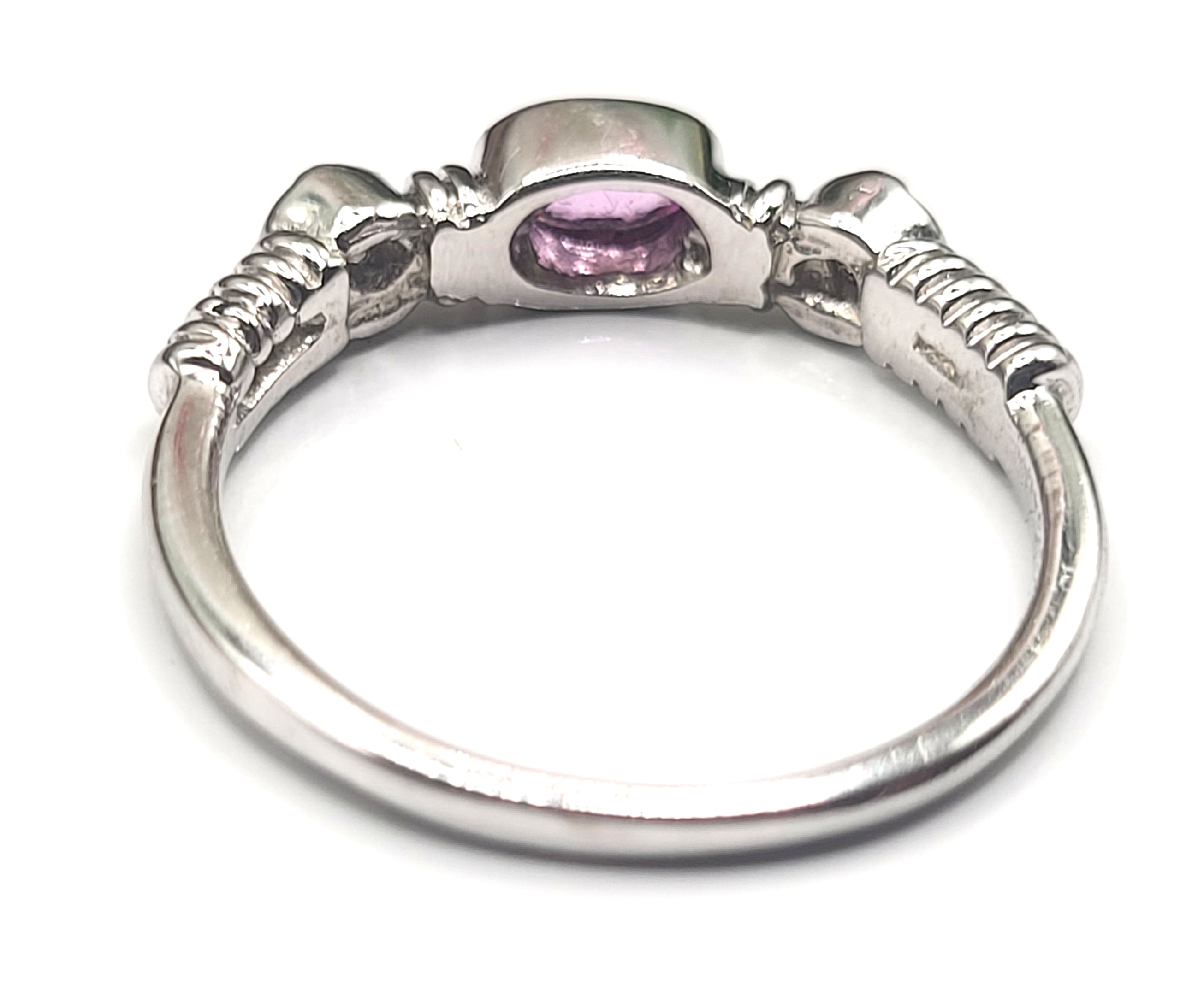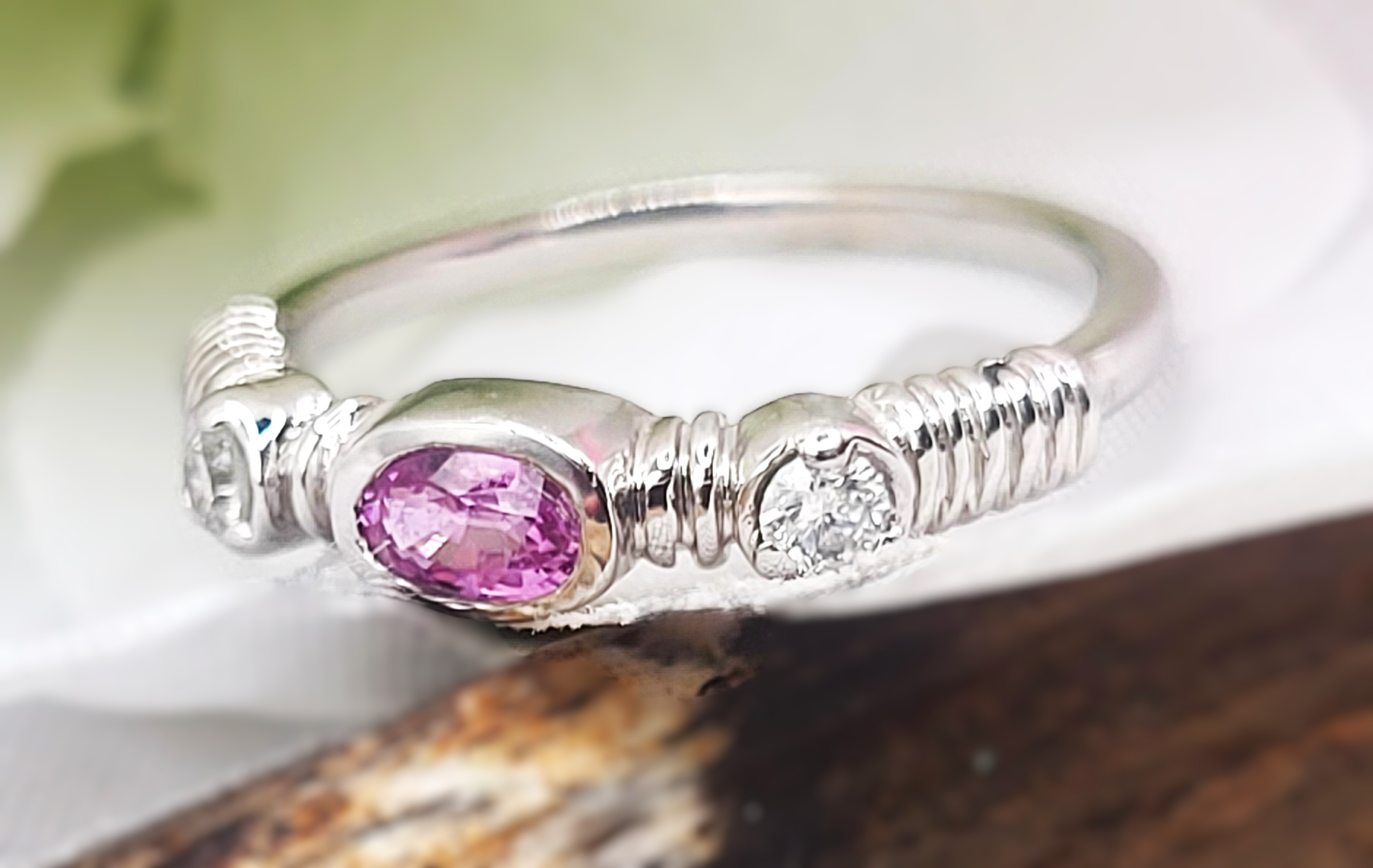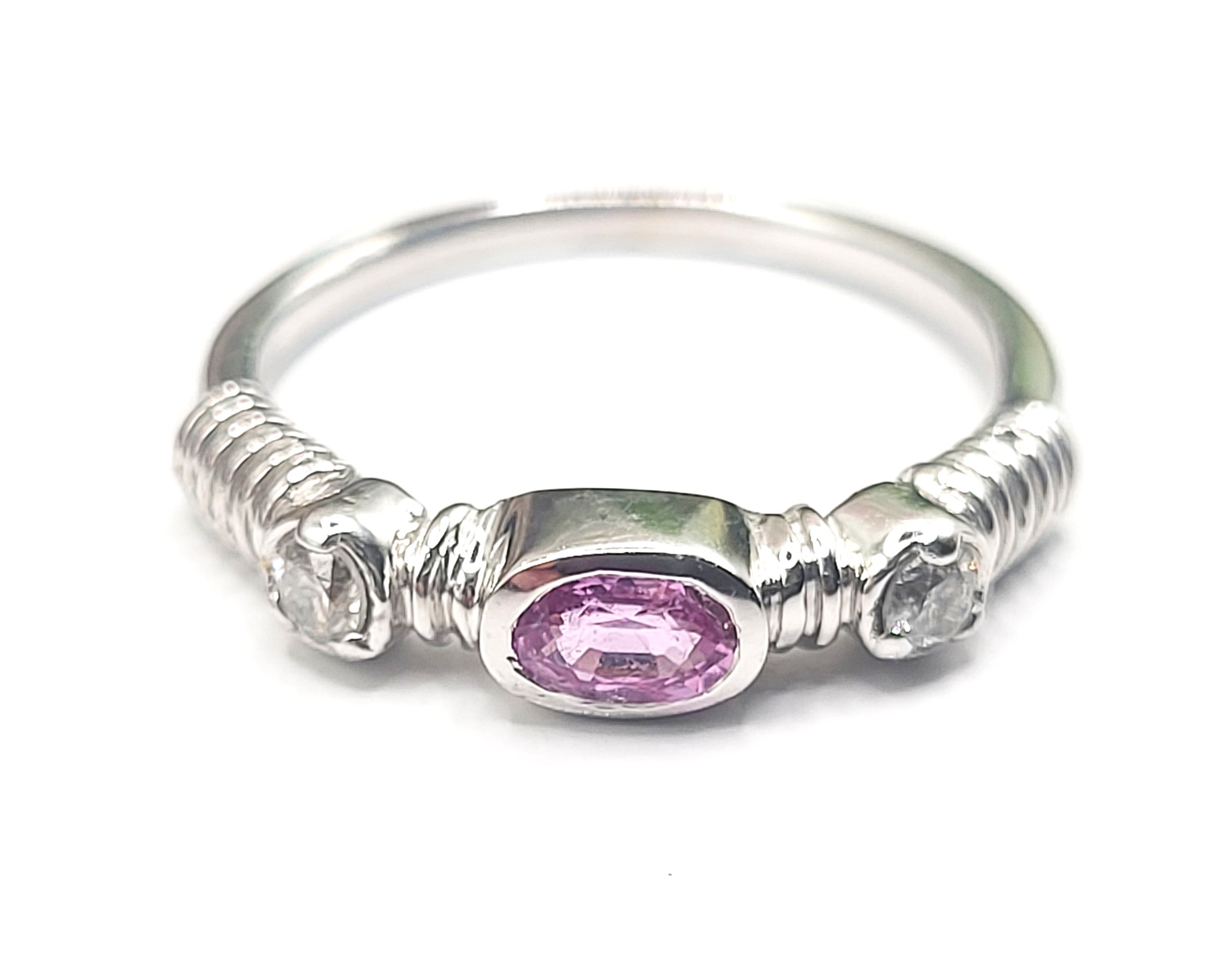 A .33 carat, oval-cut, bezel-set, genuine pink sapphire is featured in this 14 karat white gold stacker ring with ribbed, cable-design shoulders and .14 carats total weight of round, brilliant-cut, H, SI2 diamonds for accent. This ring us dainty, not delicate! It is US size 7. See below for sizing details and other information. Admin: G11241/23ltt