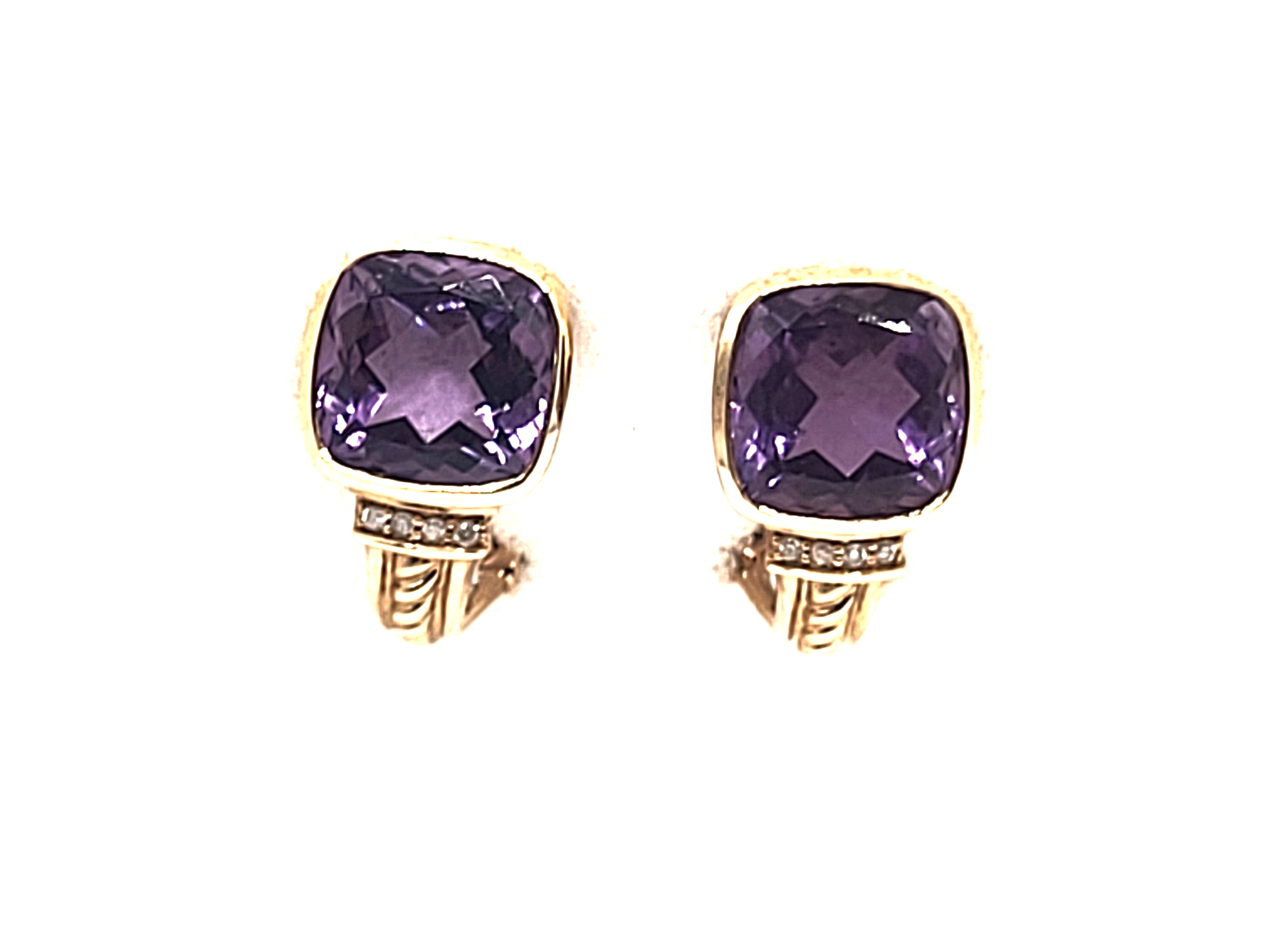 This is a pair of 14 karat yellow gold earrings, featuring 6.26 carats total weight of cushion-cut, bezel-set, genuine amethysts and .04 carats total weight of round, brilliant-cut, H, SI2, channel-set, accent diamonds. The earrings are approximately 3/4" long with a twisted rope design at the bottom that curves around to the closure, which is a post and an Omega back.