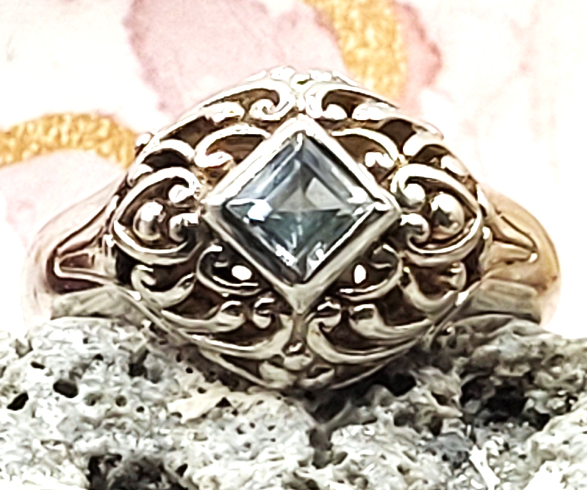 This ring appears to be custom-crafted, and very well-made. An approximate .50 carat square-cut, sky blue topaz is bezel-set in a domed frame of ribbony swirls. The split shoulders taper to a "comfort fit" smooth, polished sterling silver shank that is approximately 3.75mm wide. The ring has a reticulated gallery plate. It is US size 7.5 and can be sized for an additional charge. Please contact Bidfair Fine Jewelry for sizing details. Admin: 33122/13e-rrr