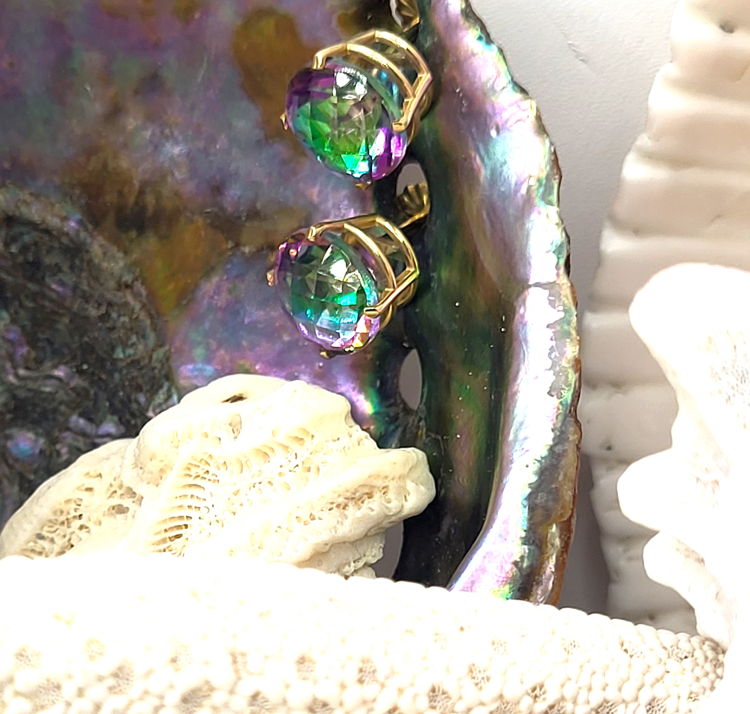 This is a dazzling pair of 14 karat yellow gold mystic topaz earrings that have a combined total of approximately 6.00 carats, round-cut, top-faceted mystic topaz. The gemstones are secured in four-prong settings with a supportive gallery rail. The earrings are approximately 3/8" diameter and attach to the earlobes with posts and friction backs. *Mystic Topaz are genuine clear topaz with a specialized treatment applied to the pavilion of the pendant.