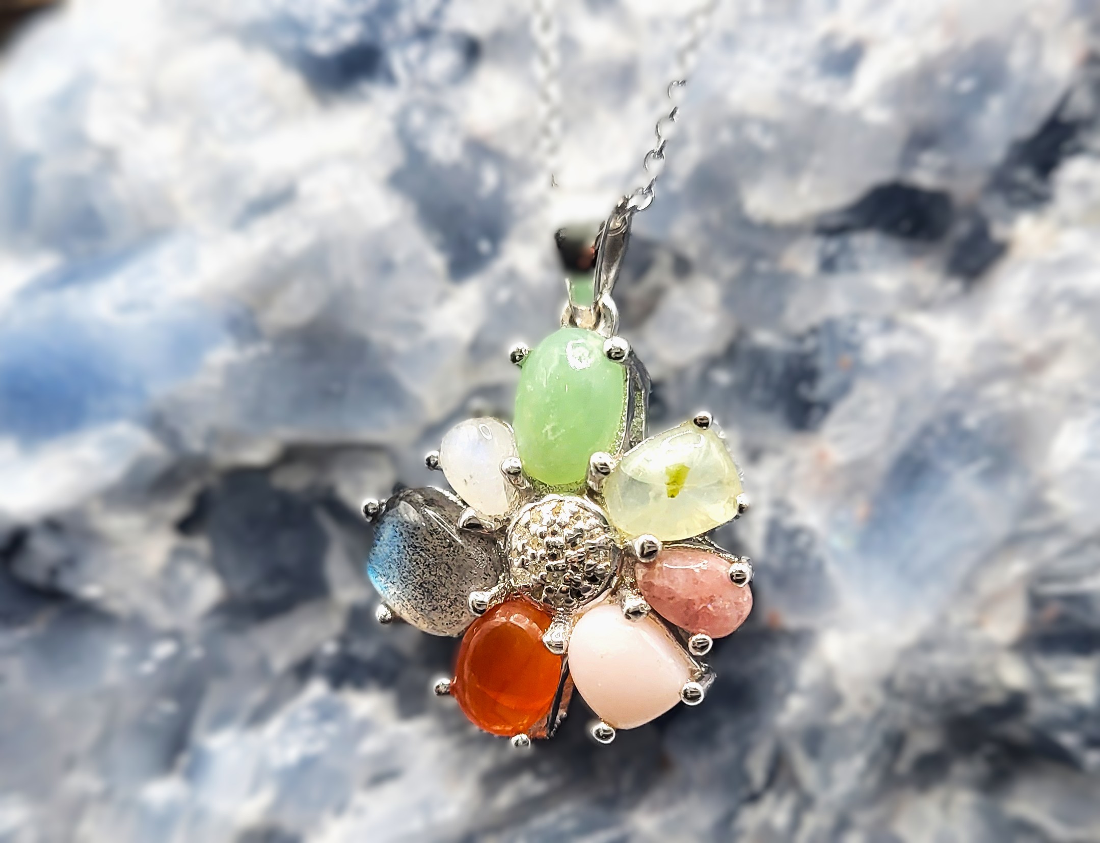 Including: Pink Opal, Rhodocrosite, Prehnite, Chrysoprase, Rianbow Moonstone, Labradorite, Fire Opal, and White Topaz