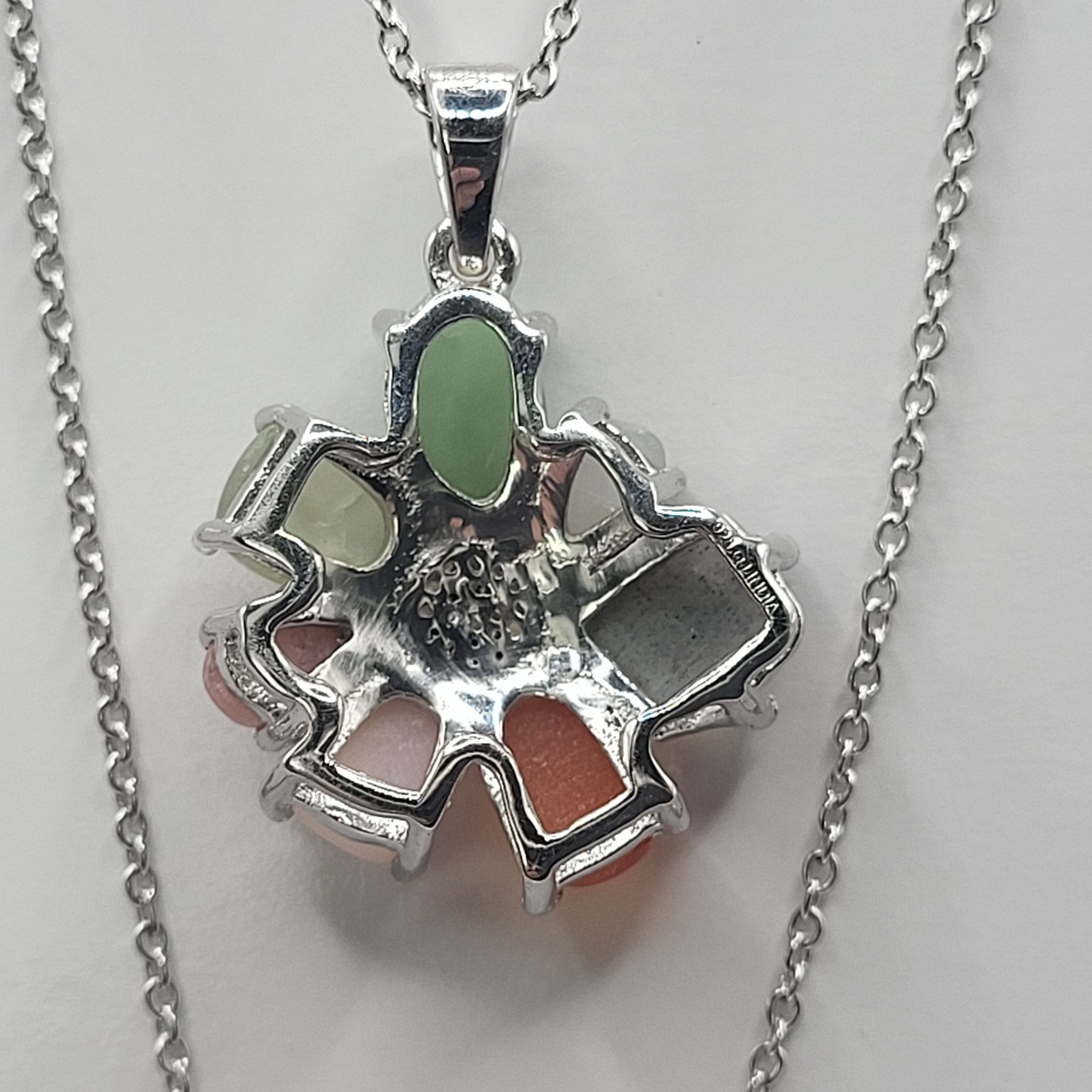 This silver necklace features a delight bouquet of colored gemstones. Eac stone radiates and glows. White topaz are in the center of the flower and it hangs from a solid bail. The fine link chain is 18" long and closes with a spring ring. The necklace has a tarnish-resistant rhodium finish. AdminCode: KQK39/4-nl