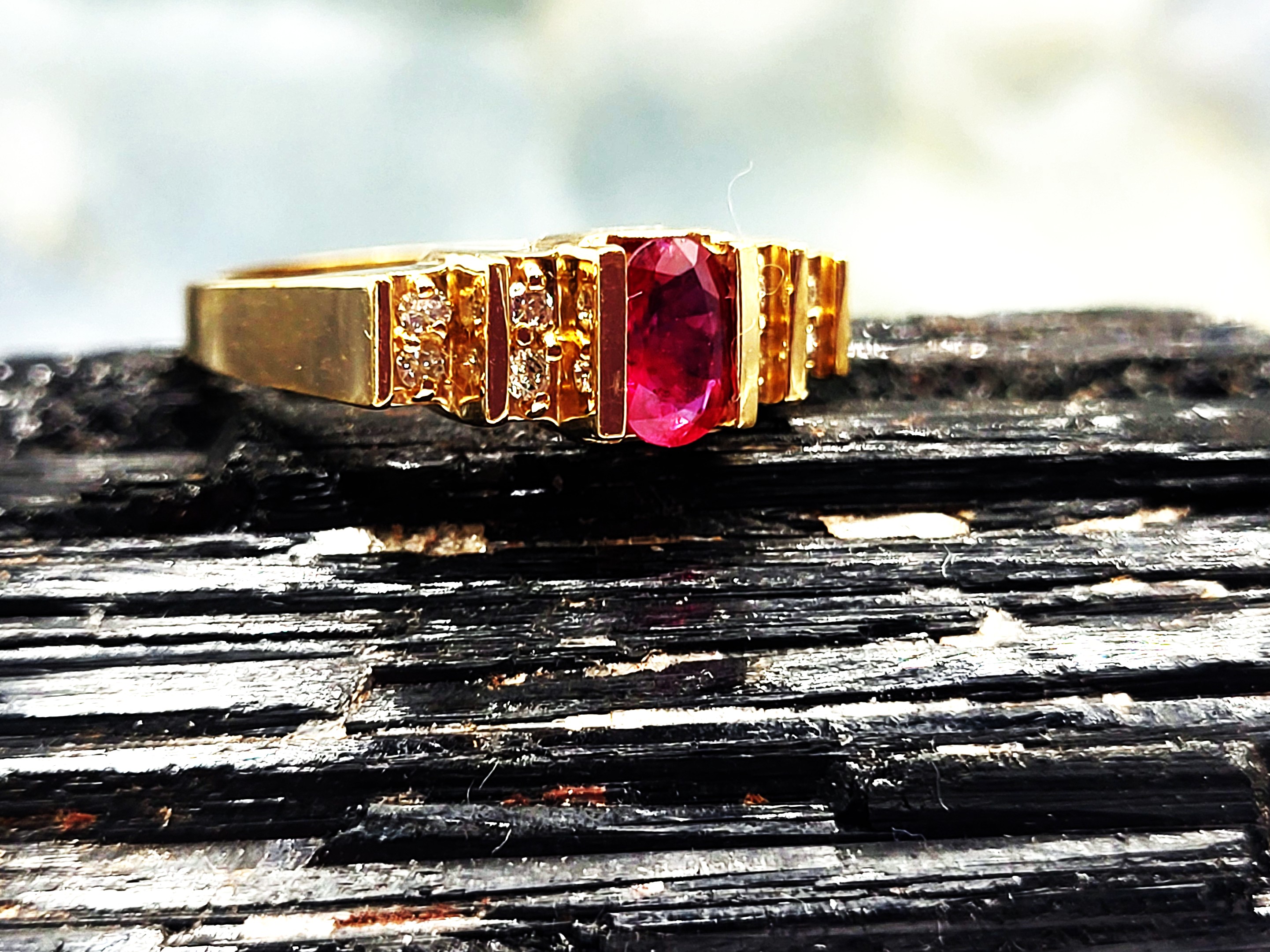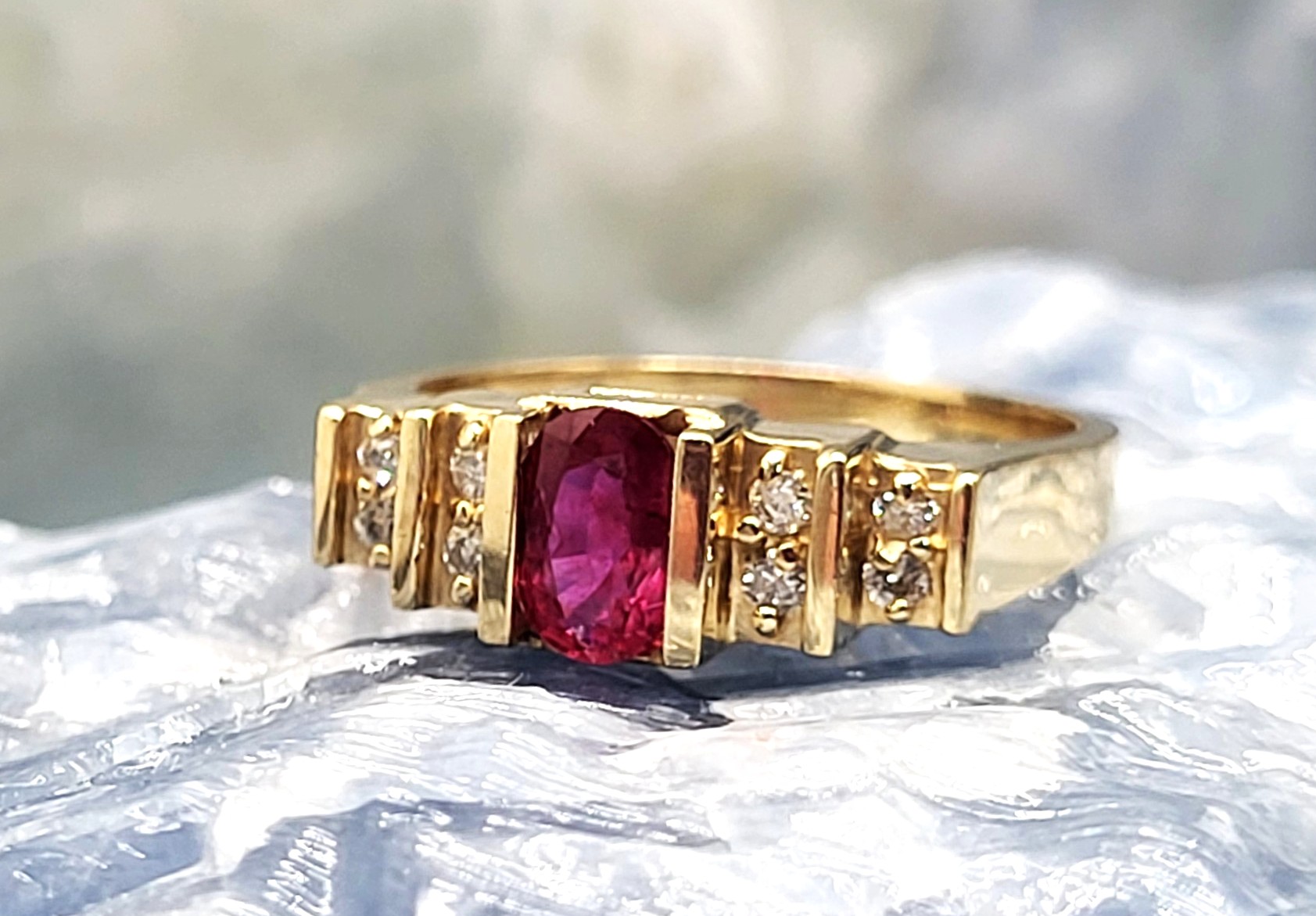 This is a 14 karat yellow gold ring that features an approximate .60 carat oval-cut, tension-set, genuine ruby with approximately .16 carats of round, brilliant-cut, H color, SI2-I1 clarity diamonds in the stepped shoulders that taper to an approximate 2.25mm shank. This ring is US size 7. See sizing details and other important information below. AdminCode:100021/4.1G