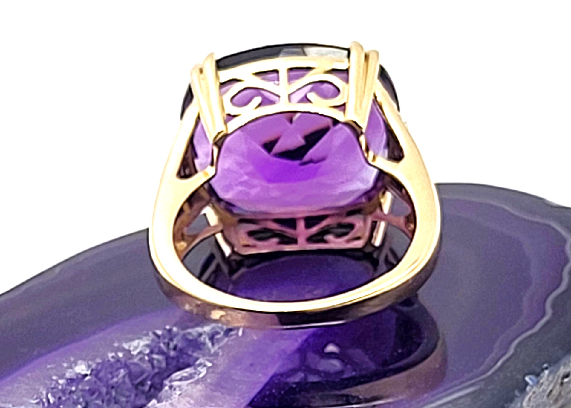 This 14 karat yellow gold ring features an impressive 11.25 carat, cushion-cut, natural amethyst that is set with alluring split prongs over a swirling, reticulated bridge. The wide cathedral shoulders have .17 carats total weight of micro-pave set, round, brilliant-cut, H-I color, I1 clarity diamonds. The ring is US size 7. See below for sizing options and other information.