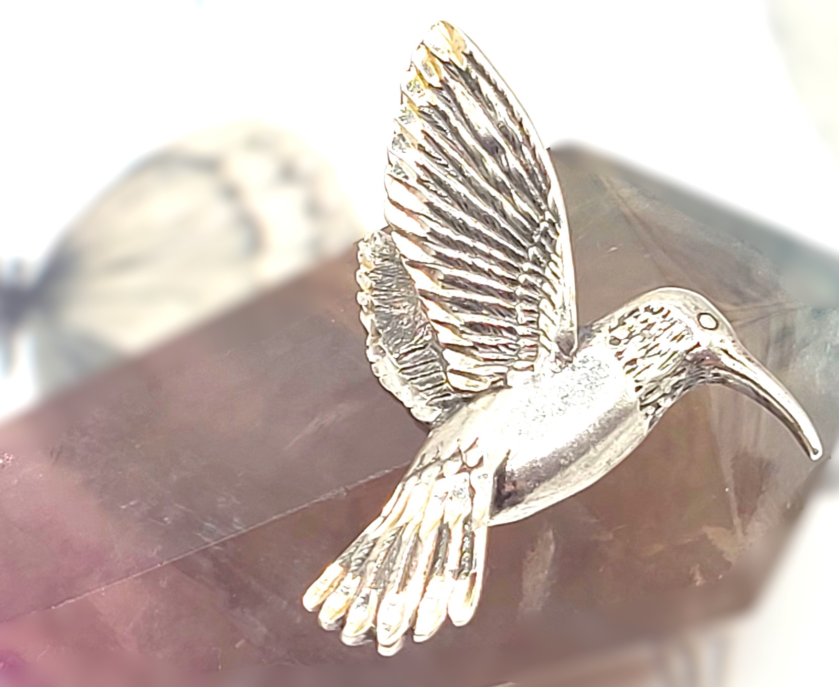 This is a vintage sterling silver pendant, as a figural, hummingbird, made by the Shube’s Manufacturing Co. in Albuquerque, NM. The hummingbird is 2-D, and textured details on the wings and tail. The pendant measures approximately 1" x 5/8" and has a hidden bail that can accommodate an approximate 3.25mm chain. The pendant is believed to be circa mid-1980’s. Admin: 33120/19n