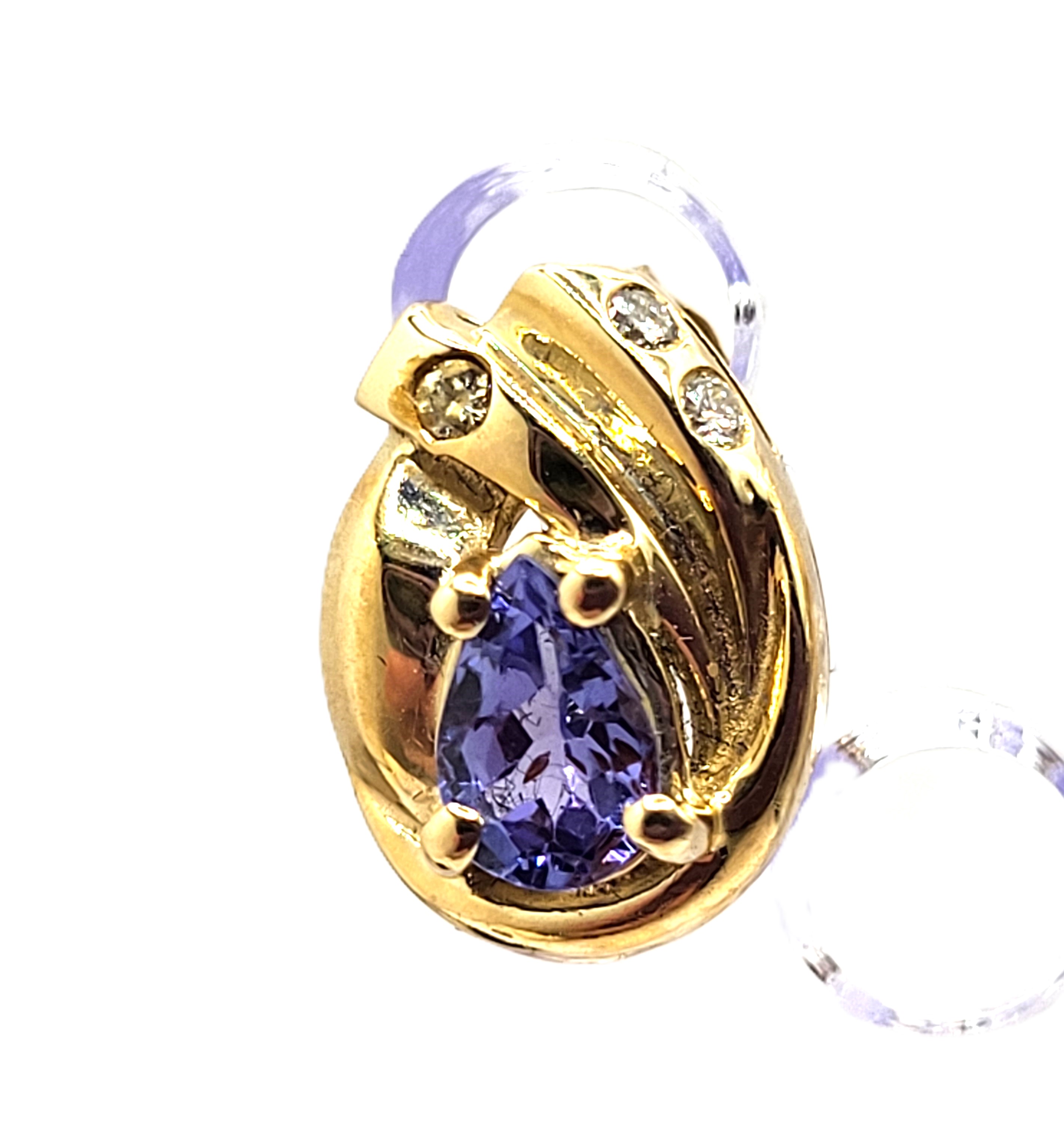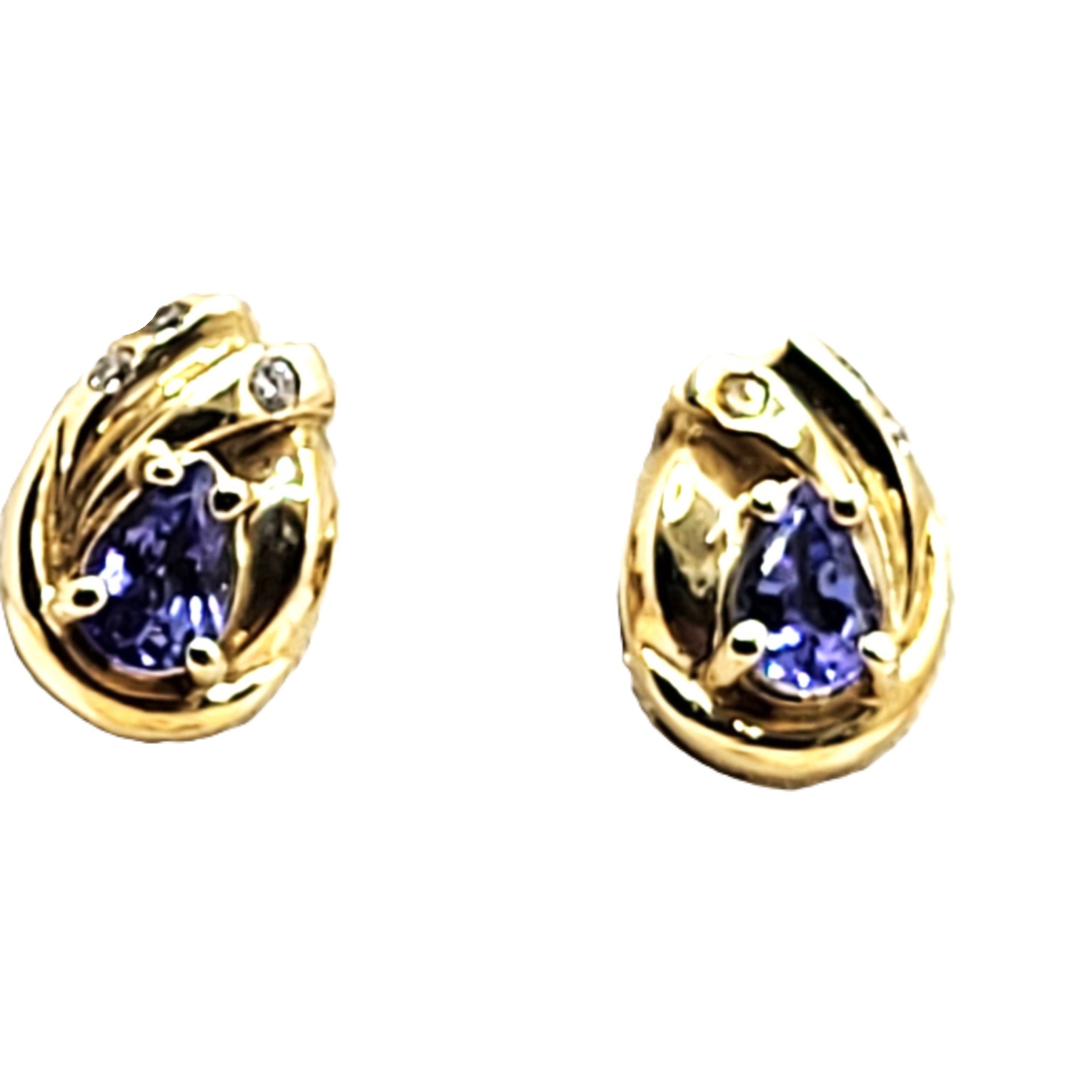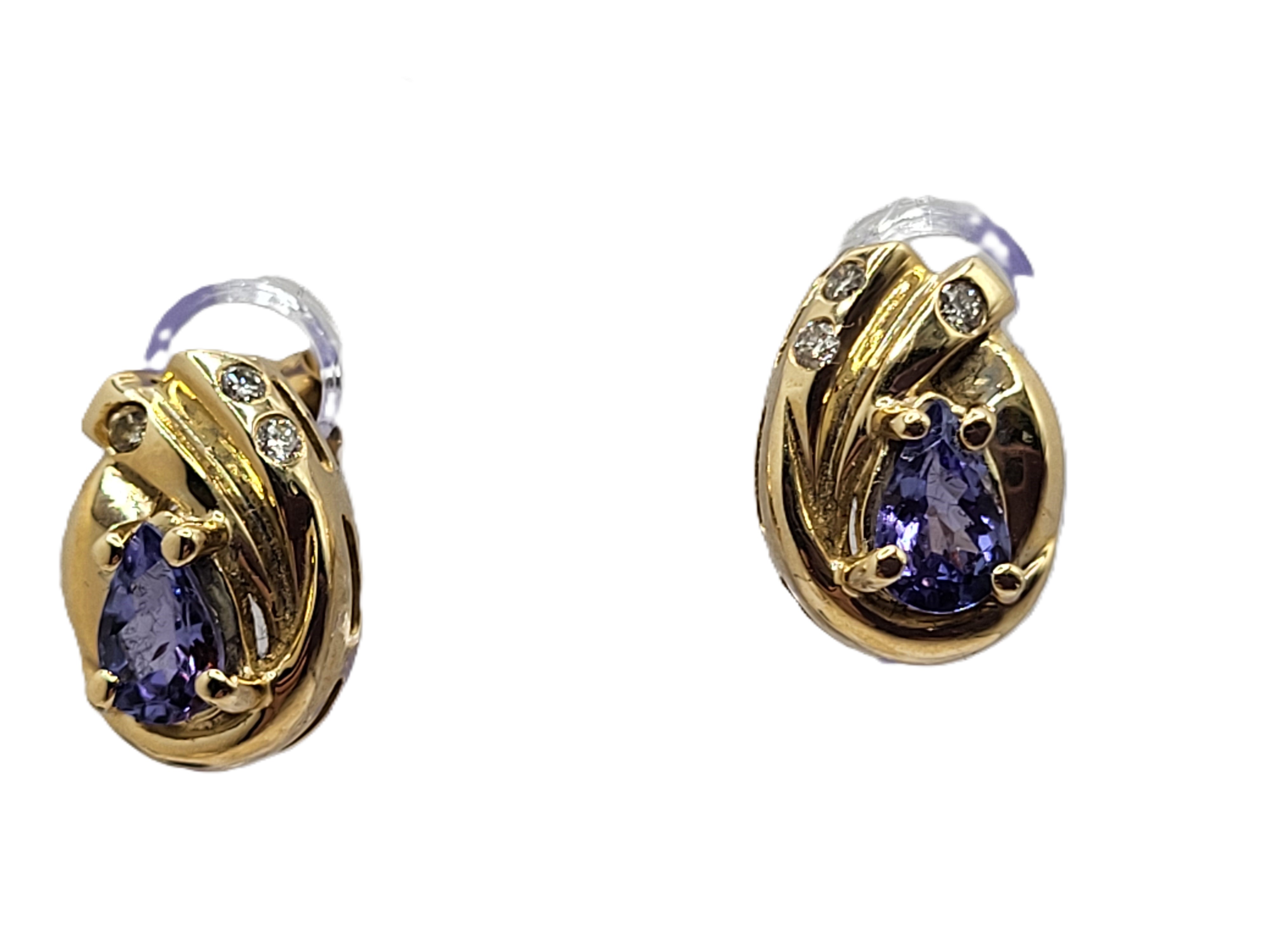This pair of 14 karat yellow gold earrings are ones you will want to (and can) wear everyday! They feature .80 carats total weight of pear-cut, prong-set, genuine purple tanzanites with .09 carats total weight of round, brilliant-cut, H-I color, SI2-I1 clarity, flush-set, accent diamonds. The earrings are approximately 5/8" long, 3/8" wide, 6mm deep (including the gemstone), and they attach to the earlobe with posts and friction backs. 3.49 grams Admin: G11241/34nlt