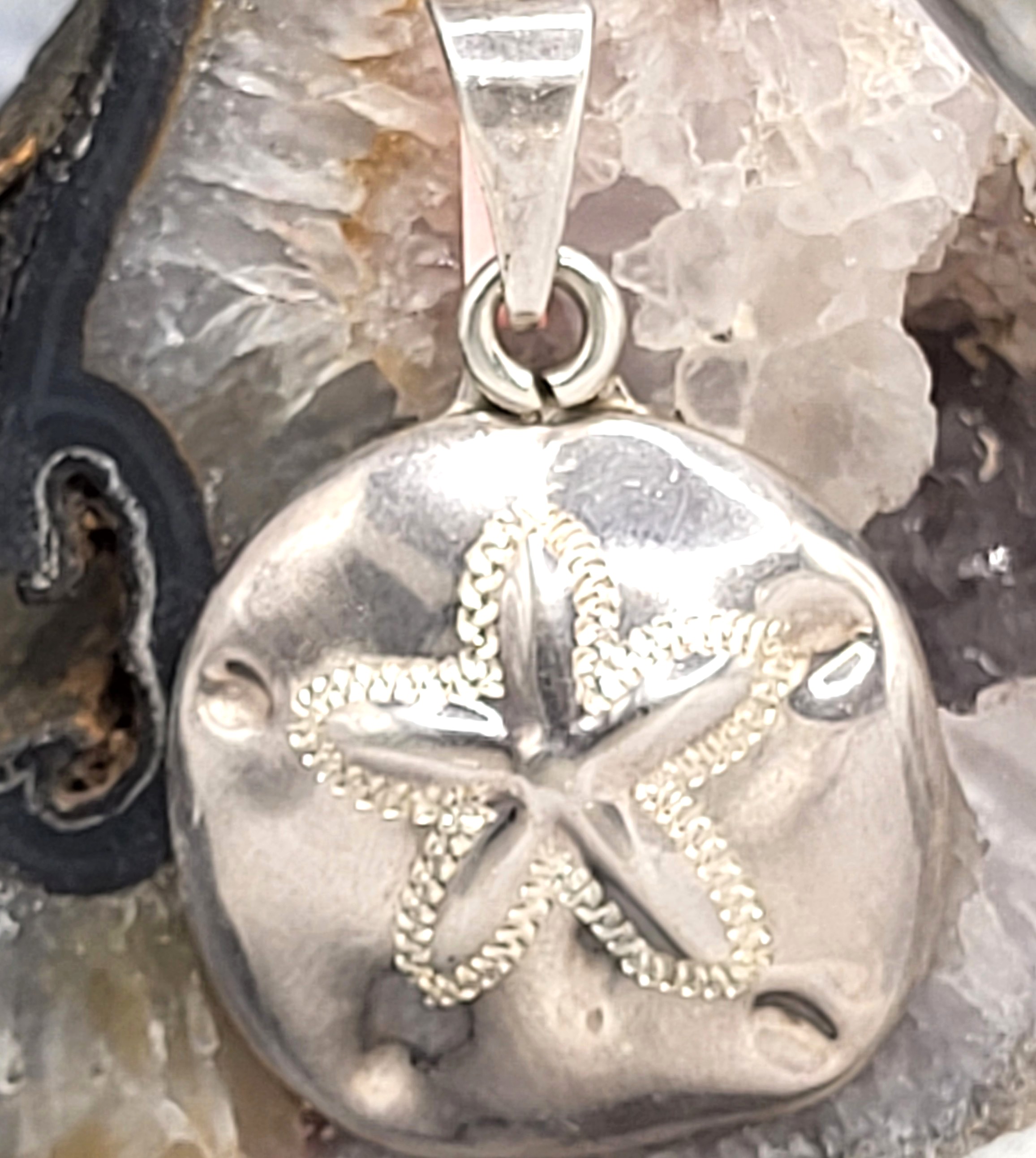 This is a vintage Taxco (TN-49) sterling silver (.925) semi-hollow pendant, circa early 1980’s. The pendant is approximately 1.25" in diameter, excluding the bail. The die-struck sand dollar design is prominently displayed on the semi-dome of sterling silver with a hand-applied ‘bric-a-brac’ border. Paying attention to the details, the artisan placed "dimples" in the appropriate places to represent the five lunules found on the Five Slotted Sand Dollar. The pendant has a smooth backplate that is so well joined with the front, it is difficult to see that it is 2 pieces of sterling silver. The pendant has a large bail that can accommodate an approximate 5.5mm wide chain. The hallmark for this pendant is located inside the bail. PLEASE NOTE: The sand dollar pendant is not perfectly round, but nor is it "banged up" and dented as it may appear in some photos. There are five dimples on the face of the pendant that were intentionally made by the craftsman. The reflective shine of the polished silver creates the illusion of "pings" and colors from items nearby when the photos were taken. 12.68 grams. ForOfficeUse: 33120/11bn