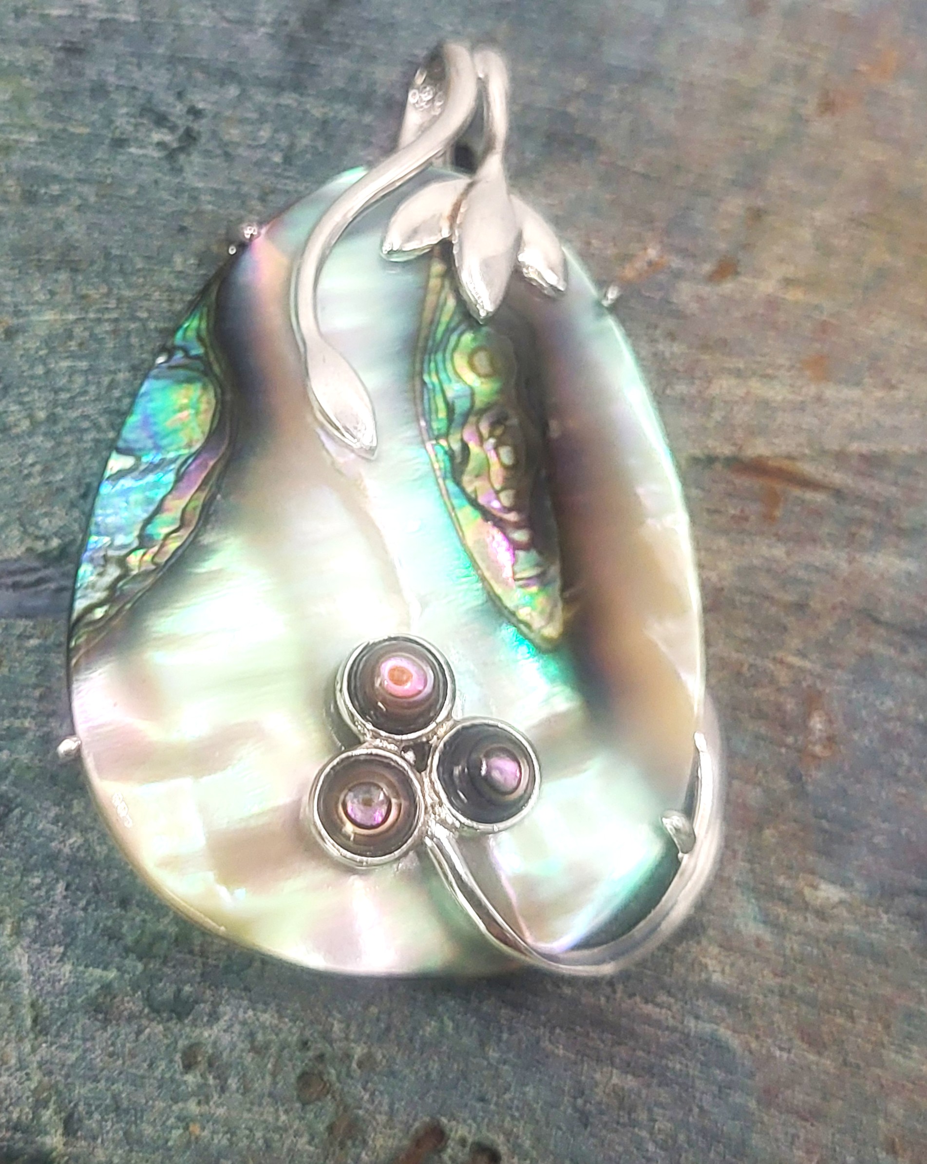 What an organically original pendant! Carved from abalone shell with a polished mother-of-pearl base, not just for additional support, but added shimmer! Carved in the shape of an eggplant, The hints of aubergine coloring in the abalone shell are perfect for a carving of an eggplant. The sterling silver wire work spirals along the edges of the carving are lik delicate tendrils with polished abalone beads representing newly forming eggplants.This pendant has a built-in bail formed from the artistic wire work. This pendant is fashionable to wear at mid-chest or at the 24" mark. AdminCode: KBJS/lr