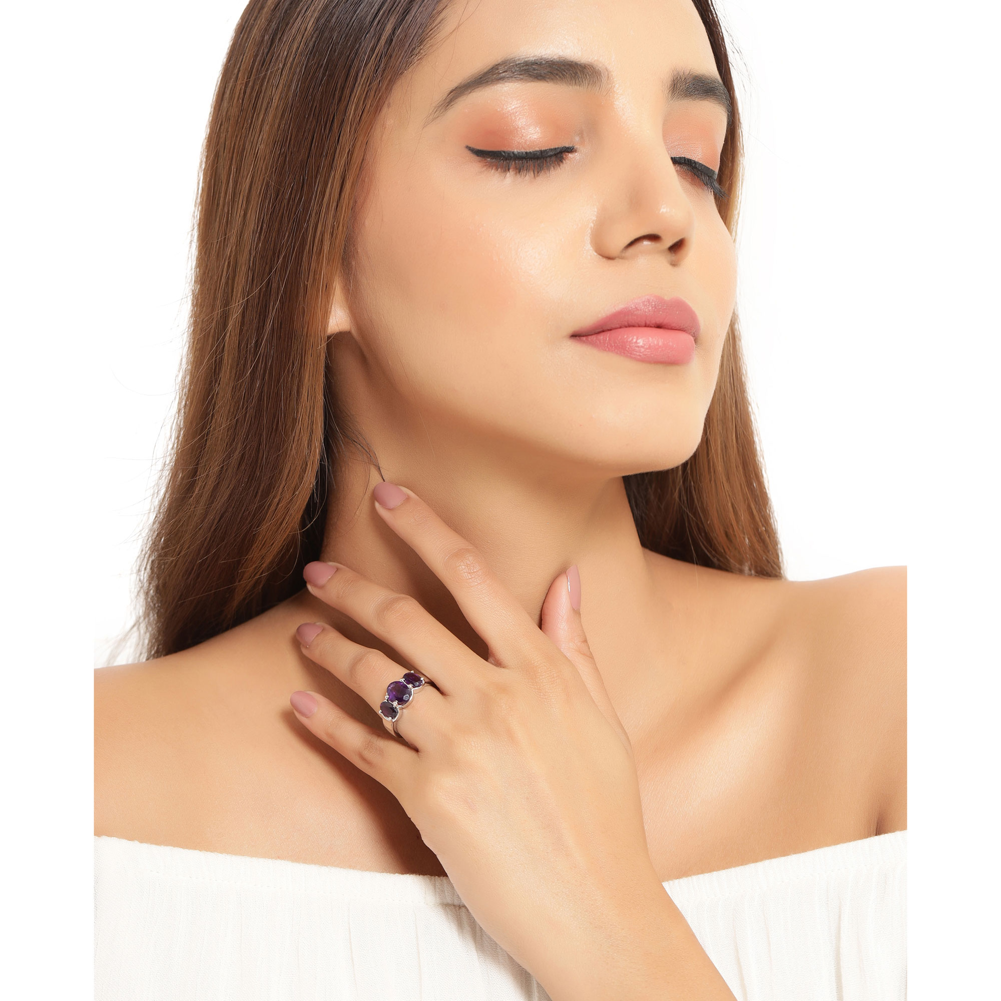 This sterling silver ring features a 1.60 carat richly-colored, oval-cut, genuine amethyst, accompanied by a .80 carat oval-cut, genuine amethyst on each side. Beautifully matched in color and proportions, these amethyst are a wonderful celebration of one’s past, present, and future, or a gift for a February birthday, or just anyone who loves vivid colors. The ring has a firm, finely polished shank that tapers from the 5mm shoulders to the 3.25mm lower shank. The ring has a tarnish-resistant rhodium finish and is US size 8. See important details about this item below. Weight: 5.2grams AdminCode: KQP1225/in