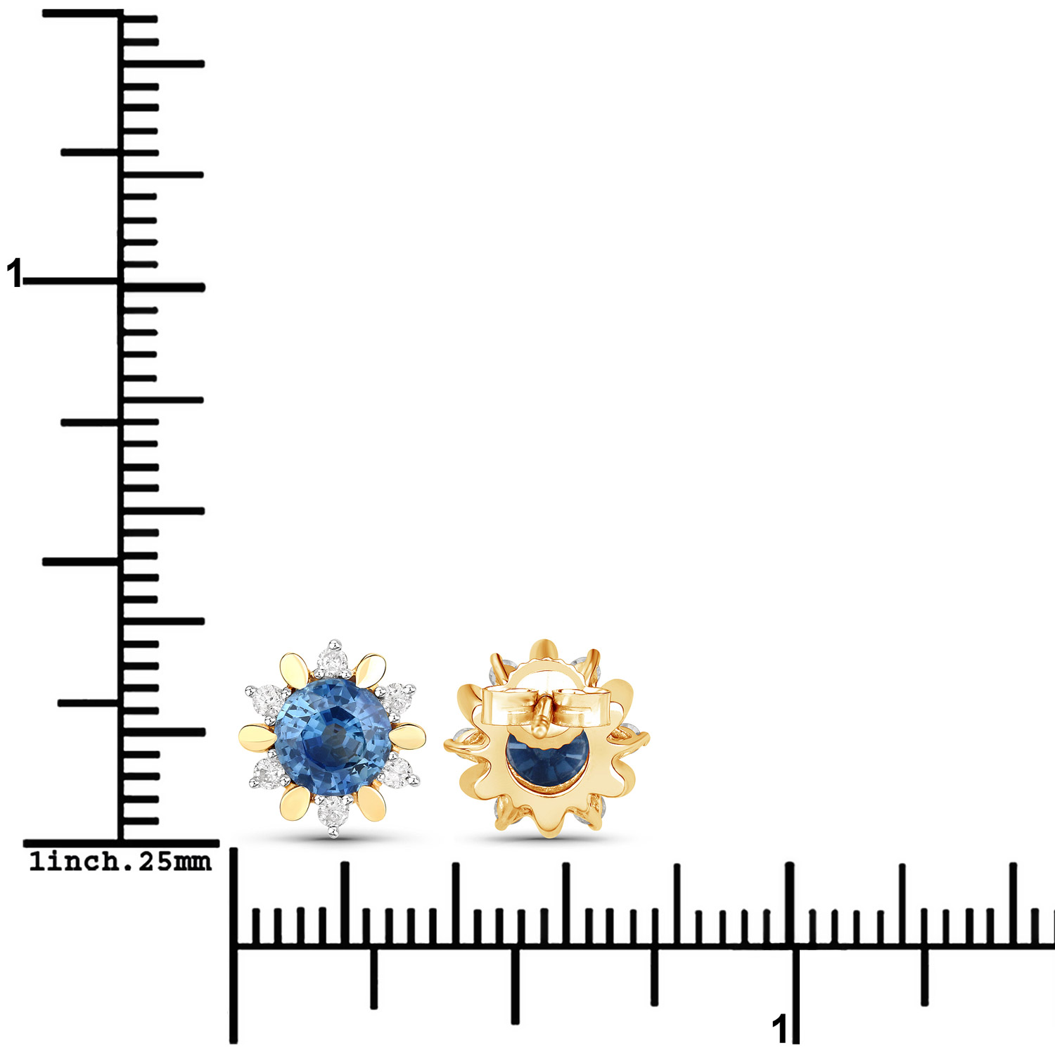 These adorable 14 karat yellow gold earrings are sporting 1.70 carats total weight of round, faceted, genuine, light blue sapphires and .17 carats total weight of round, brilliant-cut, H-I color, I1 clarity diamonds are in the sunburst-style halos. The earrings attach to the earlobe with posts and friction backs. Admin: Q
