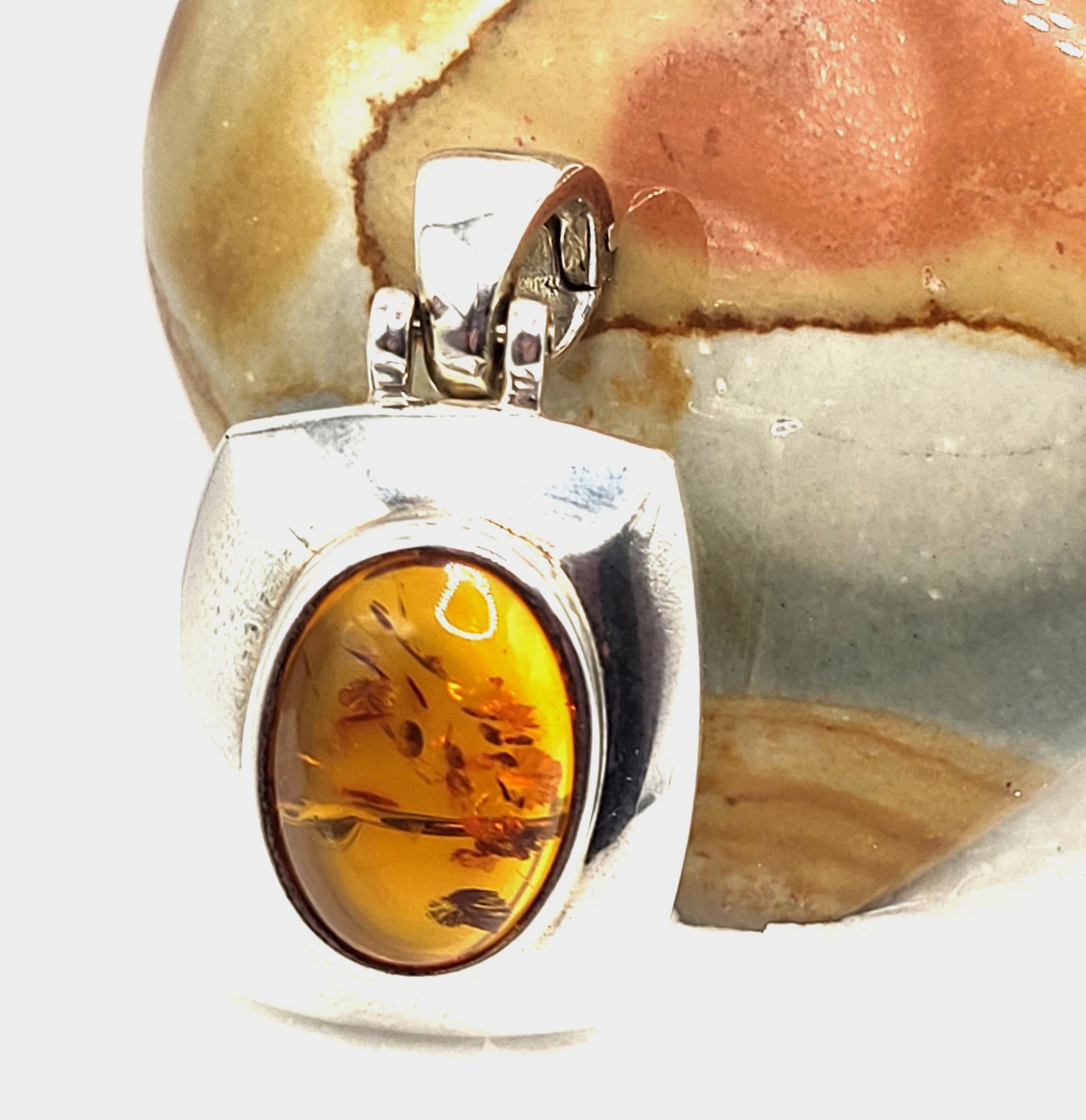 This sterling silver pendant features an approximate 18mm x 12mm, oval, cabochon, polished, bezel-set Amber with a wide, cushion-shaped, polished, sterling silver frame. The hinged bail can accommodate an approximate 6.5mm thick chain, and it opens to accommodate a pearl or bead strand style necklace. The pendant measures approximately 1.25" long x 1" wide. *Authenticity tests on the amber are listed below. Admin: K26237/hh