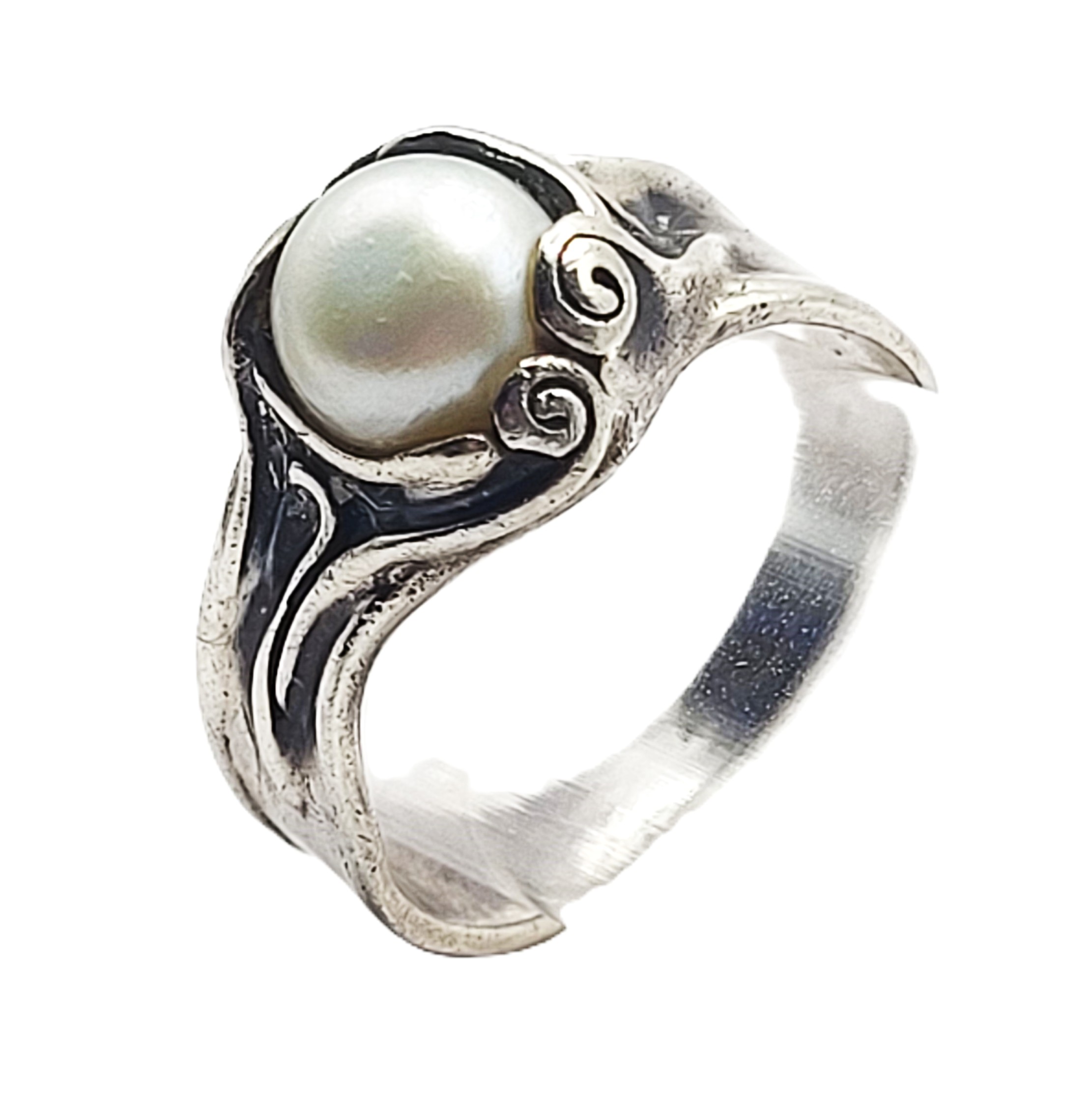 Hagit Gorali is an Israeli jewelry designer known for her sculptural and organic designs in sterling silver and gold. She draws inspiration from nature. "She has gained a devoted following, because of the high quality design and craftsmanship of her silver designer jewelry, which is handmade in Israel." This type of brutalist ring is just as trendy today, as it was in the mid-1900’s. even though this ring is from the early 2000’s! It features an approximate 7.75mm mabe’* pearl cradled in a nest of sterling silver vines and tendrils that snake down the slightly concave shoulders, that gradually taper into an asymmetrical shank, narrowing to approximately 3.5mm. This ring can be size by a professional jeweler.**. 6.4 grams Admin: 33122/10a