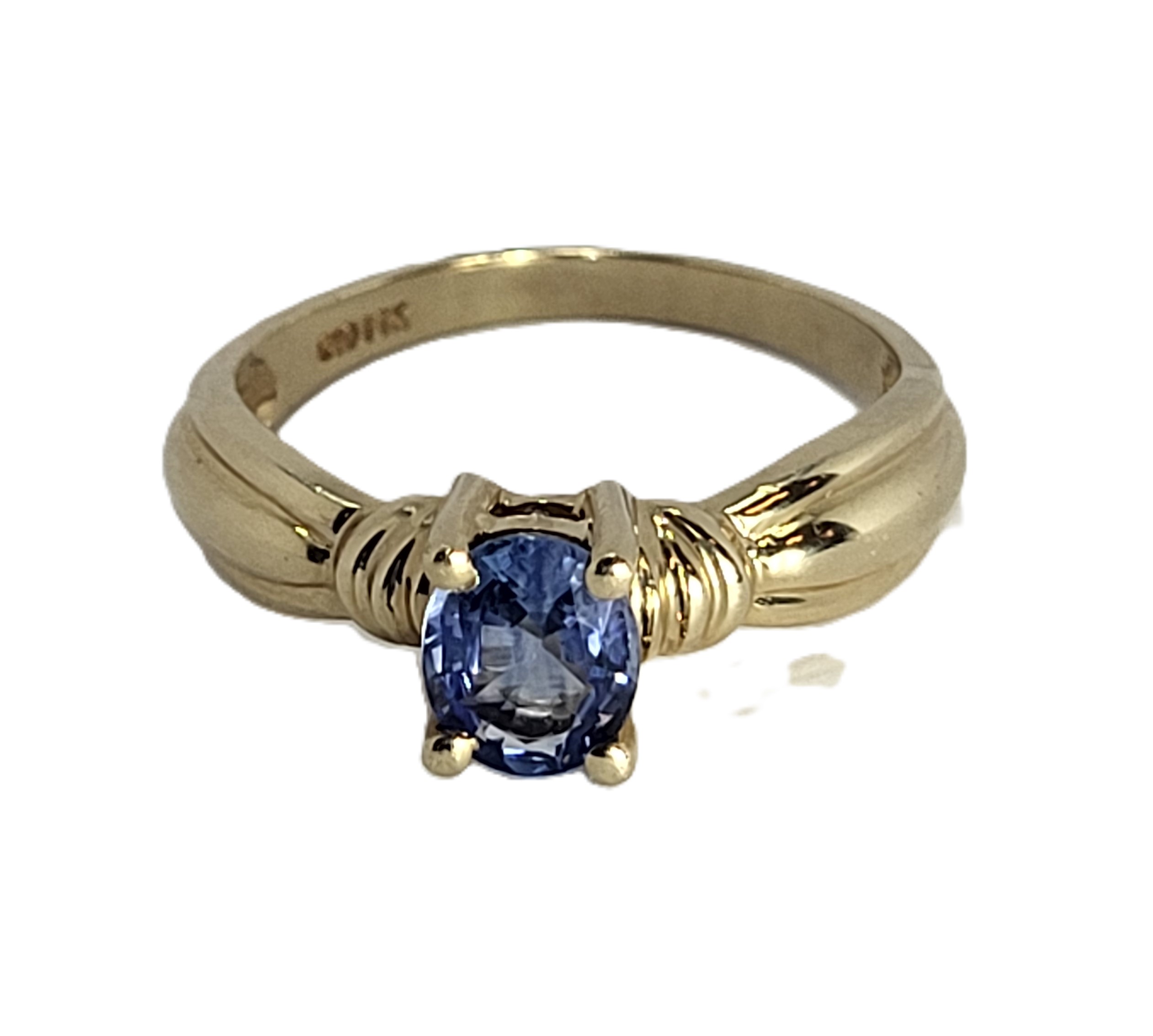 This 14 karat yellow gold ring features an approximate .59 carat oval-cut, eye-clean, light blue sapphire that is prong-set above ribbed, pinched shoulders that widen, then taper to an approximate 2mm shank. The ring bears the CID hallmark of Clyde Duneier Inc., who has been an "internationally recognized leader in the jewelry industry since 1910*. This ring is US size 8. See below for sizing options and other important information. Admin:33109/21bal *ClydeDunier Website