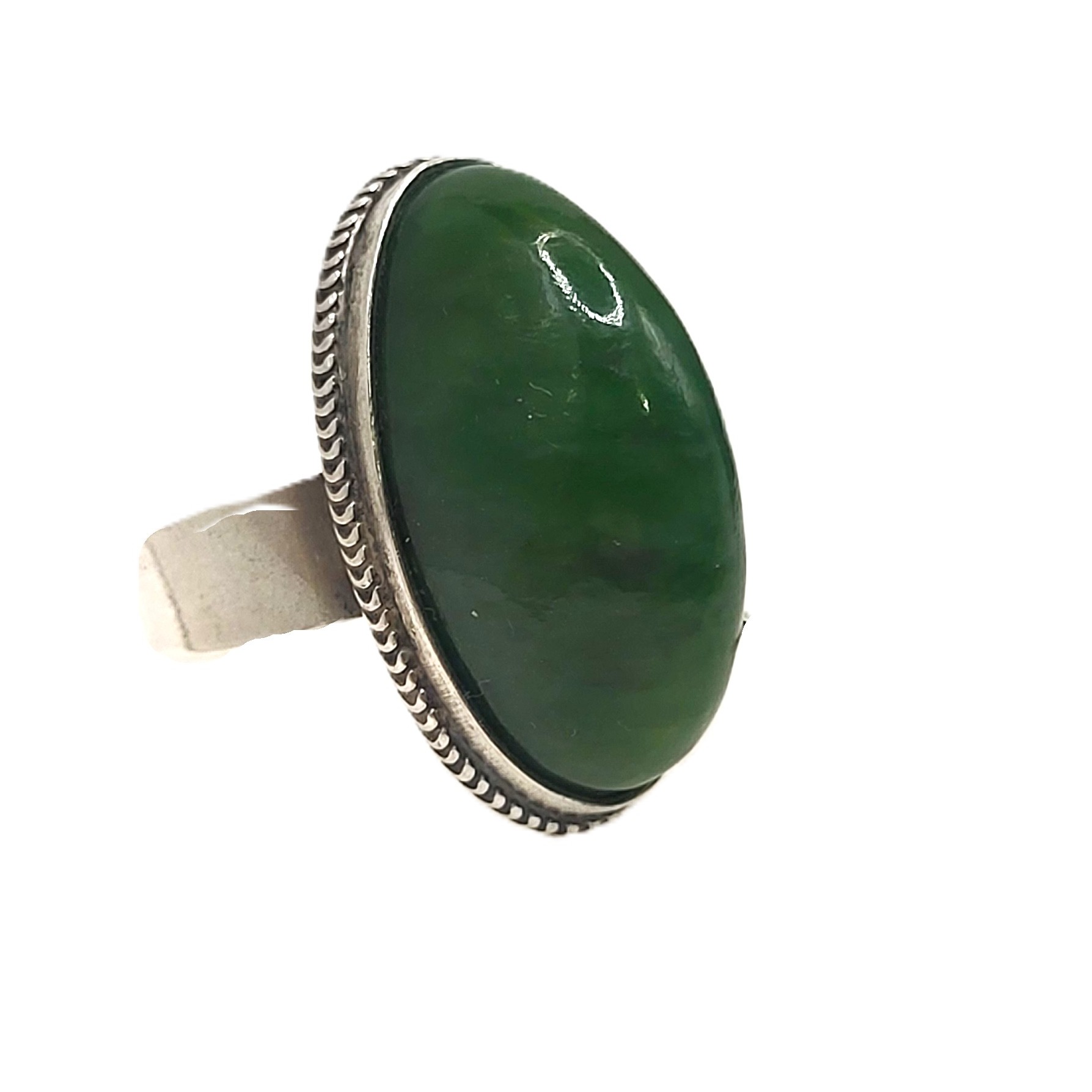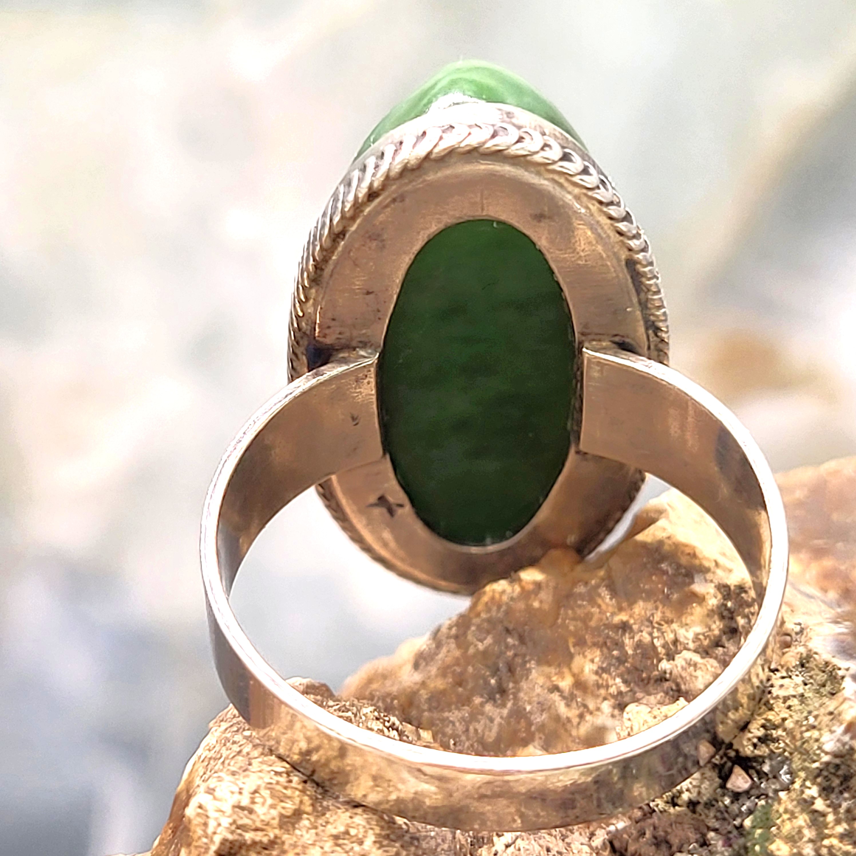 This sterling silver ring, believed to be circa 1970’s, is a statement ring featuring an approximate 24mm x 16mm x 10mm oval, genuine dark green nephrite jade oval cabochon. This is a simple bezel-style ring with a plain, wide shank.  The silver mark is on the inside of the 6mm shank and indicates the ring was made in the Soviet Union with….See sizing details and other information below. AdminCode: KJB9213/hhh