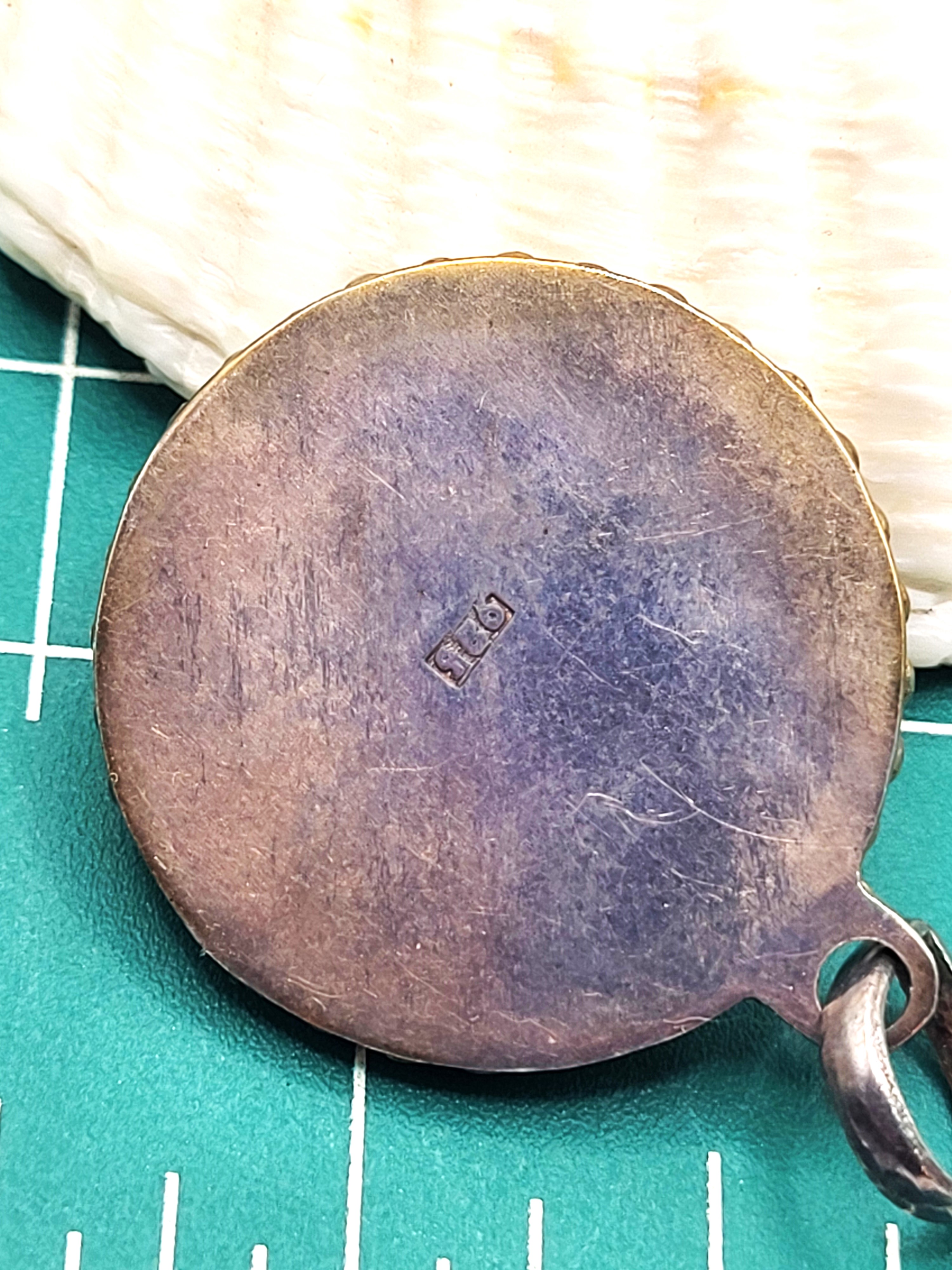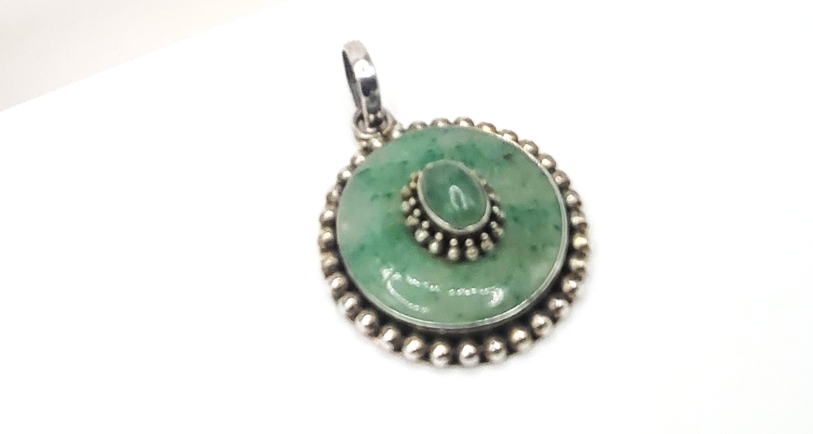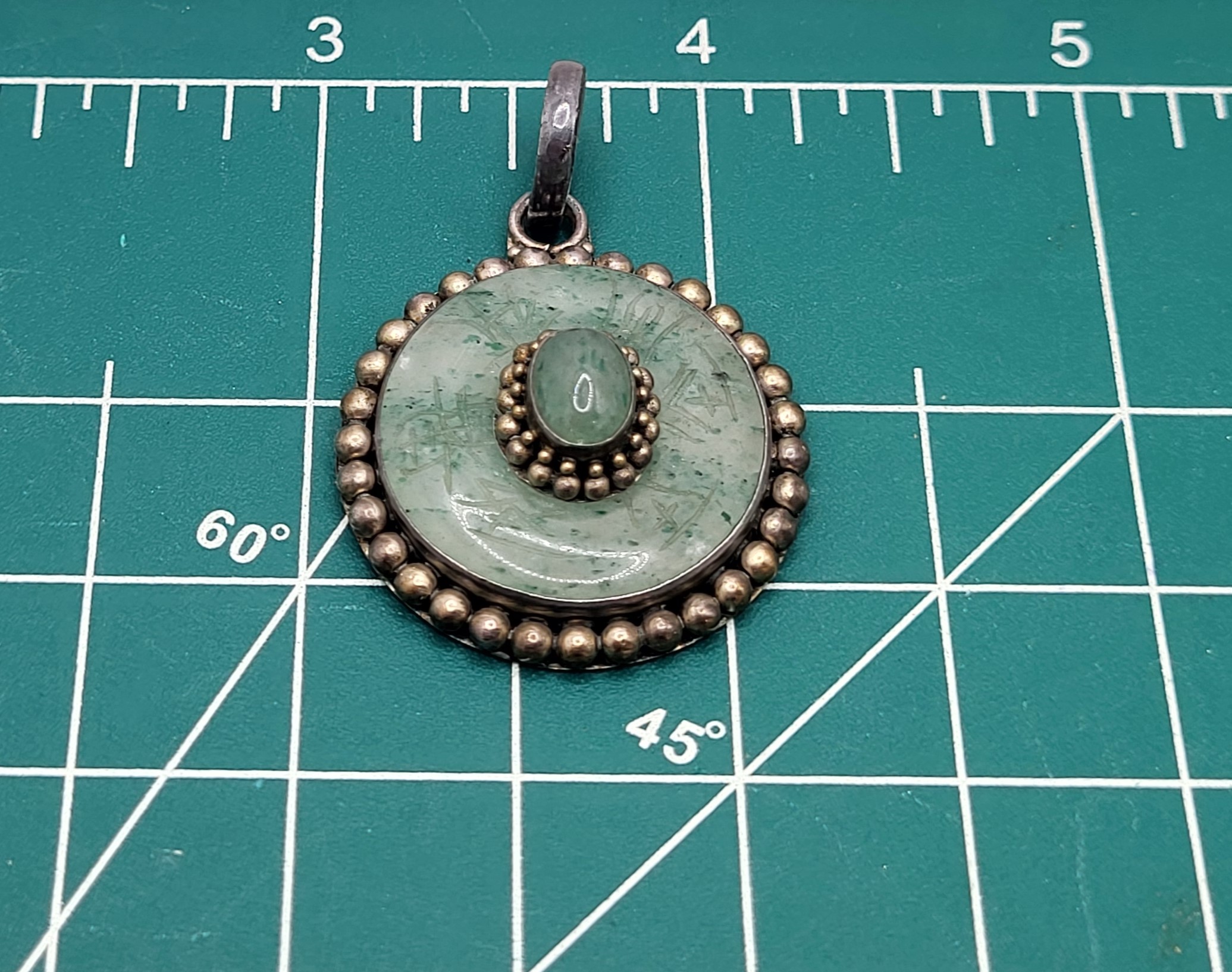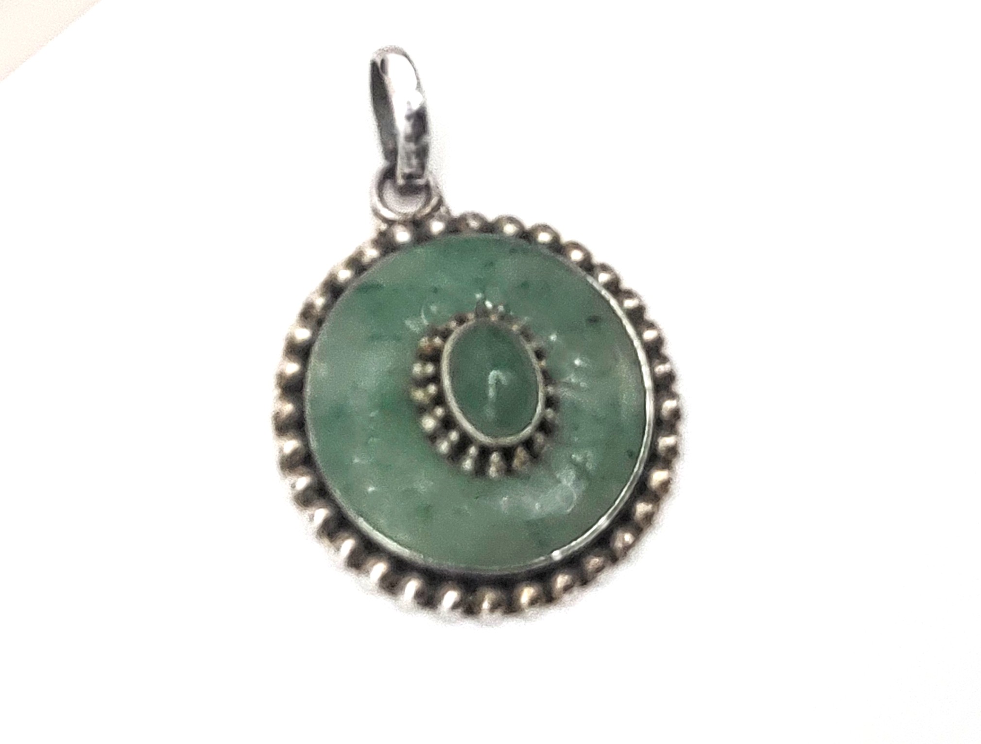 This is a vintage sterling silver pendant (circa 1960’s) that features an oval-shaped, cabochon jadeite stone that measures 7x5mm and has a double beaded frame that is centered inside a round pi stone-like disc set in a smooth bezel with a beaded border. The ‘pi stone’ jadeite is carved with symbols resembling Asian letters in 6 stations around the front face.. The bail is approximately 7.6mm and attached to an affixed ring at the top of the pendant. The back of the pendant is a flat, sterling silver disc with a die struck "925". The entire pendant is approximately 1.5" in diameter. Admin Code: 7277-1/12