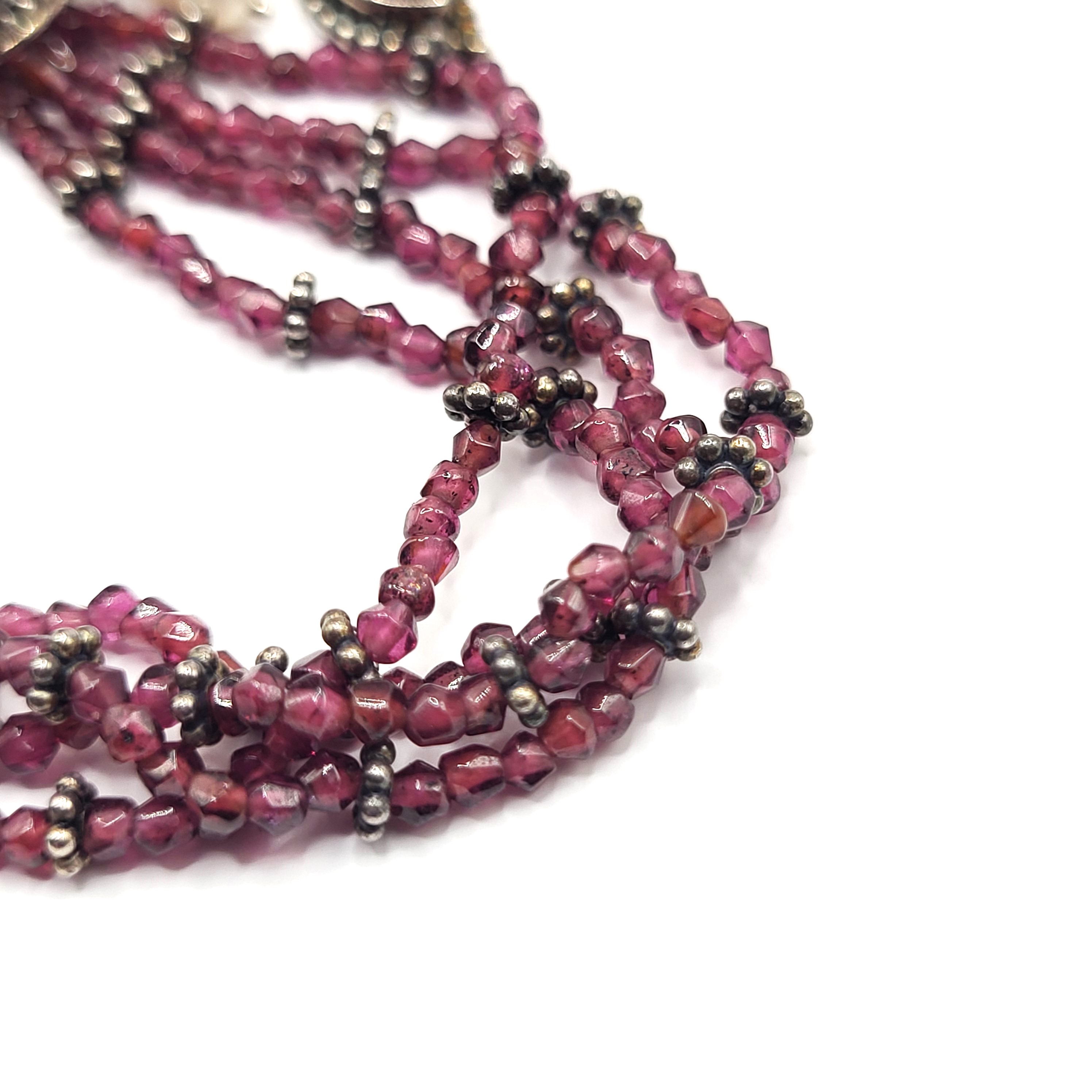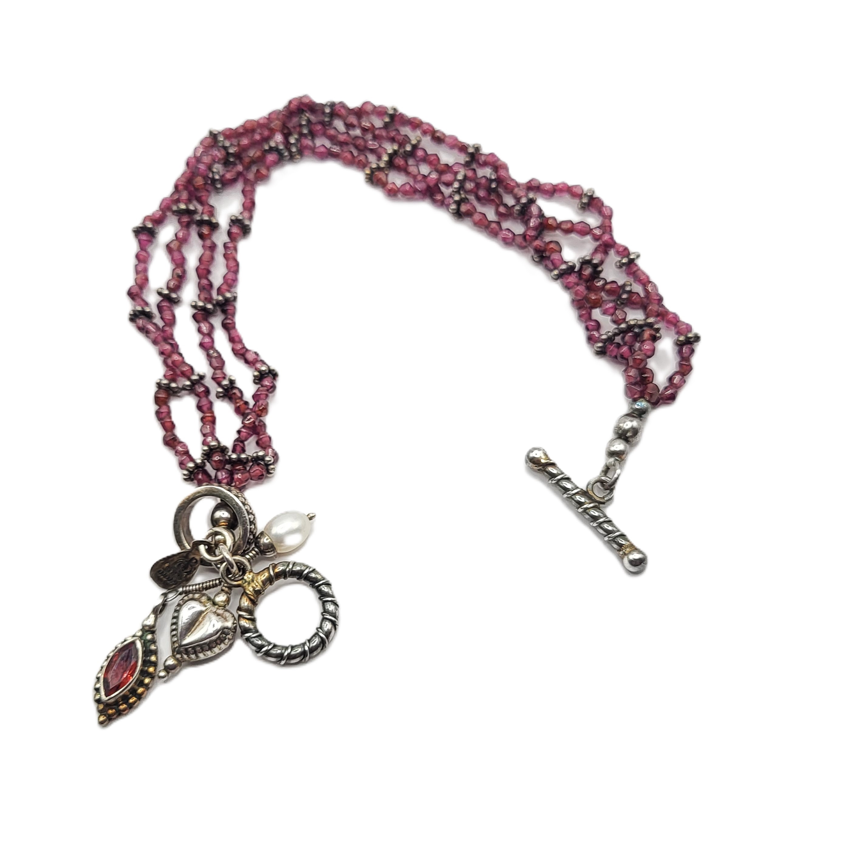 This sterling silver bracelet is designed with four strands of tumbled rhodolite garnet with beaded, sterling silver spacers throughout the strands and graduating sterling silver beads on each end. A sterling silver ring at the latch female end holds featured enhancers of a 5mm x 7mm pearl and an approximate .50 carat marquise-cut Almandine garnet, and a sterling silver heart. The bracelet is approximately 7.5" long with a toggle clasp. 19.14 grrams. Admin: 33119/5lh