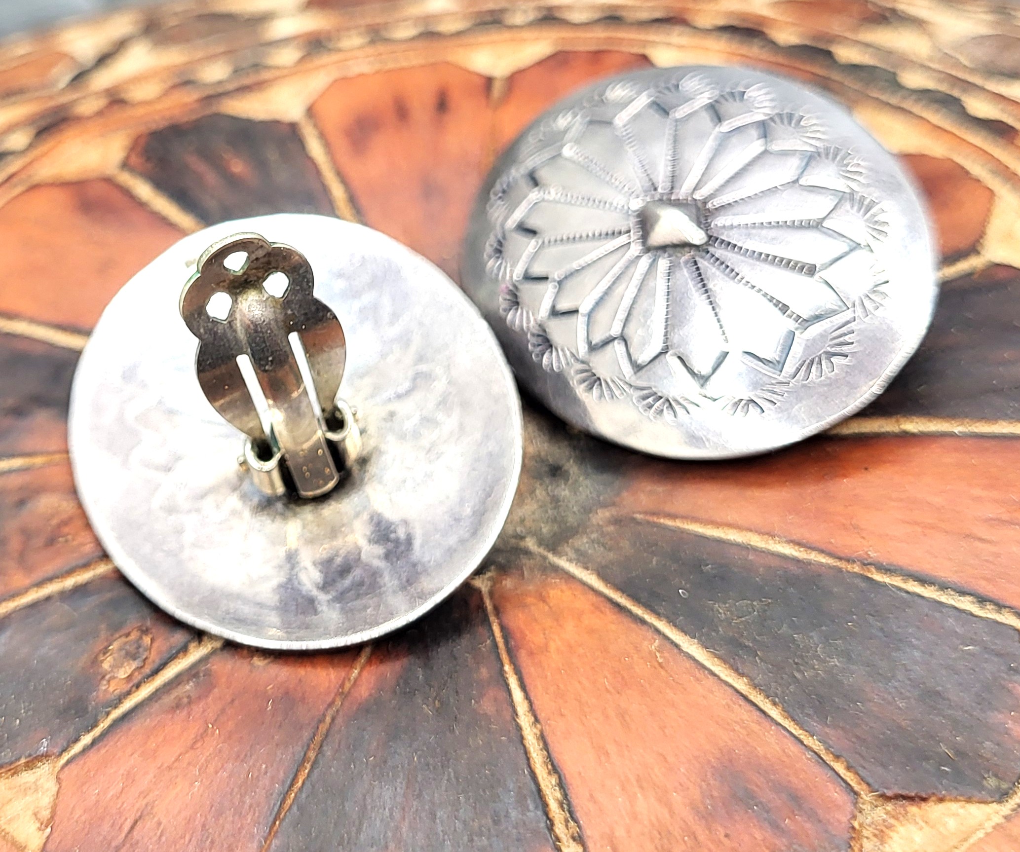 These sterling silver earirngs are die-struck "links" resembling those of the iconic Western wear "concho or concha" belts. The central diamond shape with radiating pointed feathers and a rising sun on the end of each is a known Navajo design. Although there is no hallmark on these earrings, they resemble the work and designs of the late Ernest Bilagody, a Navajo native American. The earrings measure 1.75" x1.25" and have clip-on backs and are believed to be circa 1985ish. Admin: 33120/715.