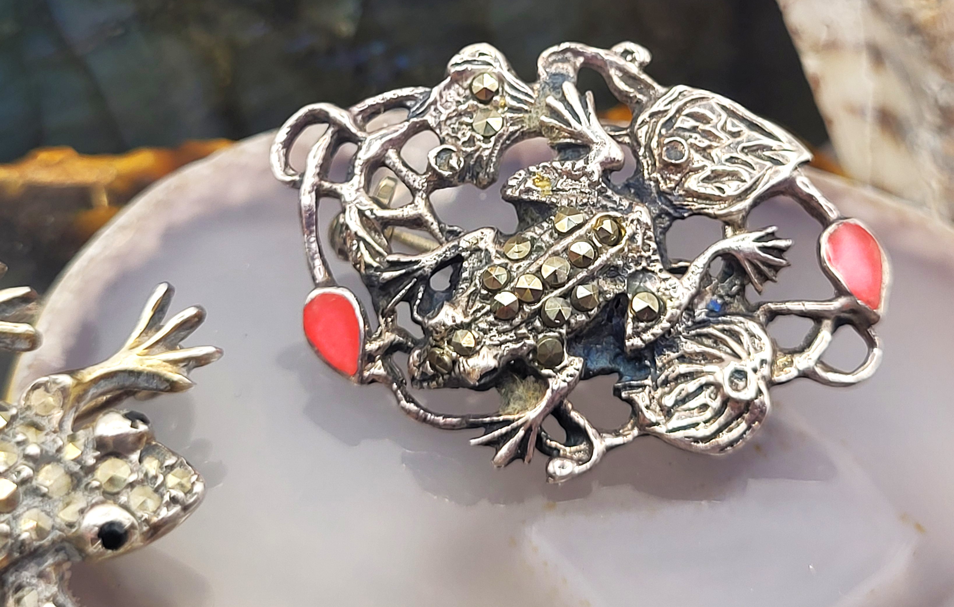 These brooches are made of sterling silver and adorned with marcasites. One brooch is additionally adorned with orange enamel. The enamel frog with lily pads is stamped .925. The "climbing" frog is stamped "Sterling" and "Germany". Both have locking "C" clasp closures. Admin: 33120/25bl 300026G