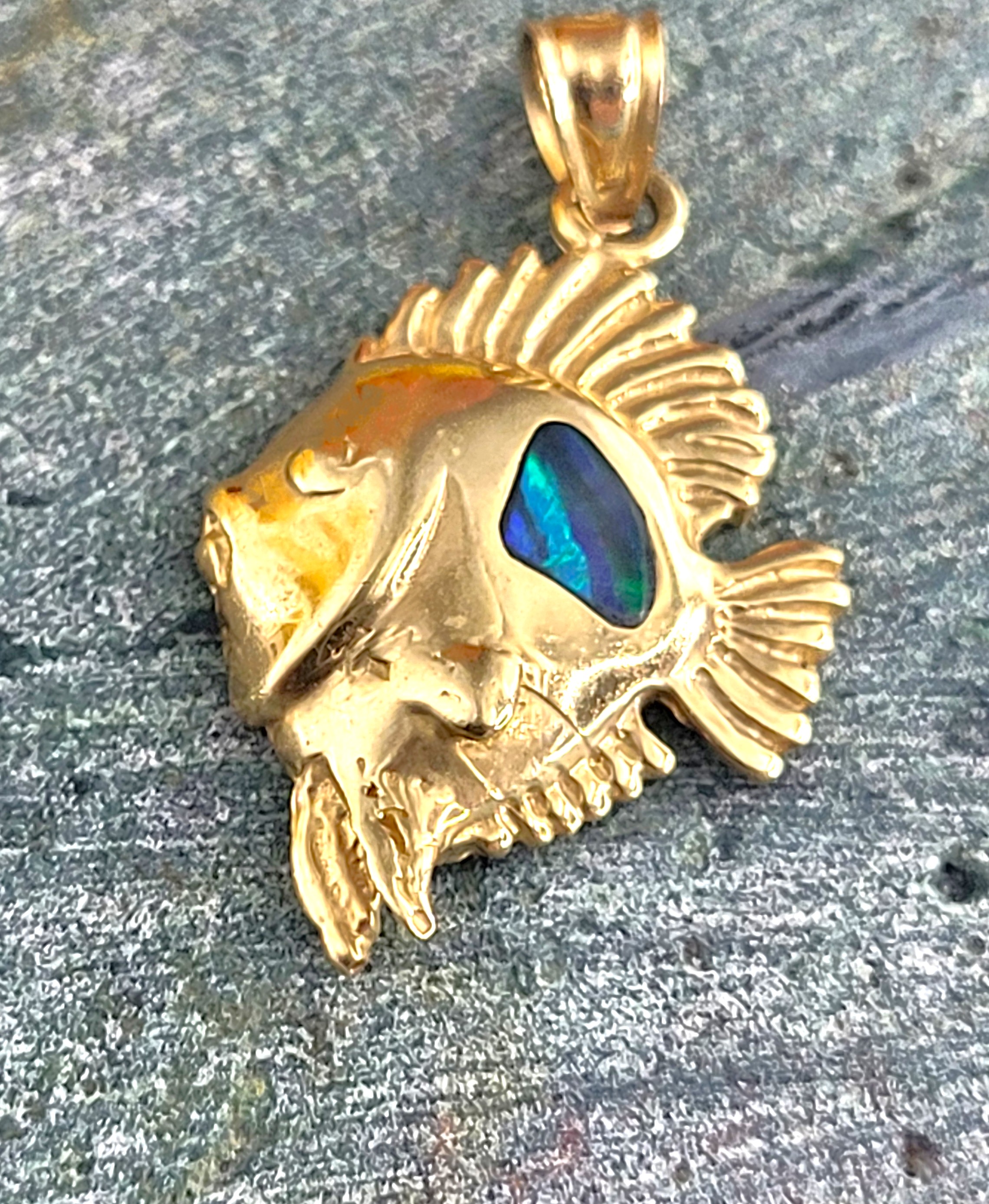 This adorable baby sunfish is happy to hang around your neck, soak of some sun while taking a sleepy-time nap, any yet still able to brightly gleam at everyone you pass! It is approximately 1" long by 5/8" wide. The inlaid lab-grown black opal measures approximately 3mm x 5mm. The solid bail can accommodate a 3mm wide chain. Admin Code: KMT11124/op-105