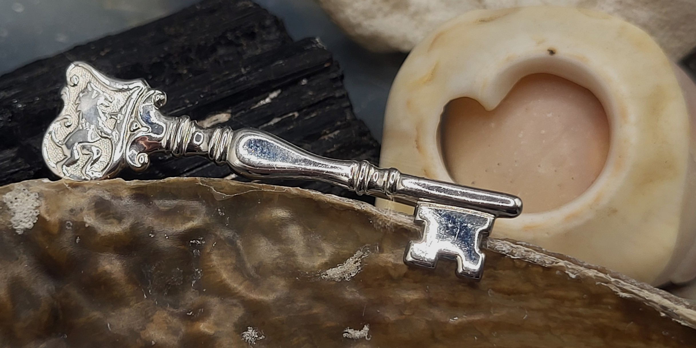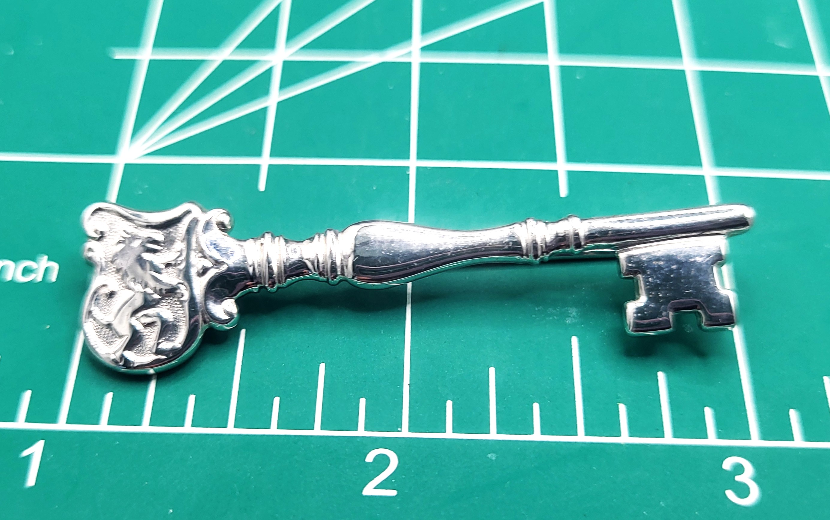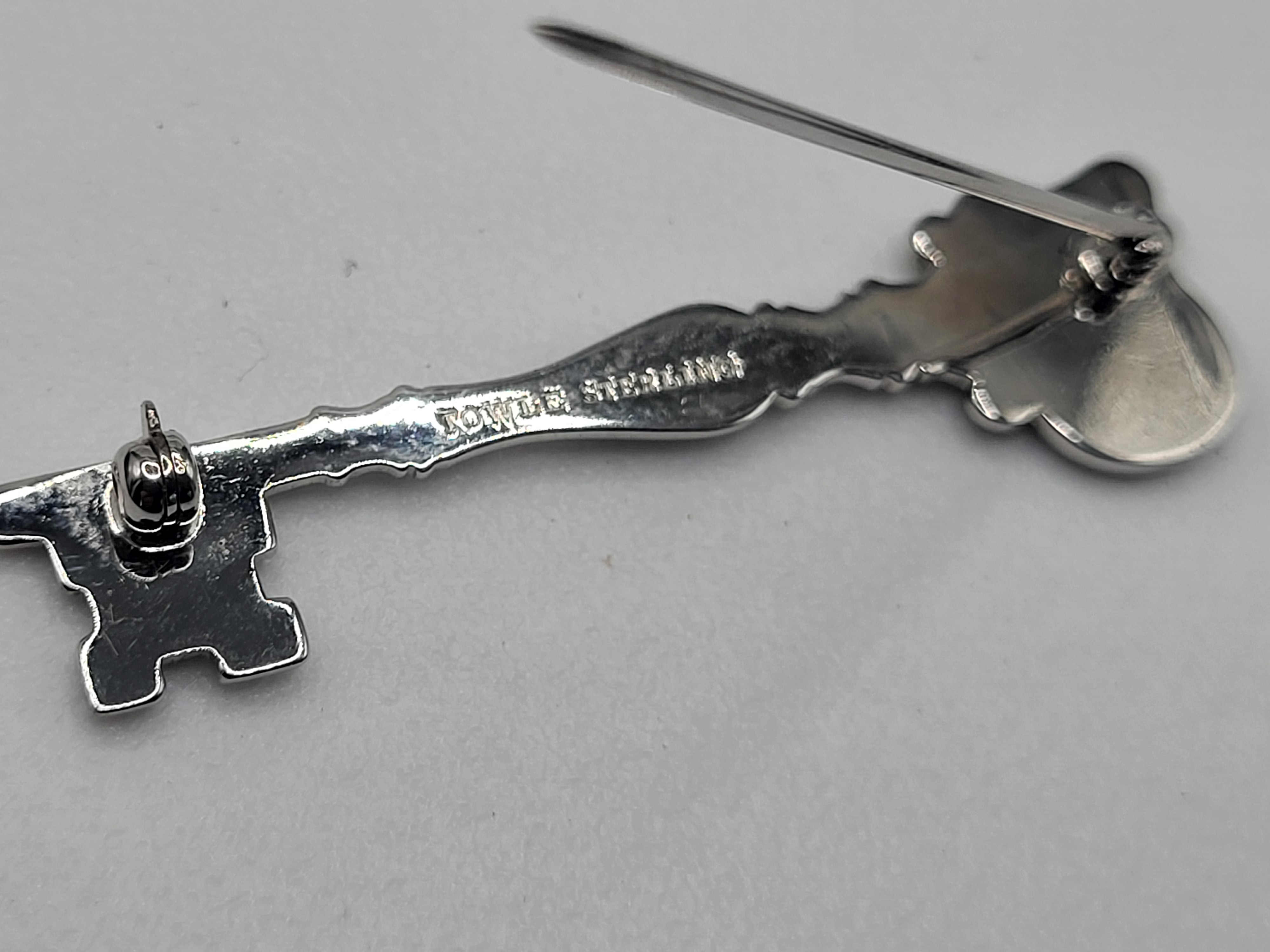 Bearing the Towle hallmark on the crest of the key, this sterling silver brooch is a beautiful example of key jewelry. It is approximately 2" long and has a locking "C" clasp that works well. 5.28g Admin: 33120/10.e