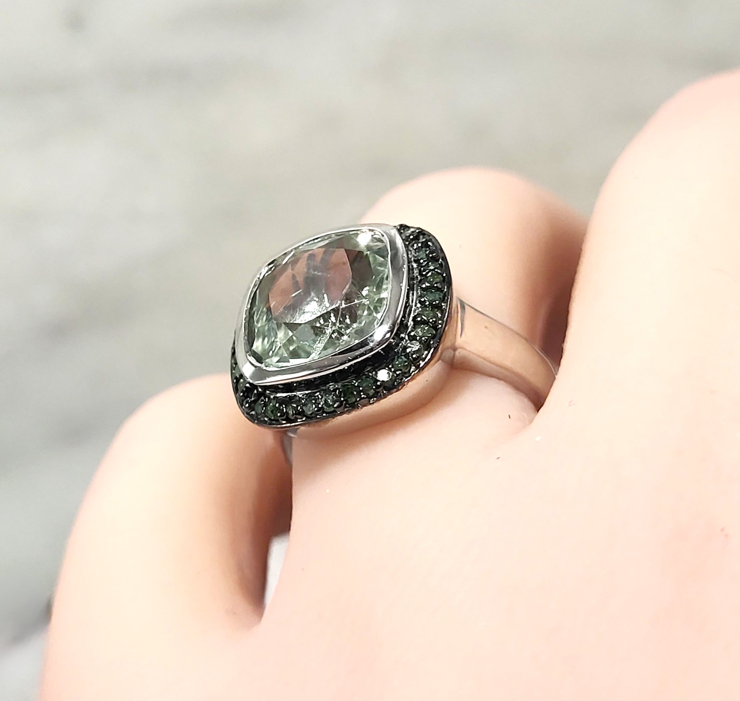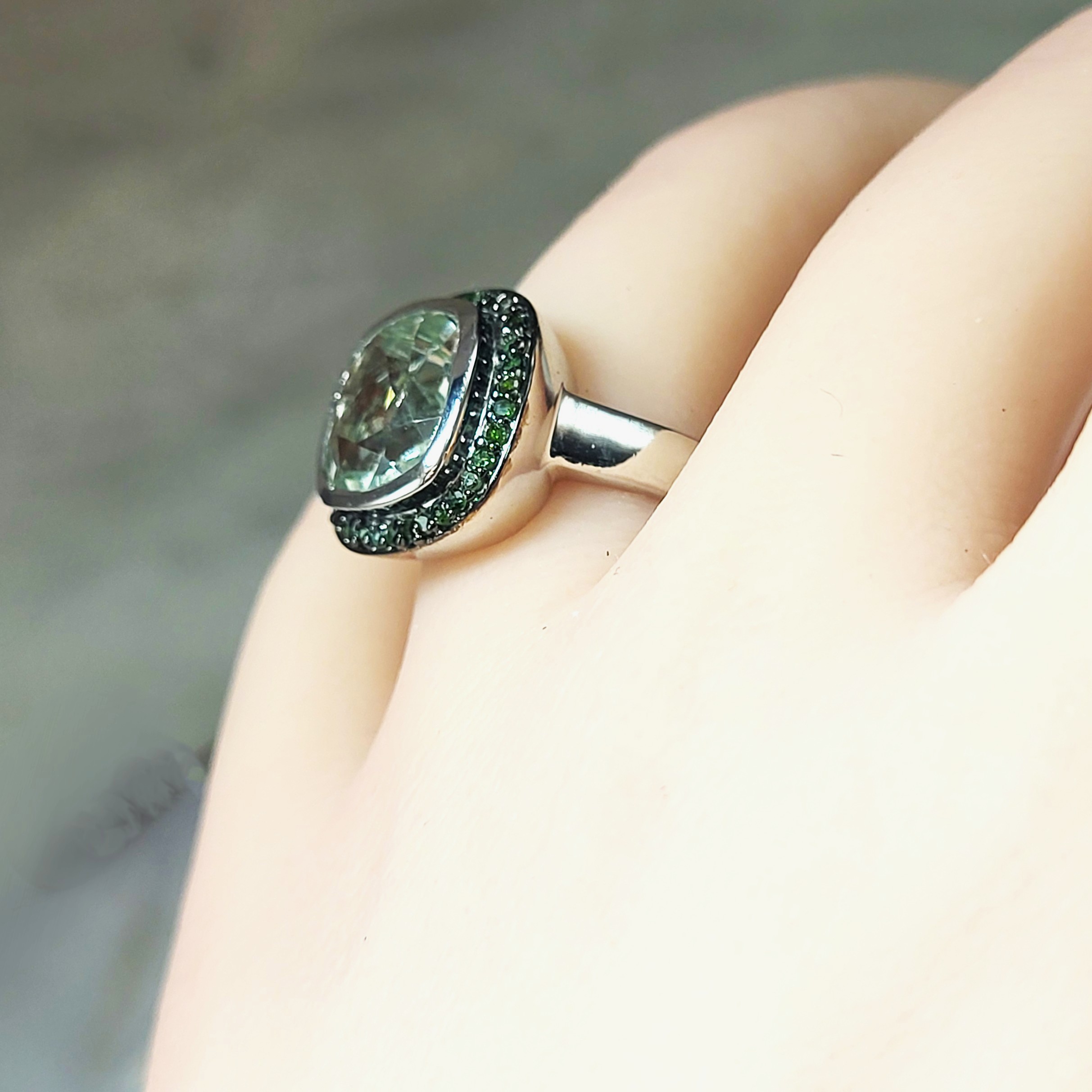 Your friends will be green with envy over this designer-inspired, sterling silver ring. It features a 4.96 carat (10mm), cushion-cut, bezel-set, green amethyst wrapped in a thick frame of .23 carats of round, brilliant-cut, natural, UNTREATED, green diamonds. The wide, polished bezel walls, broad shoulders, and thick shank add to it’s elegance. The ring is US size 6 and has a lovely, ornate, supportive undergallery. A tarnish-resistant rhodium finish will keep this ring gleaming for years to come. Please read sizing options and other important informaton below. AdminCode: KQP/777912/wp