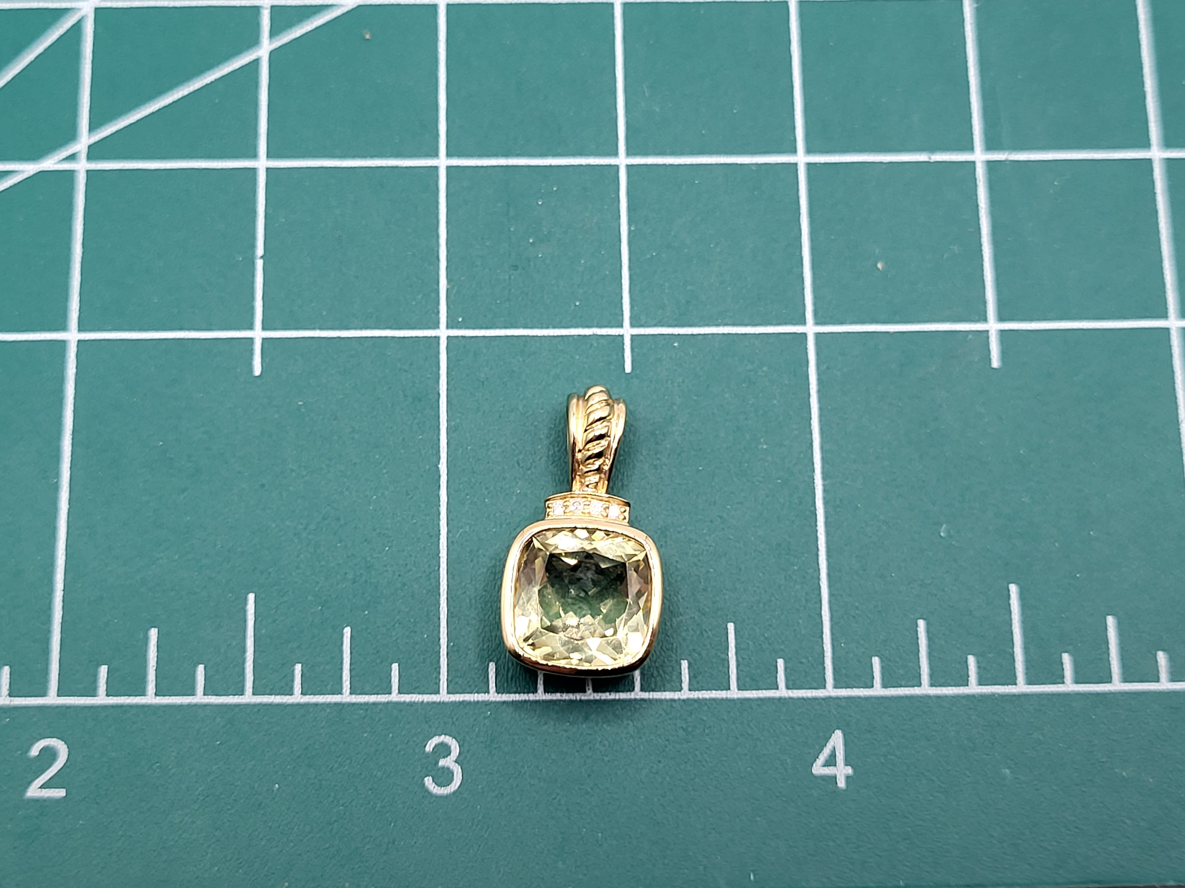 This is a 14 karat yellow gold pendant that features an illuminating 3.36 carat cushion-cut, bezel-set lemon quartz and .02 carats total weight of round, brilliant-cut, H color, SI2-I1 clarity diamonds for accent along the topl The pendant has a solid bail with a gold bead finish that can accommodate an approximate 2.5mm wide chain. 2.2 grams
