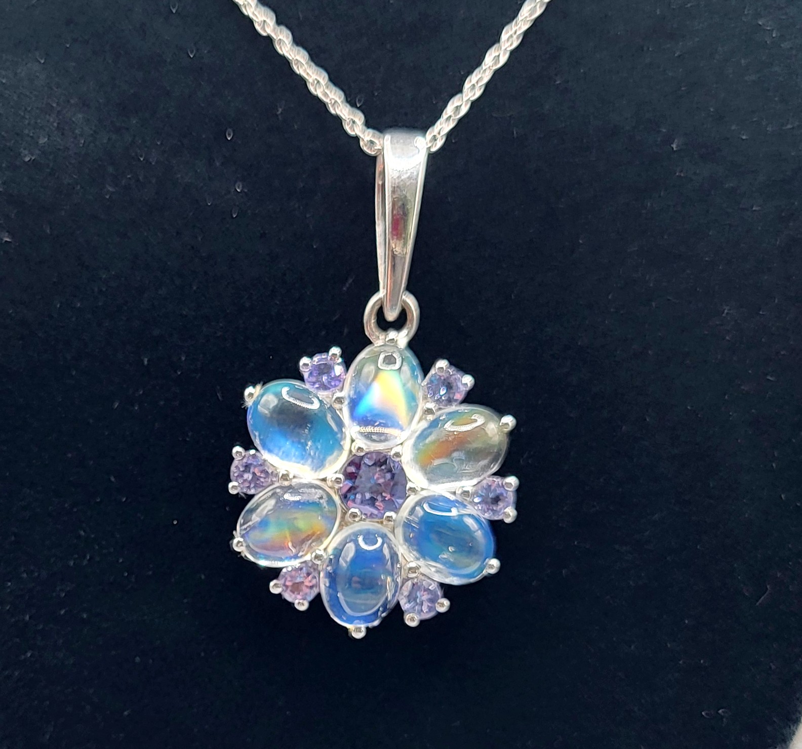 . – #RainbowMoonstone #TanzaniteJewelry #SterlingSilverPendant #GemstoneNecklace #MoonstoneMagic #TanzaniteGlow #FloralJewelry Atomic13Auction #SpectralBloom #JewelryWithStory #BidFairExclusive #MysticGemstones #HandcraftedElegance #MoonstoneAndTanzanite #JewelryCollectorsDream.