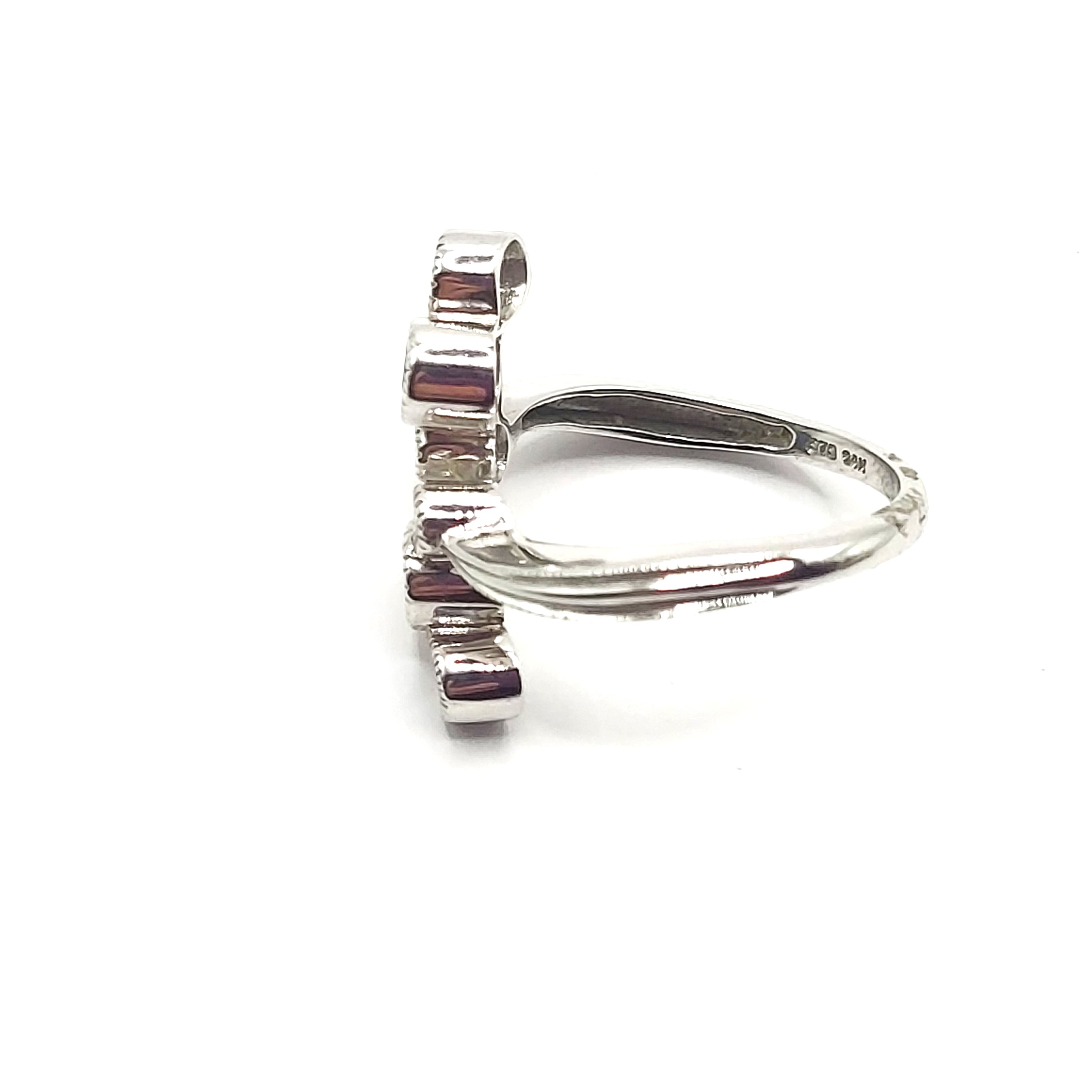 This is a 14 karat white gold ring with approximately .67 carats total weight of round, faceted, genuine blue sapphires set into milgrain bezels with approximately .08 carats total weight round, brilliant-cut, H-I, SI2 clarity diamonds also in milgrain bezels forming a staggered line. The ring is size 6.75 and 3/4" long between the knuckles. See sizing details and other important information below. Admin: 33109/16lhg