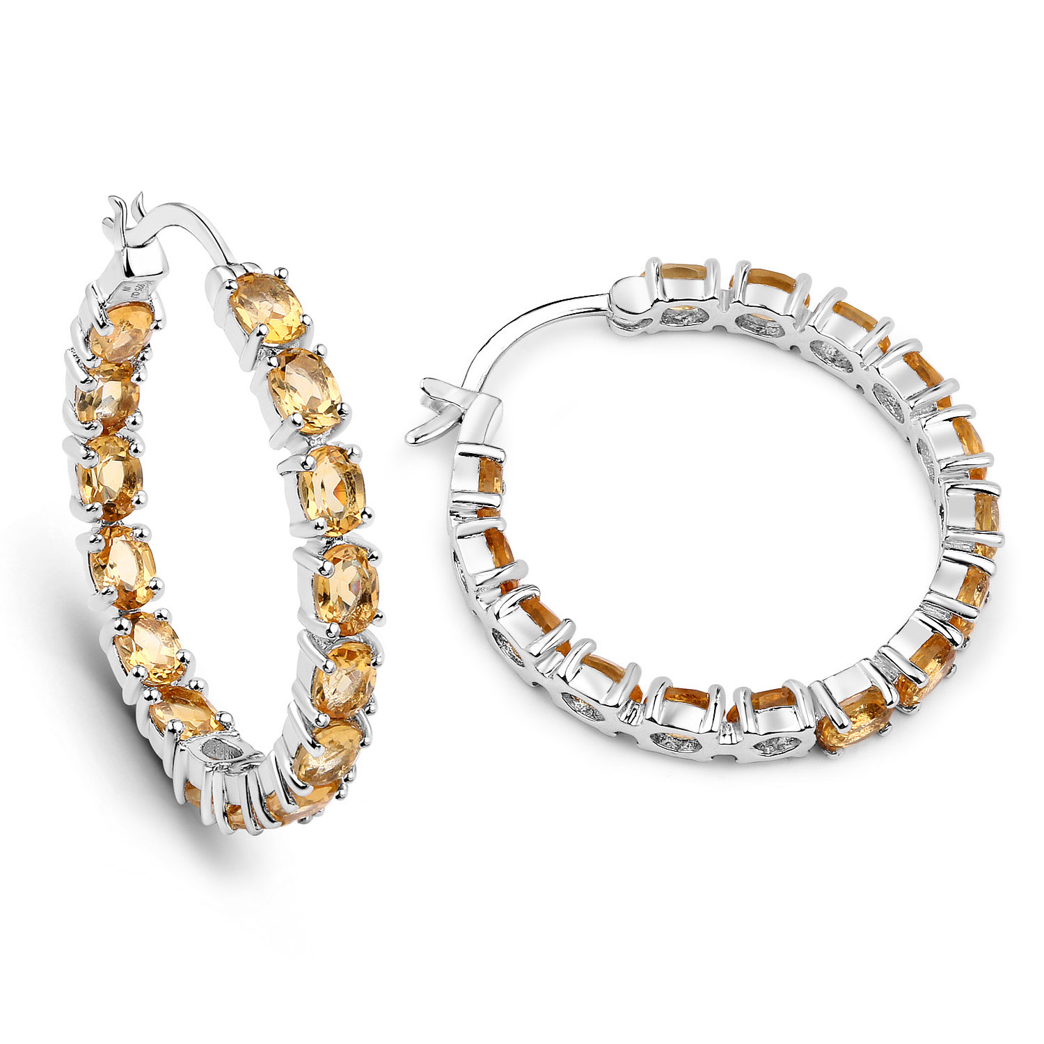 These sterling silver earrings reveal the 4.80 carats total weight of oval-cut, prong-set, genuine citrine gemstone with the inside-out design. The earrings attach to the earlobe with hinged posts and a clip on the rear of the hoop. They are approximately 1 1/8" diameter and have a tarnish-resistant rhodium finsih to keep them shining for years to come. See below for more information. AdminCode: Q98445/gi
