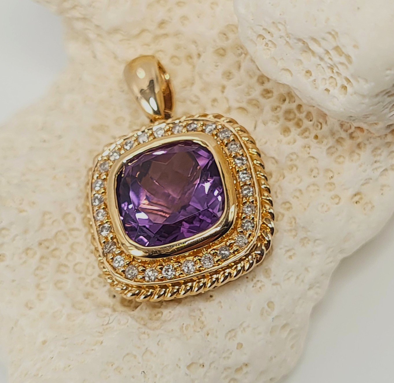 This is a 14 karat yellow gold pendant that features a 3.25 carat cushion-cut, bezel-set, genuine Brazilian amethyst with .16 carats total weight, H-I color, SI2-I1 clarity diamonds in the floating halo. The pendant is 3/4" diameter and has a solid bail that can accommodate up to an approximate 3.25mm chain,