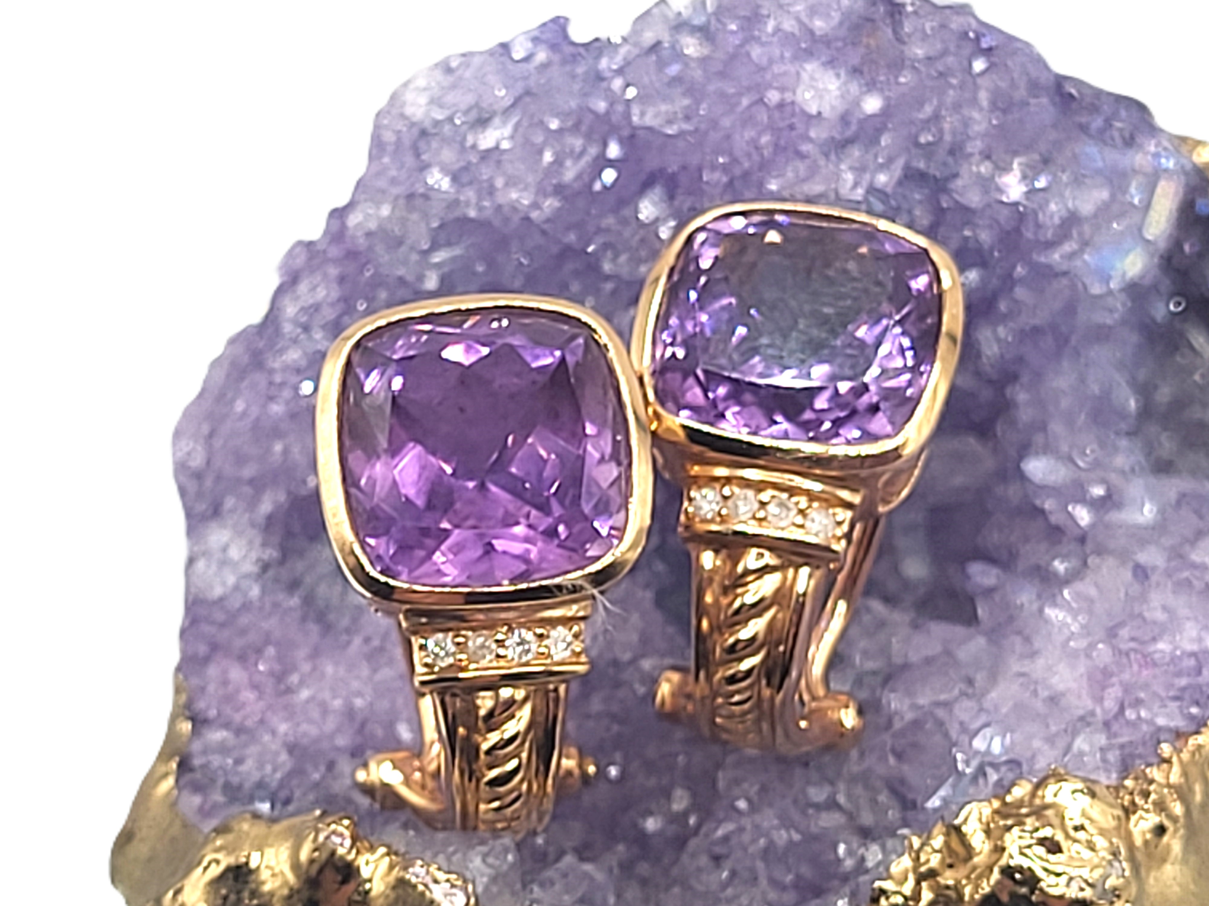 This is a pair of 14 karat yellow gold earrings, featuring 6.26 carats total weight of cushion-cut, bezel-set, genuine amethysts and .04 carats total weight of round, brilliant-cut, H, SI2, channel-set, accent diamonds. The earrings are approximately 3/4" long with a twisted rope design at the bottom that curves around to the closure, which is a post and an Omega back.