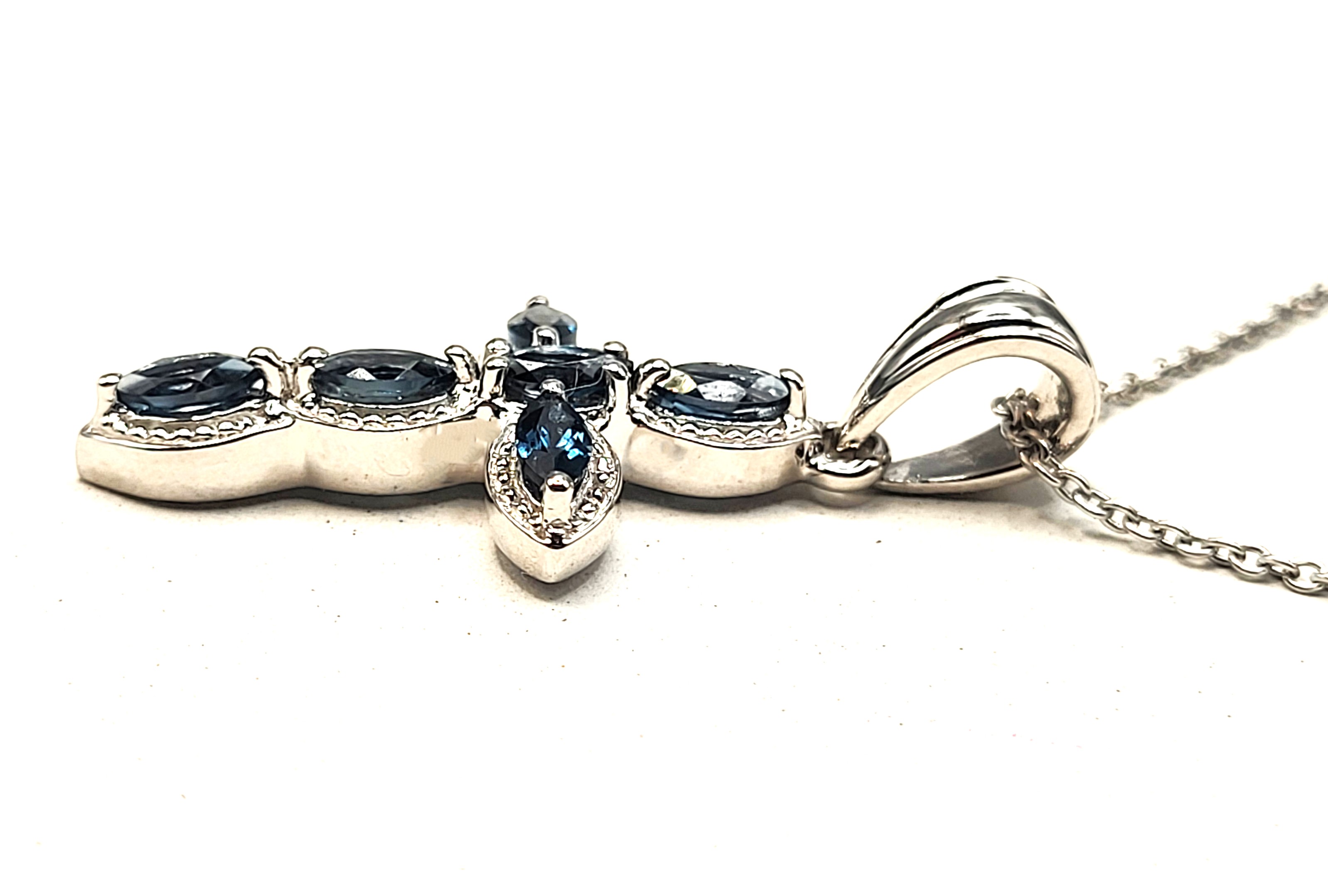 A graceful cross pendant crafted in .925 sterling silver with a shiny, tarnish-resistant rhodium finish features 1.02 carats total weight of marquise-cut London Blue Topaz gemstones. Their deep ocean hue radiates serenity and strength. The pendant weighs 4.64 grams and hangs from an 18" fine cable chain with a spring ring clasp. A solid bail accommodates up to a 3.5 mm chain, offering versatility for styling. Elegant and symbolic, this piece blends timeless devotion with refined craftsmanship. AdminCode: KRQ16/gb