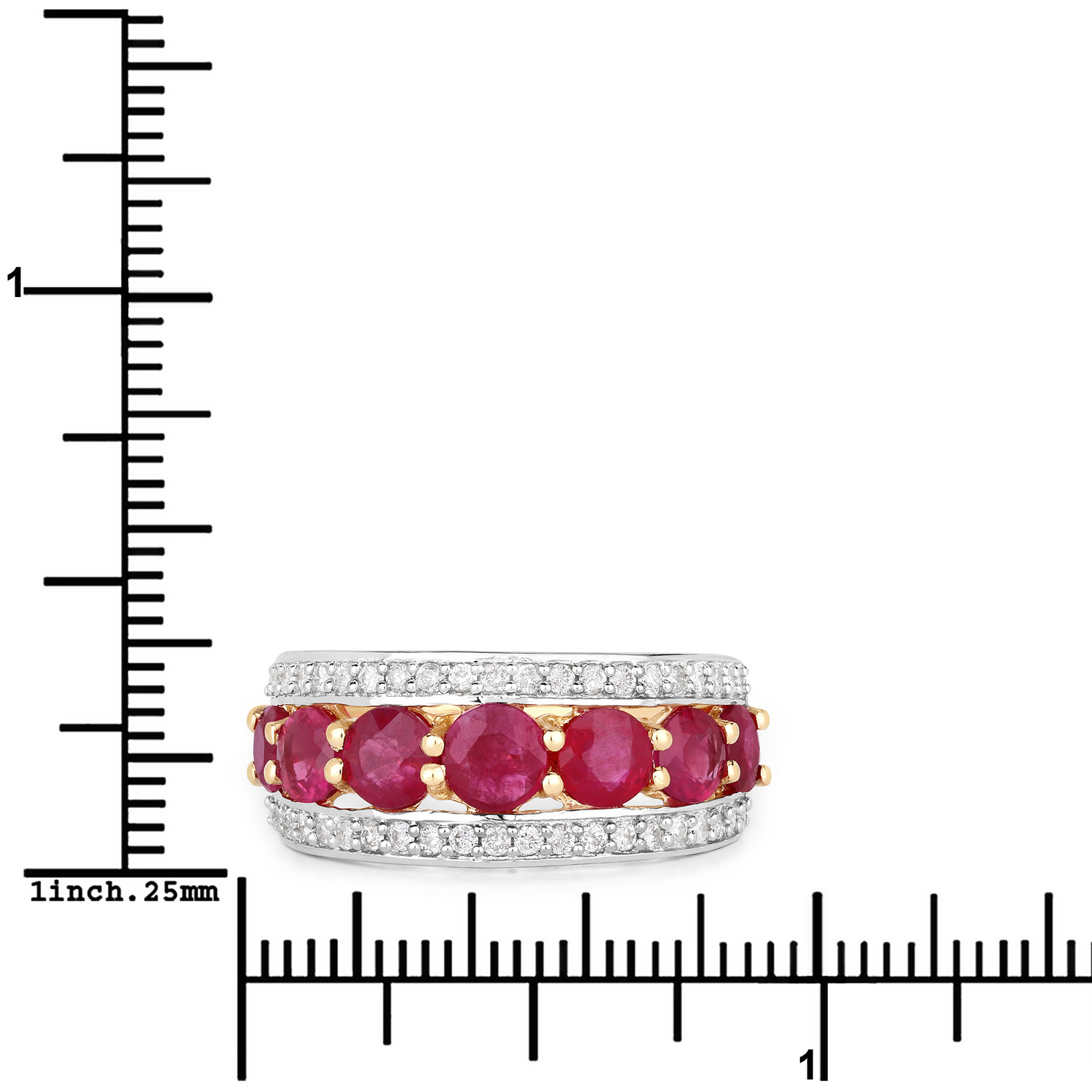 This 14 karat yellow gold ring can symbolize all of the above with 2.82 carats of round, faceted, genuine rubies prong-set in a tapered row with a border of round, brilliant-cut, H-I color, I1 clarity diamonds on each side, totaling .42 carats total weight. The ring is approximately 9.5mm wide at the top and tapers to a 2.25mm shank. The ring is US size 7. See sizing details below. Admin: Q5743/19-ong