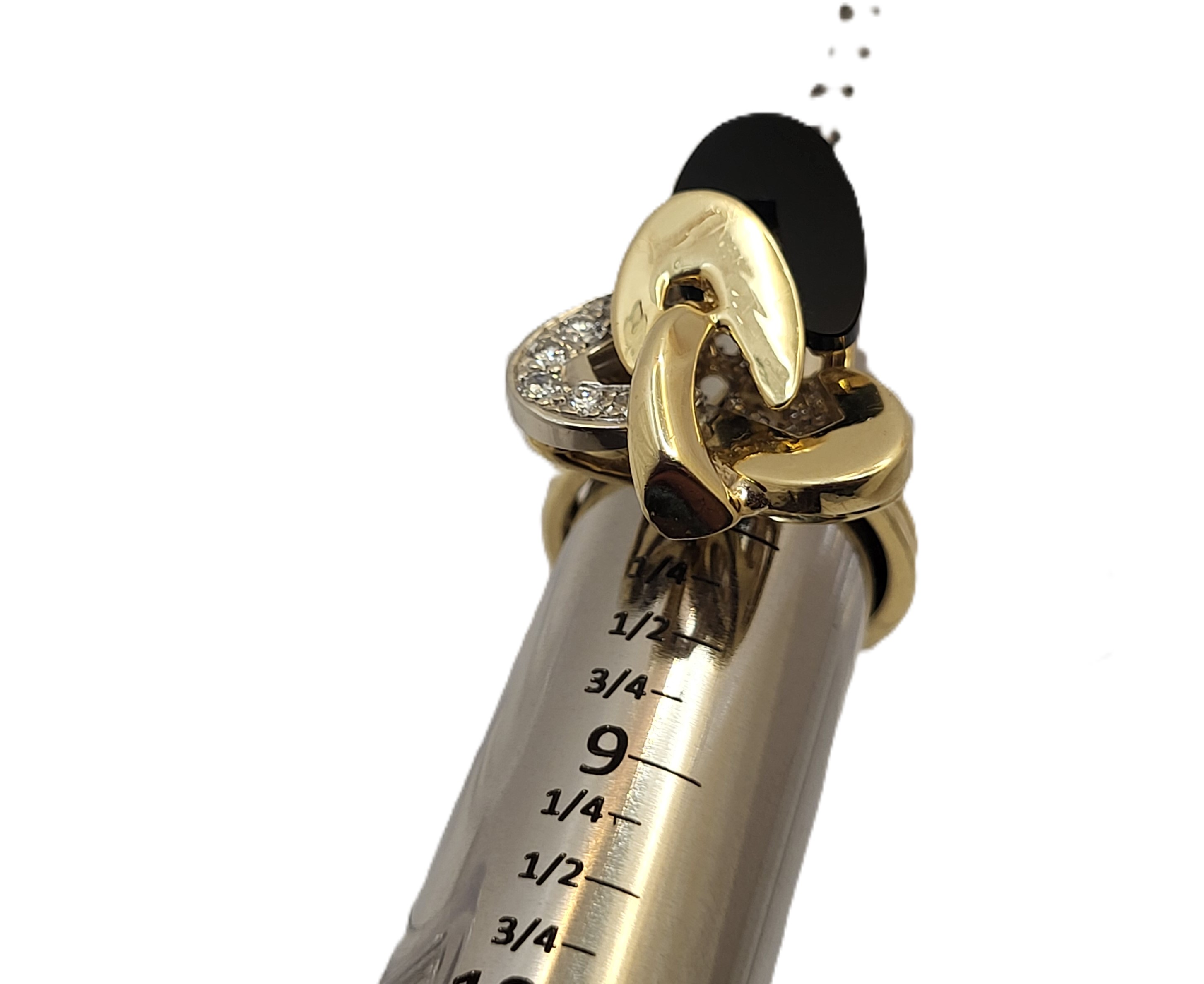 This 18 karat yellow and white gold ring features an ellipse carved from polished, black onyx and approximately .33 carats of round, brilliant-cut, H color, VS-SI clarity diamonds on the white gold ellipse. The top of this ring is approximately 1 1/8" in diameter between the knuckles of the finger and it has a uniquely carved gallery for support that is attached to the doubled ring shank that tapers from pinched at the top to approximately 5.25mm at the bottom. This ring is US size 9. See below for sizing detail and other information. There is a hallmark that has been obscured. The hallmark is either "R" or ends with "R". See Provenance Information Below. Admin:33110/9tli