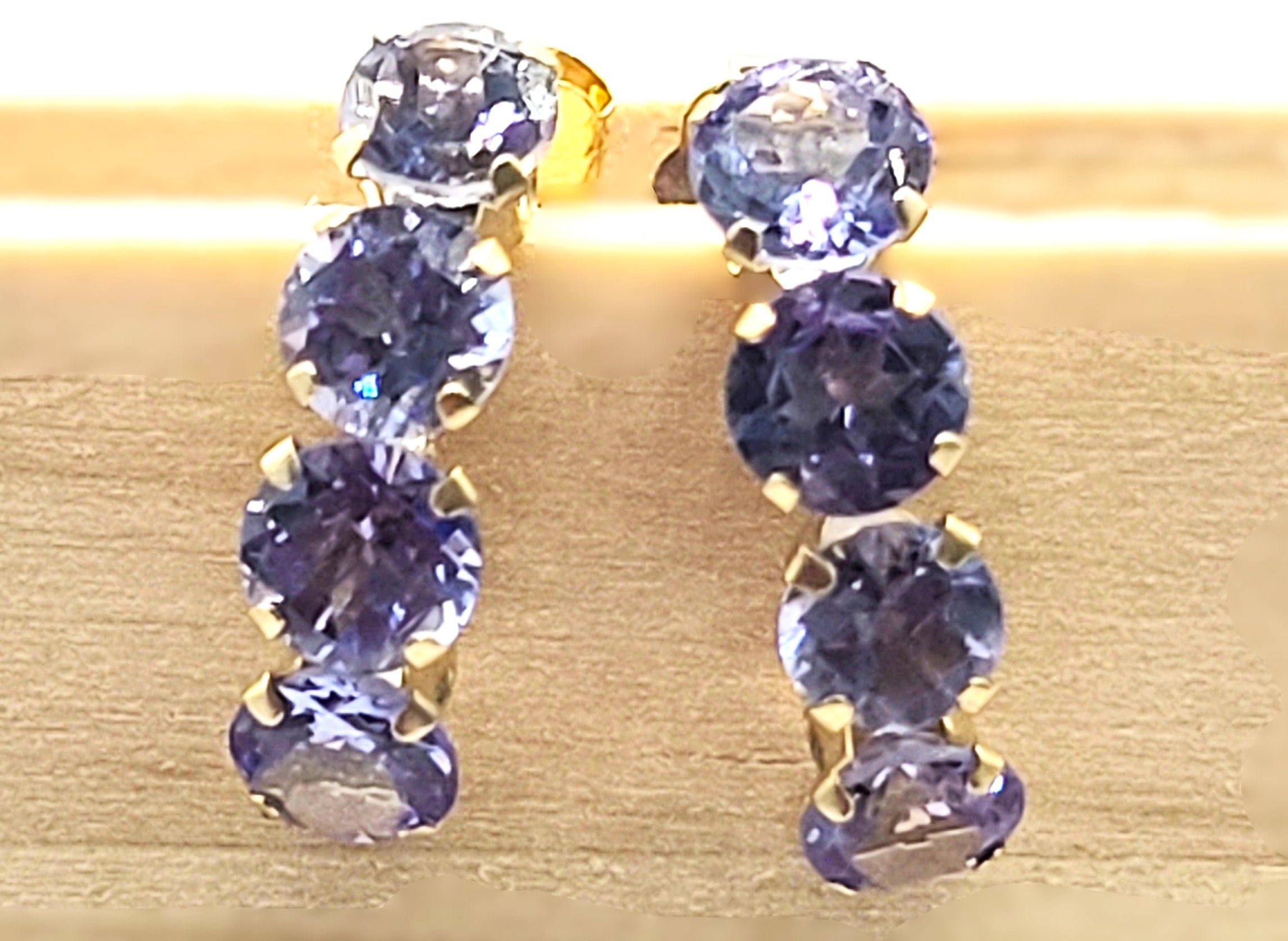 These 14 karat yellow gold earrings feature 2.00 carats total weight of round, faceted, prong-set, genuine tanzanite that are the perfect color for either winter or summer! They are approximately 5/8" long and 3/16" wide and attach to the earlobe with posts and friction backs. Admin:G11241/29brt