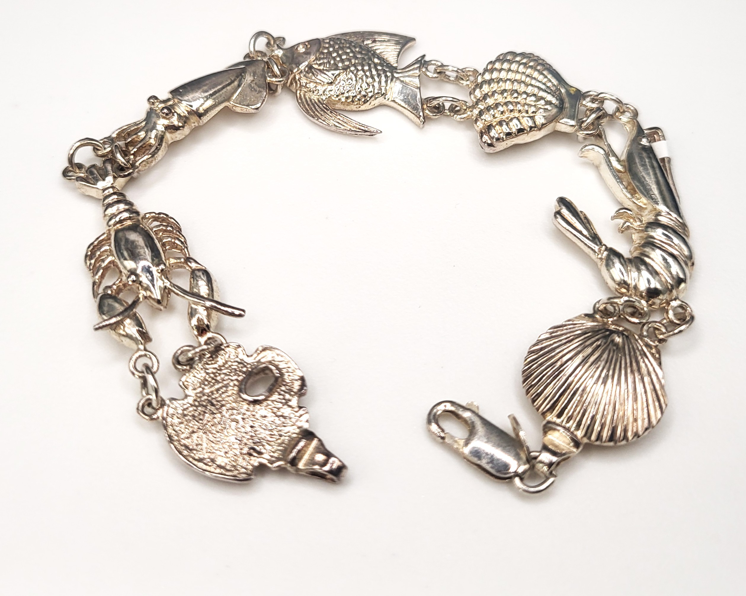This sterling silver bracelet stands out from the rest as it shines a light on the under-represented! Featured are the clam and scallop shells, the shrimp and squid, and a lobster, an angelfish, and possibly a keyhole urchin. The bracelet is 7.5" long and fittingly closes with a lobster clasp! 19 grams. AdminCode: 33121/4-be