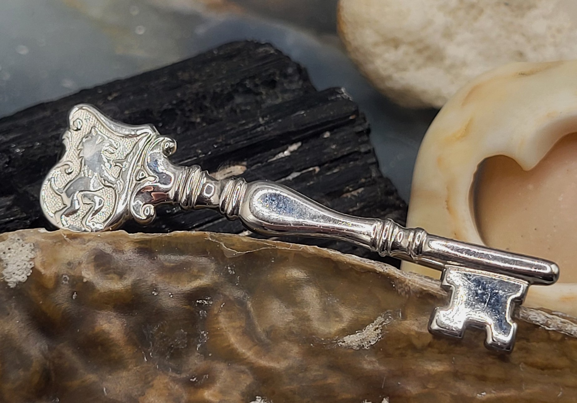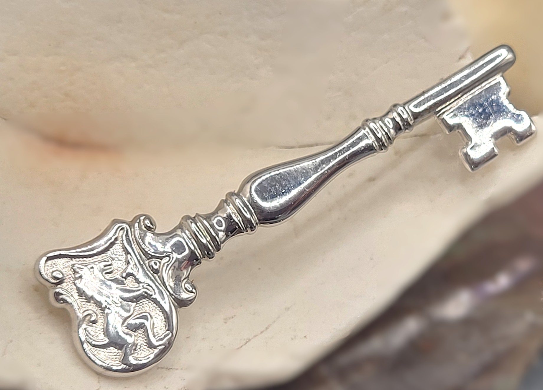 Bearing the Towle hallmark on the crest of the key, this sterling silver brooch is a beautiful example of key jewelry. It is approximately 2" long and has a locking "C" clasp that works well. 5.28g Admin: 33120/10.e