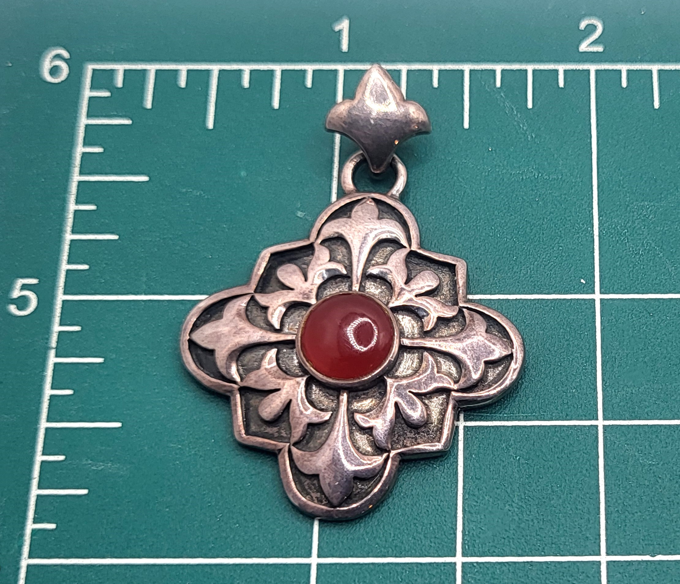 This sterling silver pendant features an approximate 9mm round, polished Carnelian cabochon inside the figure of a Fleury cross in a quatrefoil frame. The bail is hidden behind the fleur-de-lis as the top of the cross and can accommodate an approximate 4.5mm thick chain. The pendant is approximately 1 3/8" in diameter. 7.7 grams. Admin: 33120/5bt