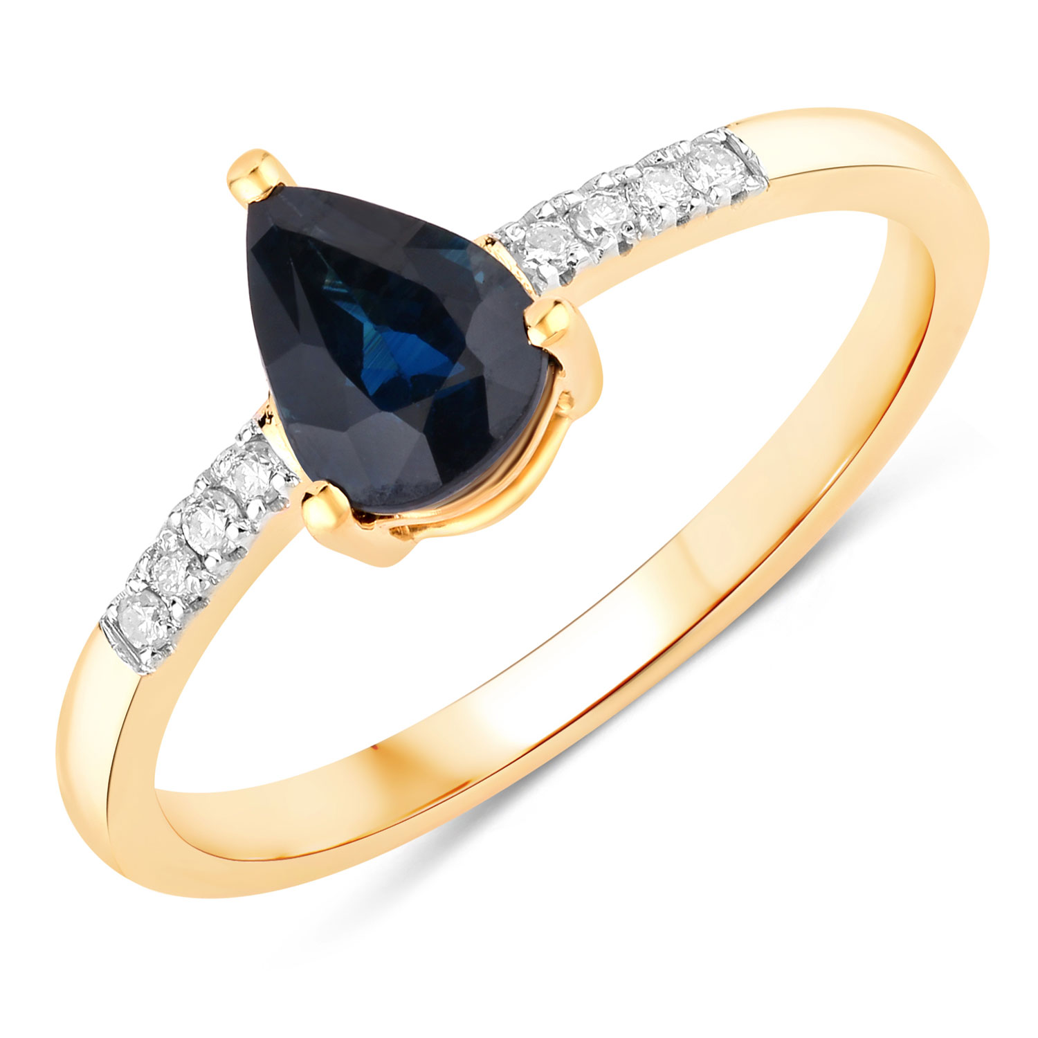 This 14 karat yellow gold ring is excellent for stacking with other rings, or to be worn alone in the minimalist style. Featured is a .80 carat, pear-cut, genuine blue sapphire that is prong-set on a bridge ring with .06 carats total weight of round, brilliant-cut, H-I color, I1 clarity diamonds on the classy, slender shoulders. Thr ring is US size 7. See sizing details and other information below.