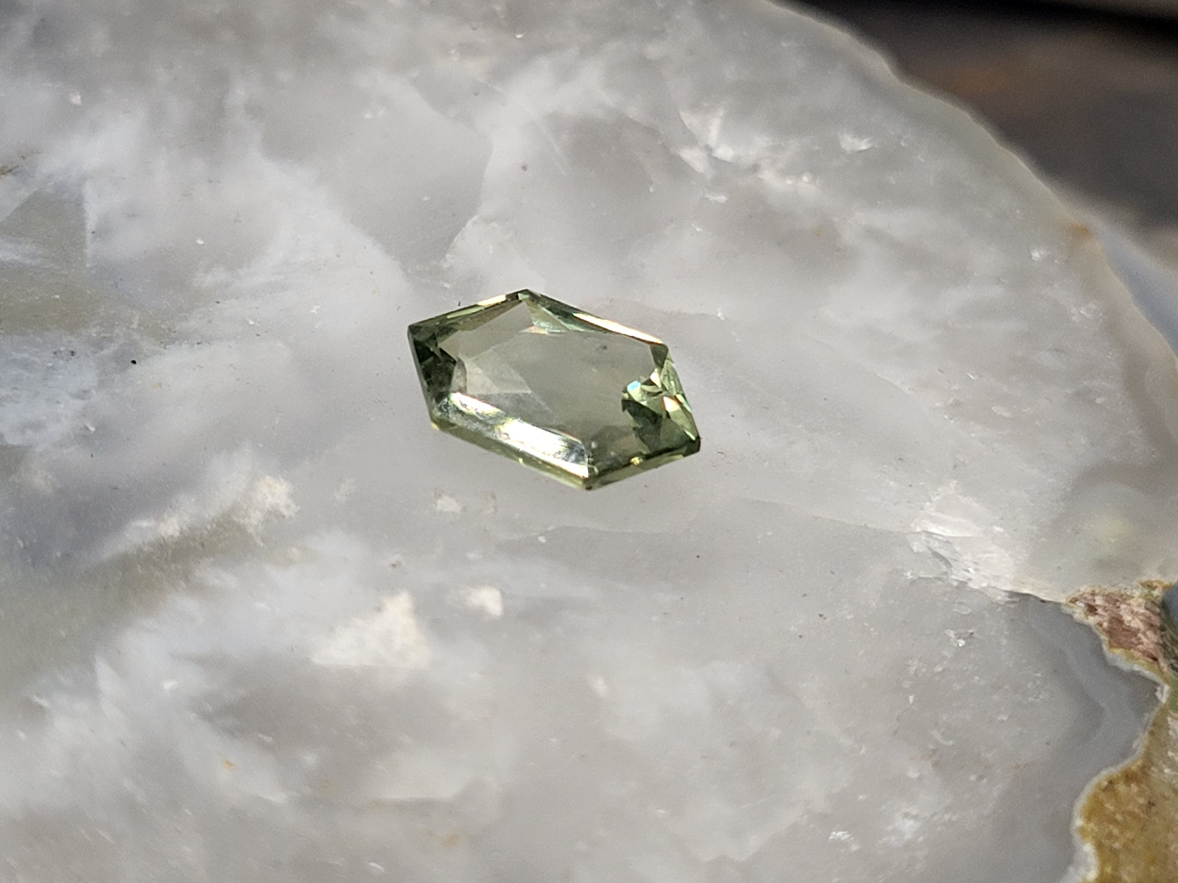 A study in subtlety and geometry, this 1.58 ct Montana sapphire glows with a light yellow hue that shifts gently across its five-sided silhouette. The pentagonal cut adds architectural charm, while hints of polychromatic shimmer suggest a quiet spectrum beneath the surface—sunlight caught in crystal form. Whether viewed as a citrusy prism in a golden whisper or the pine green of a cool forest, this sapphire invites interpretation. Its Montana origin and exceptional clarity* make it a versatile choice for collectors drawn to rare shapes and soft radiance. Admin: BK5/nog