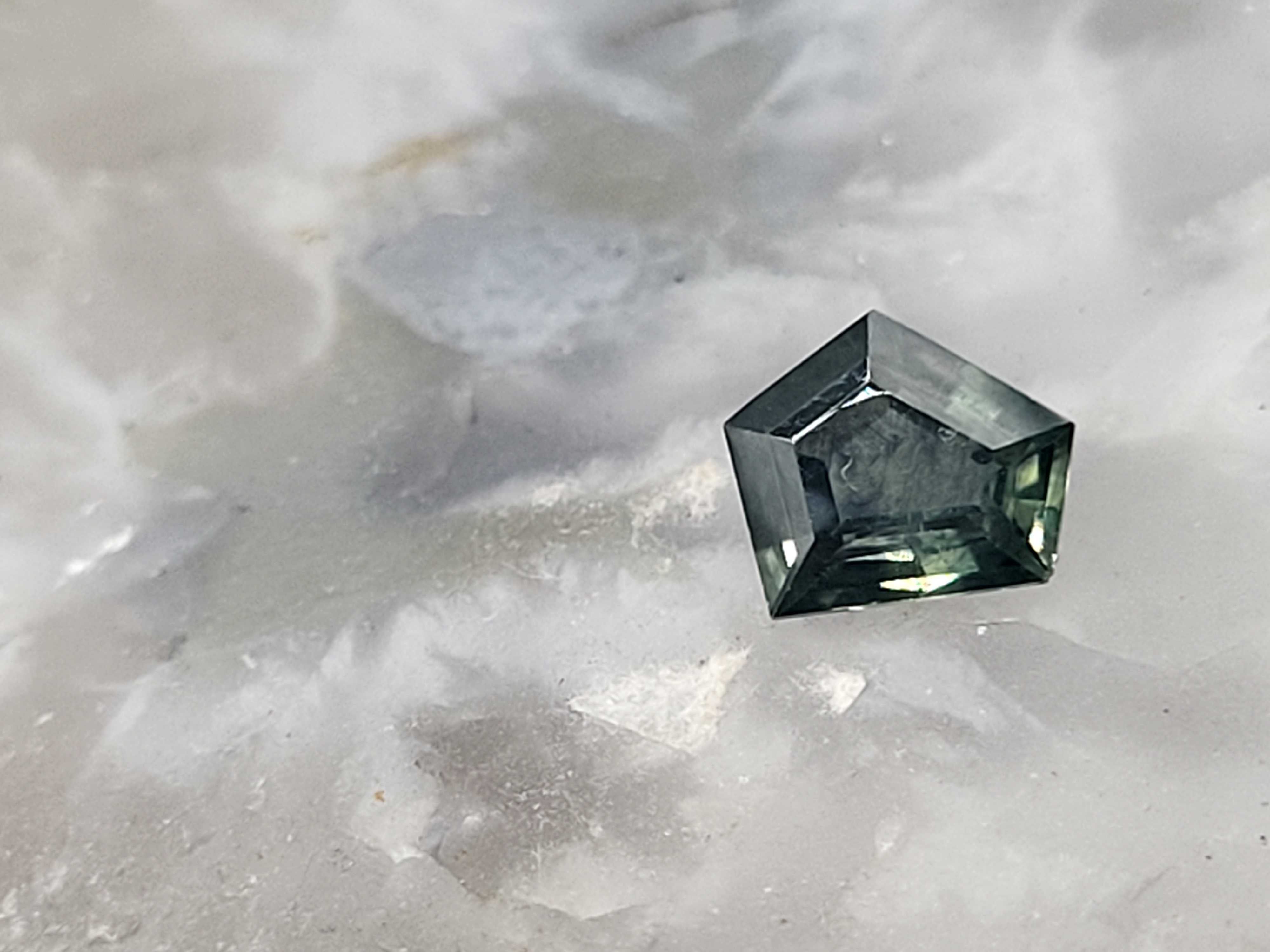 This 1.15 ct heated Montana sapphire commands attention with its bold, architectural cut—a pentagon shape that evokes a houes-like silhouette. Its blue-green hue dances across crisp facets, revealing depth and brilliance that shift with the light. This sapphire has a satisfying body, offering both visual weight and tactile presence. This gem blends precision cutting with organic intrigue, making it a standout for collectors and designers alike.AdminCode:BKmstUH-ing