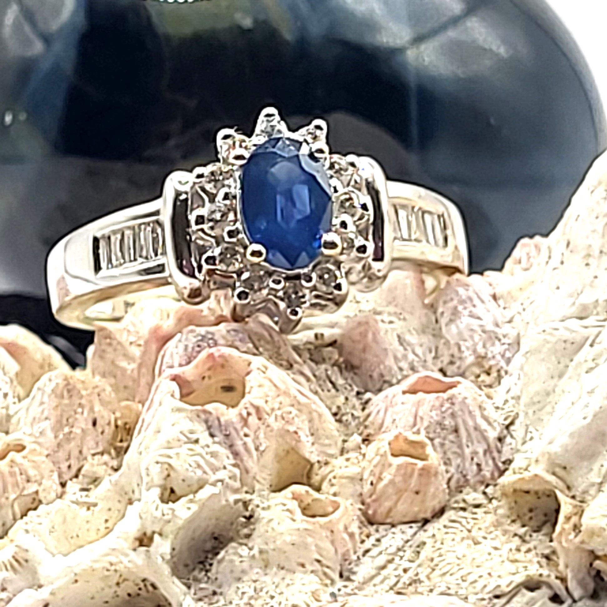 This 14 karat white gold ring features an approximate .65 carat oval-cut, genuine blue sapphire is prong-set with approximately .25 carats total weight of round, brilliant- and baguette-cut, H-I color, SI2-I1 clarity diamonds in the halo and shoulders. The channel-set shoulders are approximately 3.5mm wide and taper to an approximate 2mm shank. This ring is US size 6. Sizing options and other important information about this item are written below. 3 grams Admin: 33110/6bnn