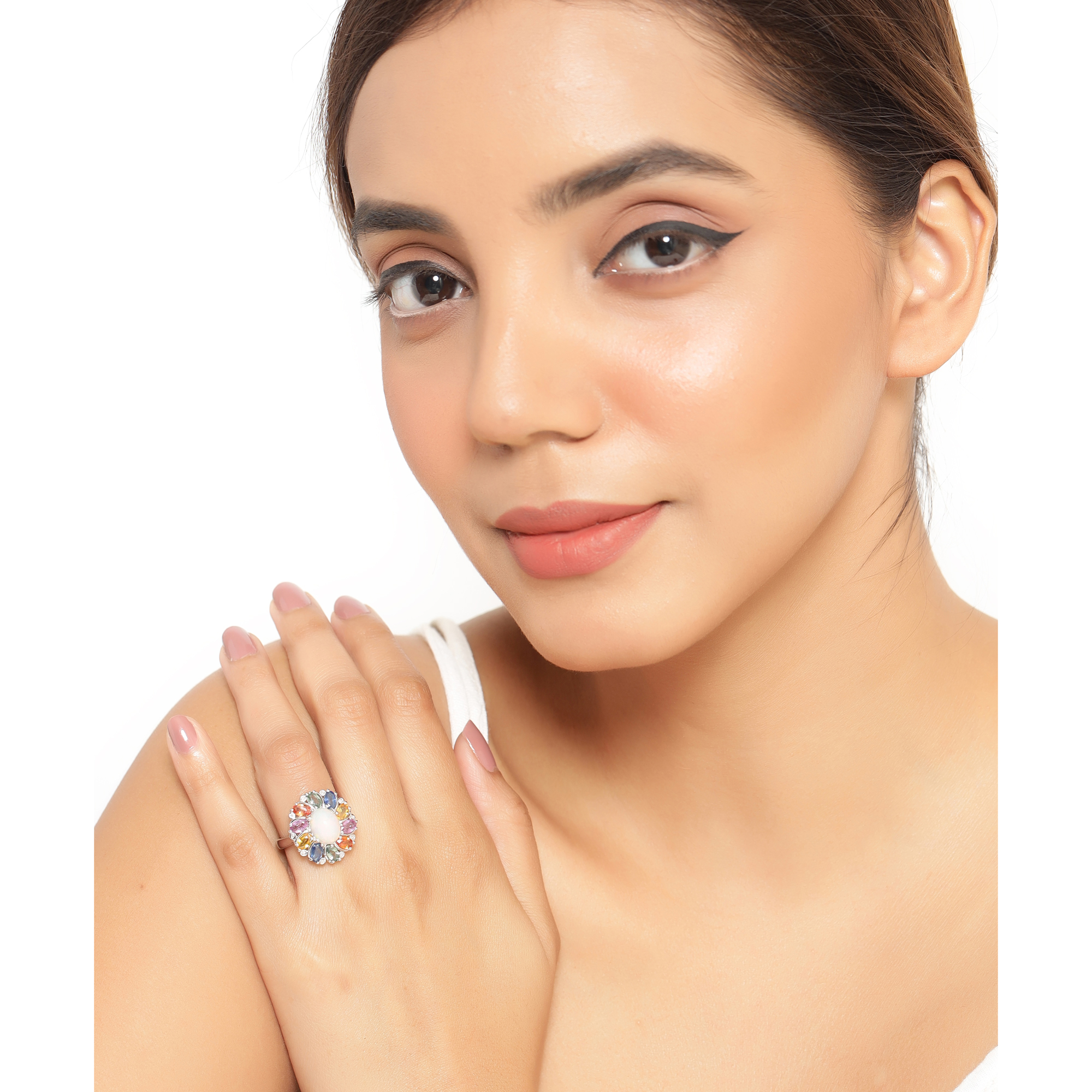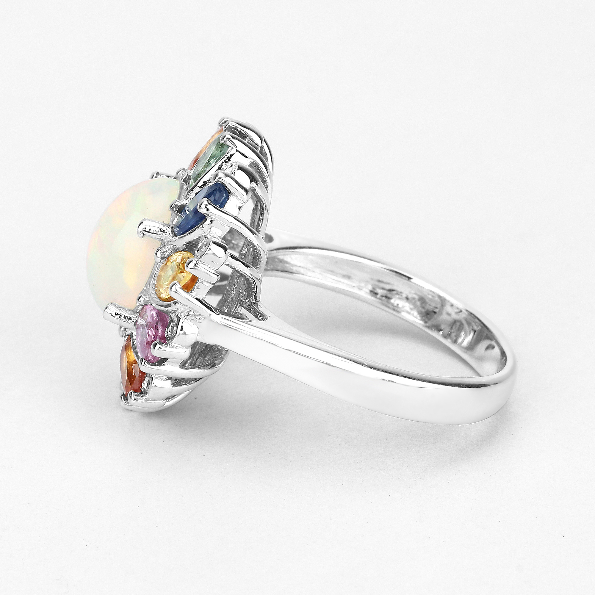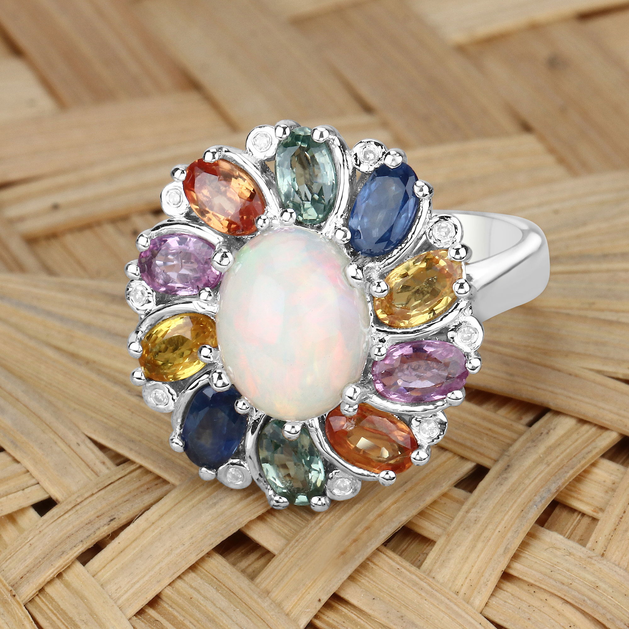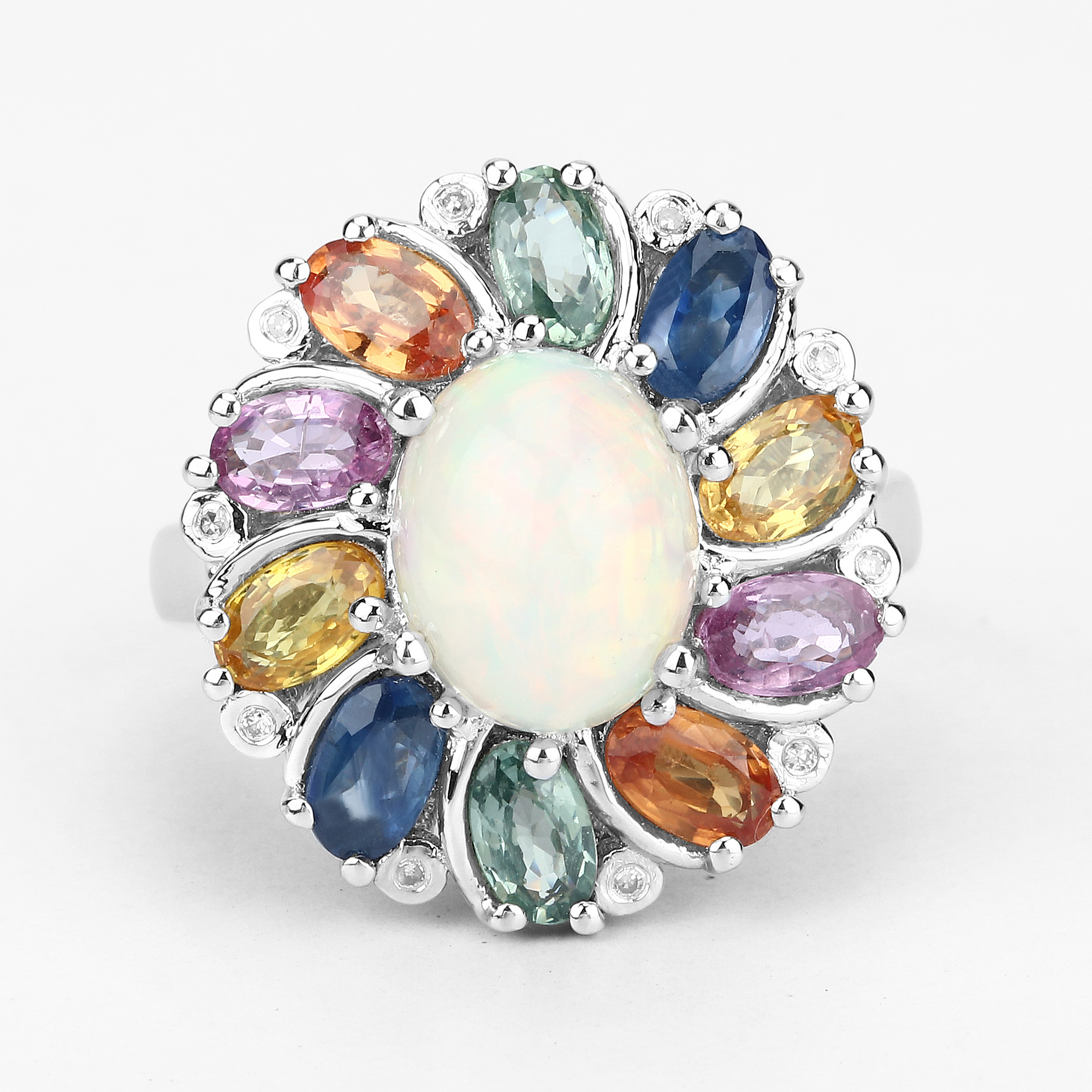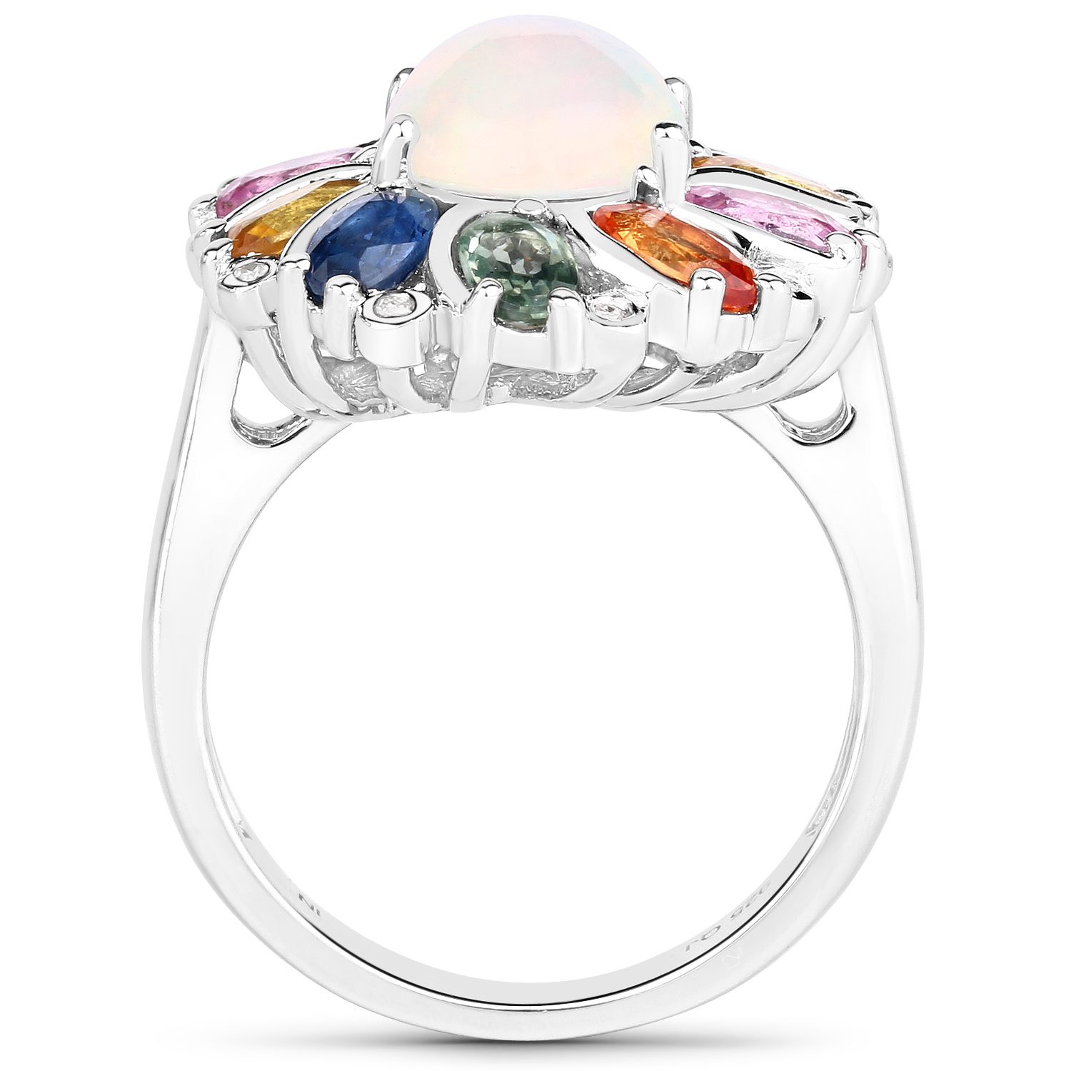 This sterling silver ring features an amazing, 1.69 carat, oval, cabochon, genuine Ethiopian opal in a colorful sapphire frame with diamond accent. The prong-set opal crackles with fire inside the colorful corundum frame made of 5x3mm, oval-cut sapphires of the following colors: blue (.44ctw), green (.44ctw), orange (.44ctw), yellow (.44ctw), and pink (.44ctw), for a total of 2.20ctw. The ring is US size 7 and has an ornate, supportive under gallery. This ring can be sized by your trusted local jeweler. See other auction information below. AdminCode: NQnis/bng