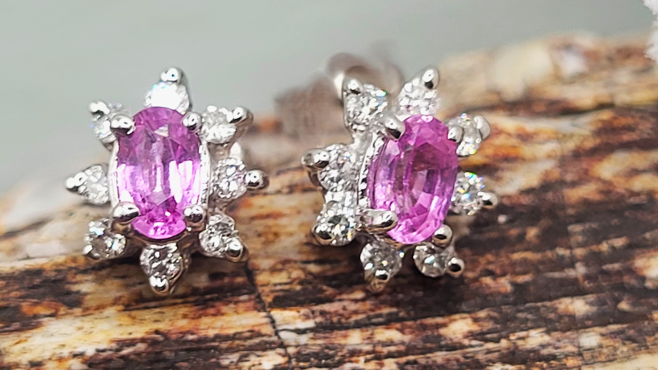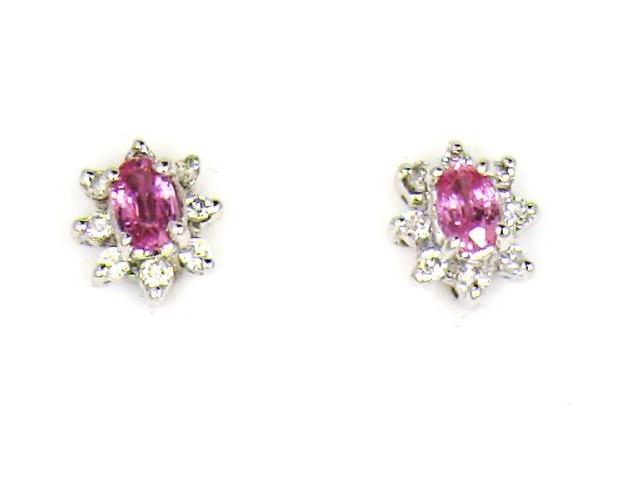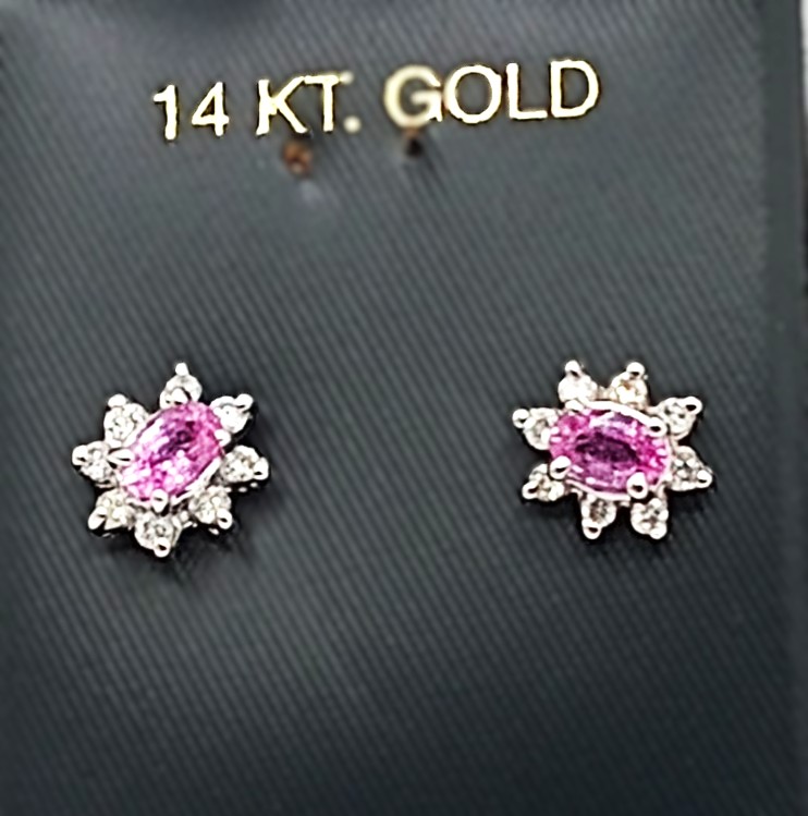 This is a pair of 14 karat white gold earrings that feature .66 carats total weight of oval-cut, prong-set, genuine pink sapphires and .27 carats of round, brilliant-cut, H, SI2-I1 clarity diamonds in the halos. Dainty demeanor with super sapphire shine! The earrings attach to the earlobe with posts and friction backs. Admin: G11241/11ior