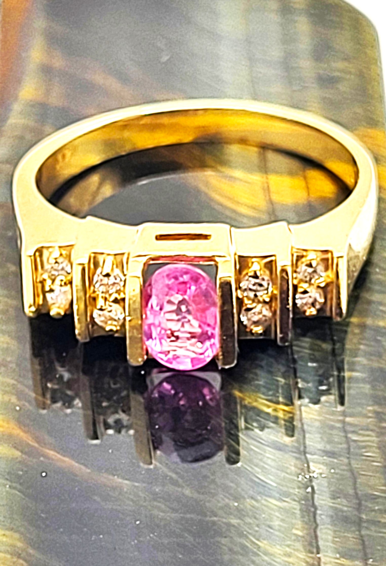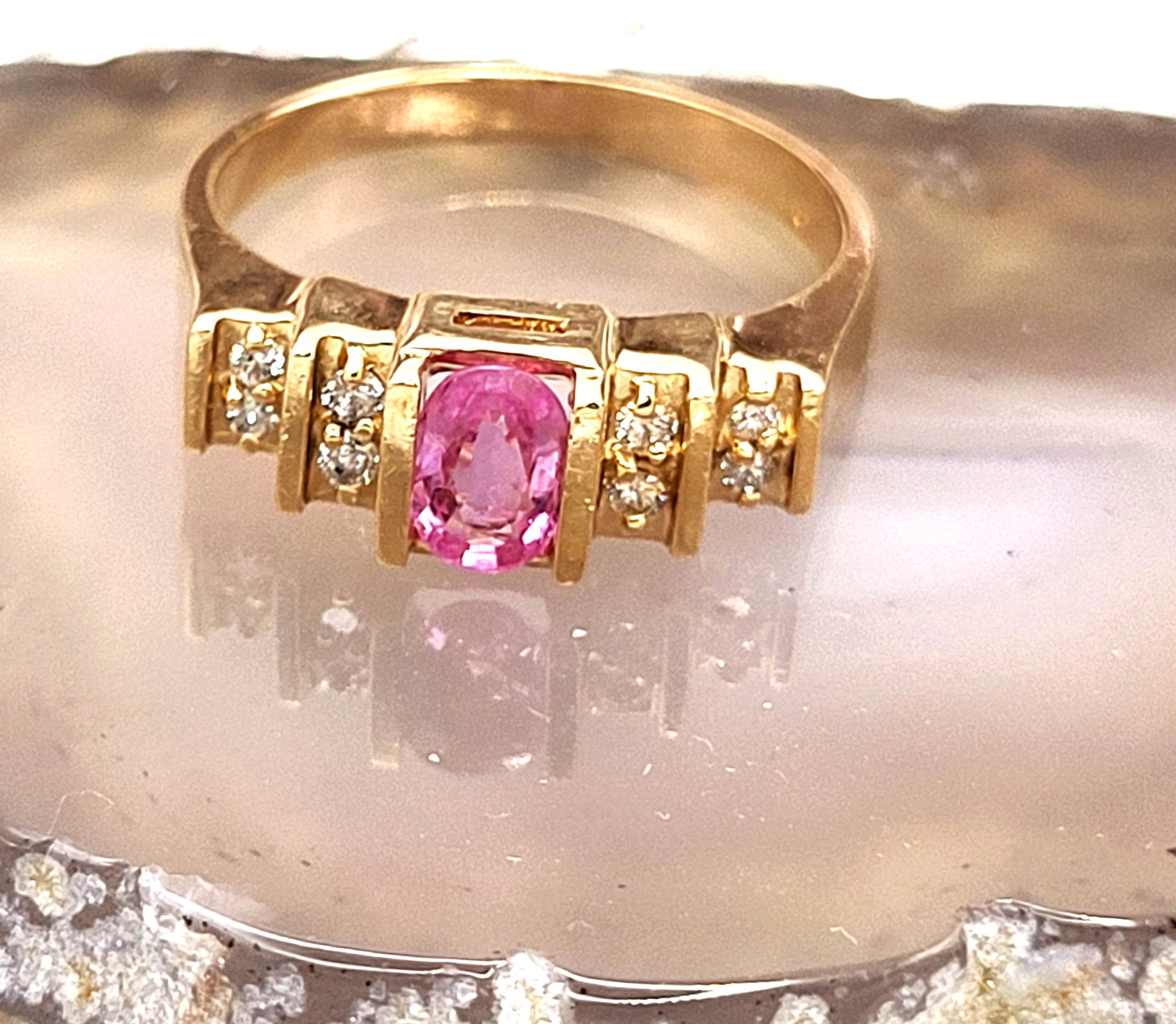 This is a 14 karat yellow gold ring that offers a tension-mounted .60 carat oval-cut, genuine pink sapphire and .16 carats of round, brilliant-cut, H-I color, SI2-I1 clarity, tension-mounted diamonds on the stepped shoulders. The ring is approximately 6.25mm wide at the top with polished shoulders that taper to the shank. The ring is US size 7.5, sizing details are listed below. 4.15g Admin: G11241/8itt